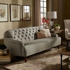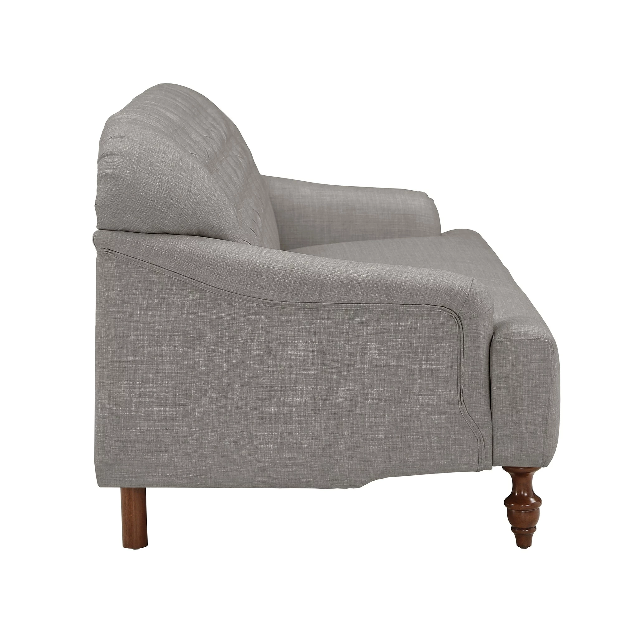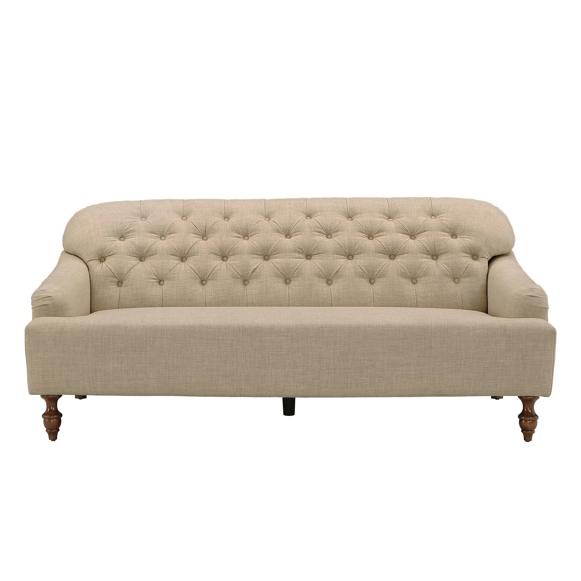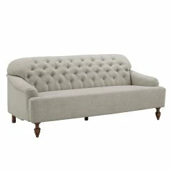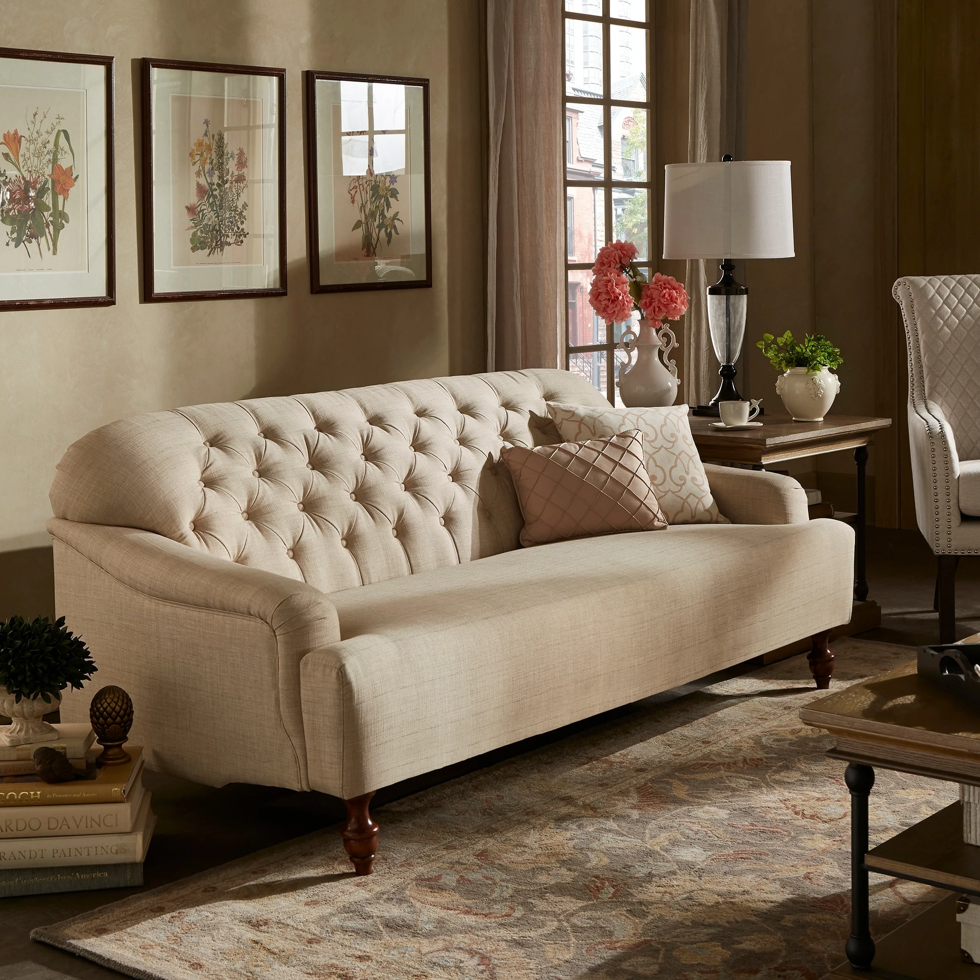 Elevate your living space with some sophistication and class with the Alice Walnut Finish Linen Chesterfield Sofa from iNSPIRE Q Classic. Delicate diamond-tufting graces the plush back as gentle curves create a time-honored silhouette. Founded on beautiful decorative legs, this sofa is crafted with hardwood for lasting strength and dependability. The padded cushions are filled with foam that distributes weight evenly and wrapped in a soft linen for added comfort.