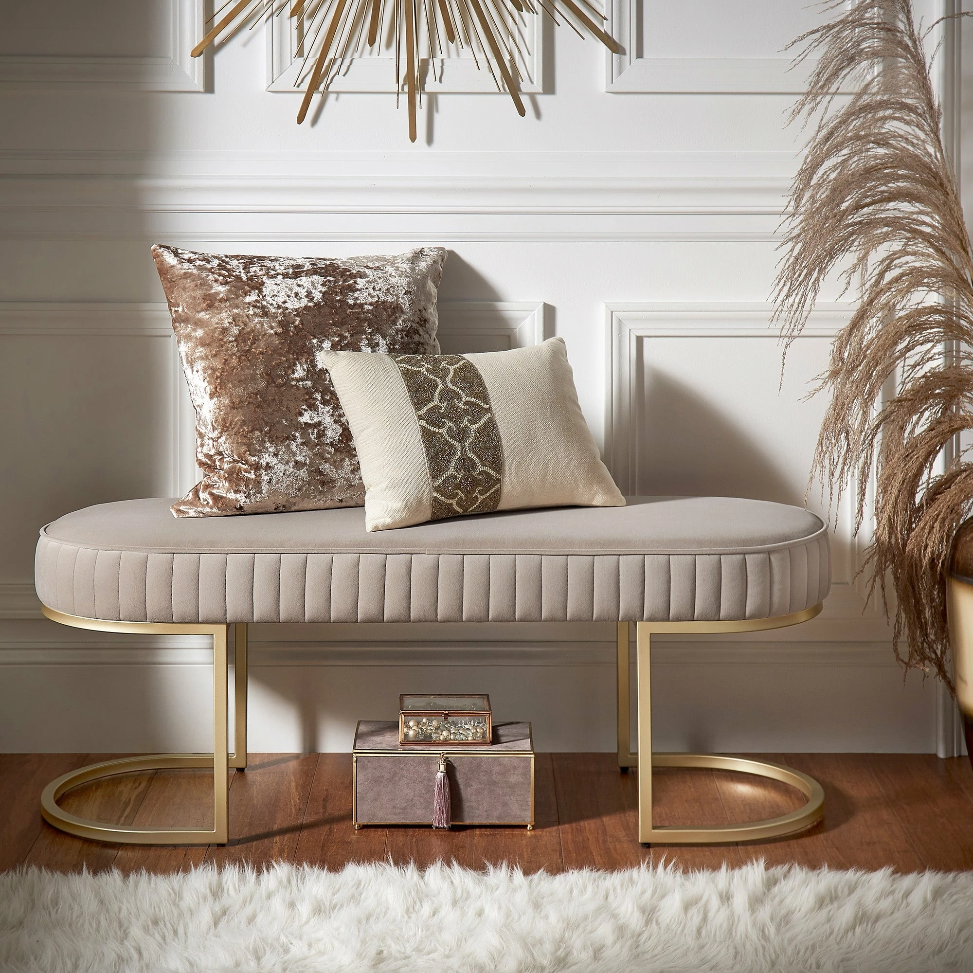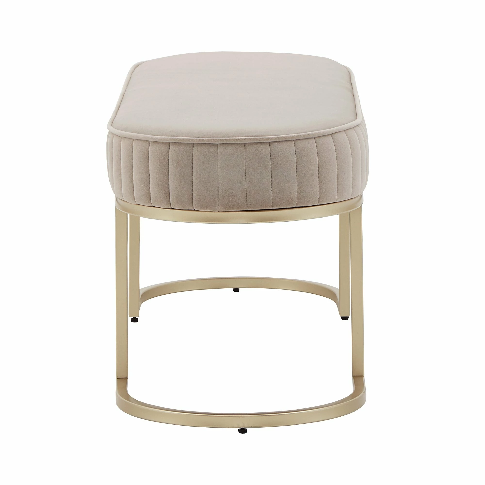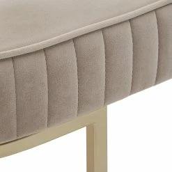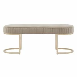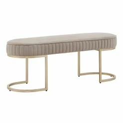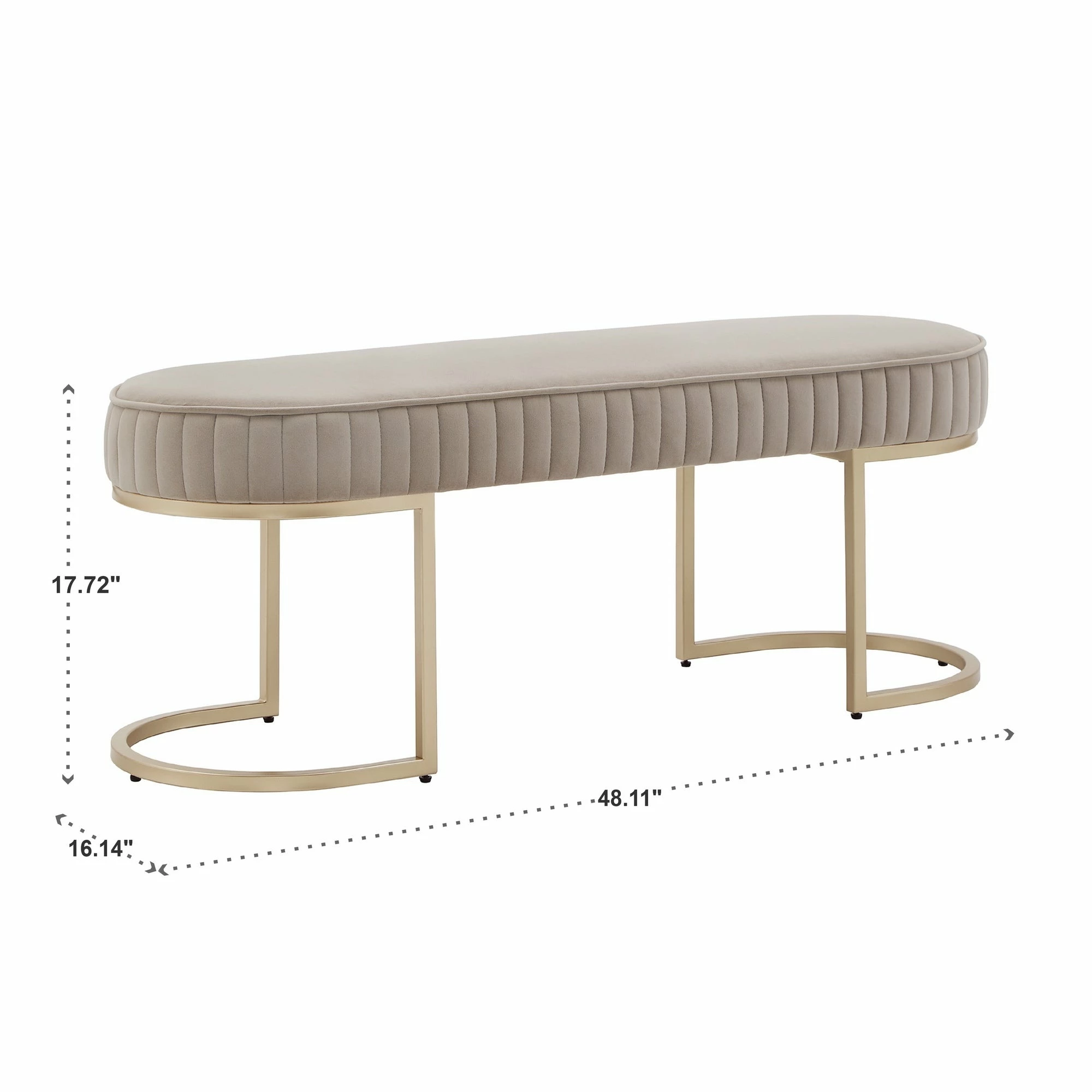 The contemporary design of this upholstered bench provides a chic look to your home. The channel tufting detail brings a visually exciting finish, and the curved ends provide extra seating with a modern look that can fit into any room: bedroom, living room, dining room, or entryway. This beautiful piece blends with a variety of décor, adding class and comfort to any space in your family room or den. The unique oval-shaped seat top is elegantly complemented by its matte metal half-round leg, which increases its durability, stability, and strength. This backless design creates a clean, modern feel.
