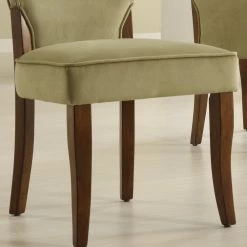 Complement your dining decor with sophistication with this set of Andorra velvet dining chairs from iNSPIRE Q® Classic. Experience the durability the Asian rubberwood gives these two dining chairs. With their high backs adding support and style and their flared chair legs, they make impressive transitional pieces. Relax in velvety comfort in one of these two chairs from iNSPIRE Q® Classic. Luxurious seat cushions and supple backrests make them the perfect place to enjoy a big meal or relax with a good book. The splendor of the sage green velvet against the rich brown legs allow this set to blend beautifully with your current style.