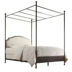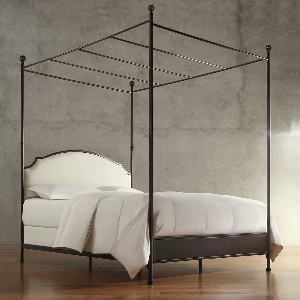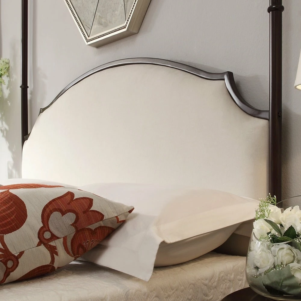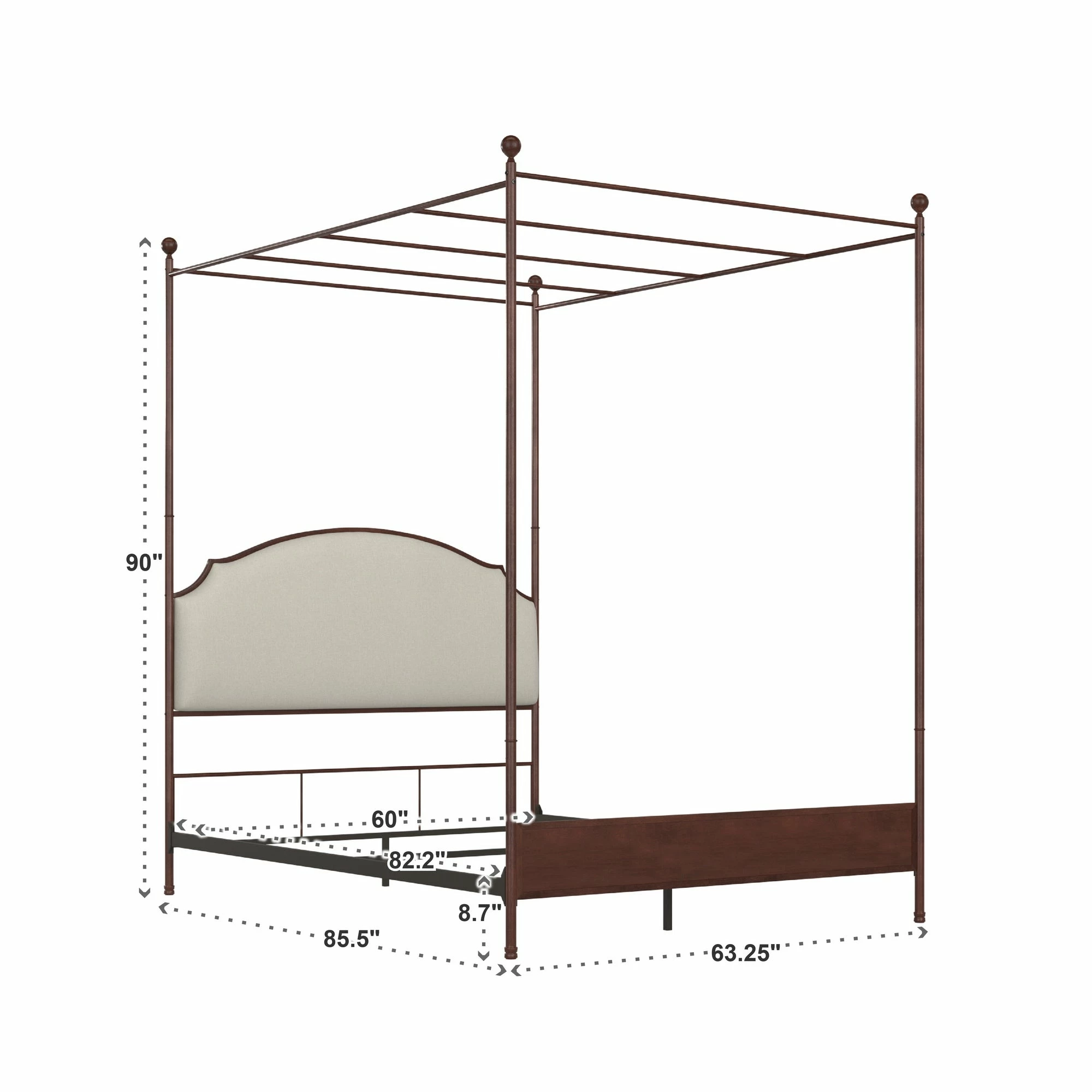 Elevate your classic bedroom decor with the Andover poster bed from iNSPIRE Q. The cherry brown metal frame features four posts, ball finials, and a curved headboard with cream-colored linen upholstery. Choose from four sizes to fit your mattress and room.