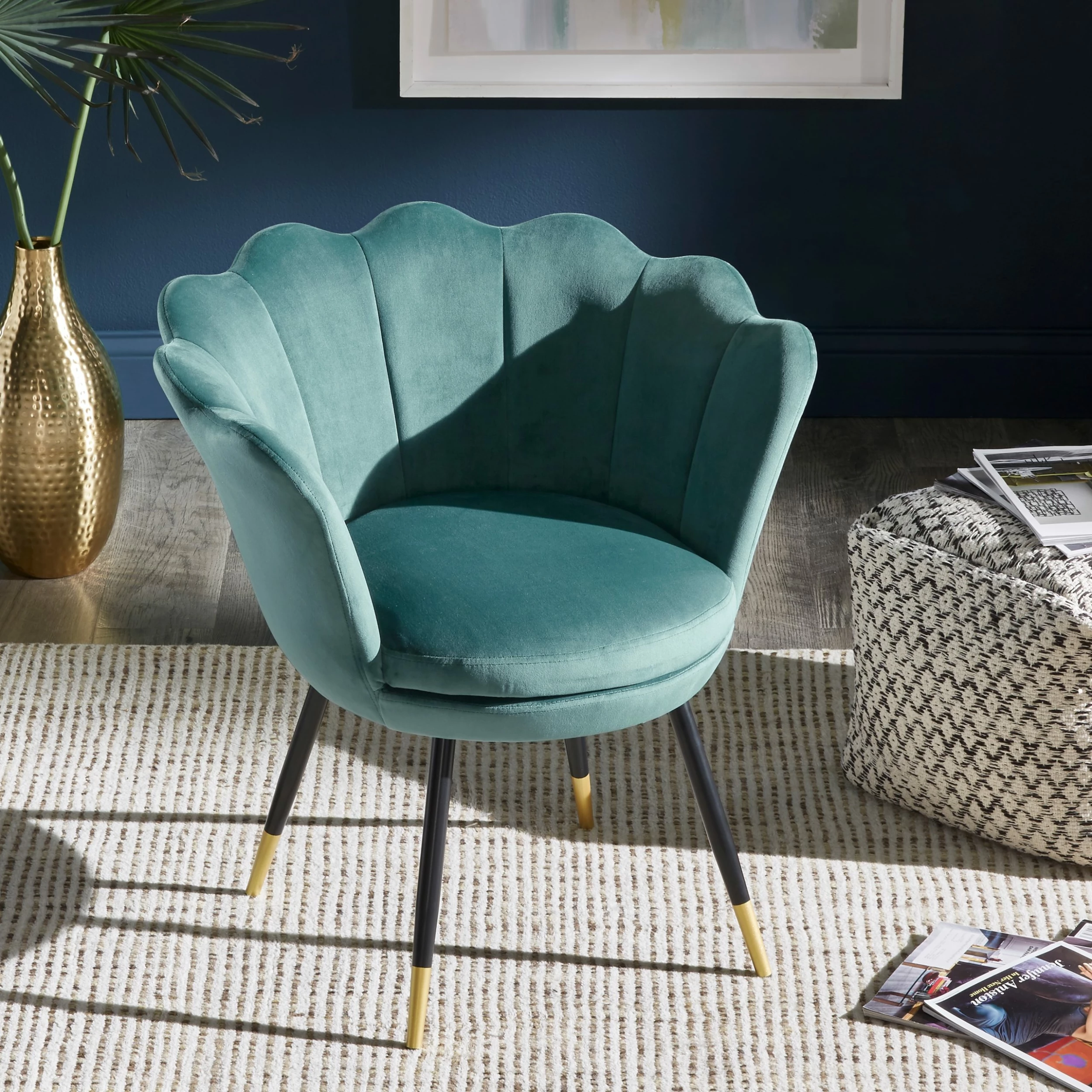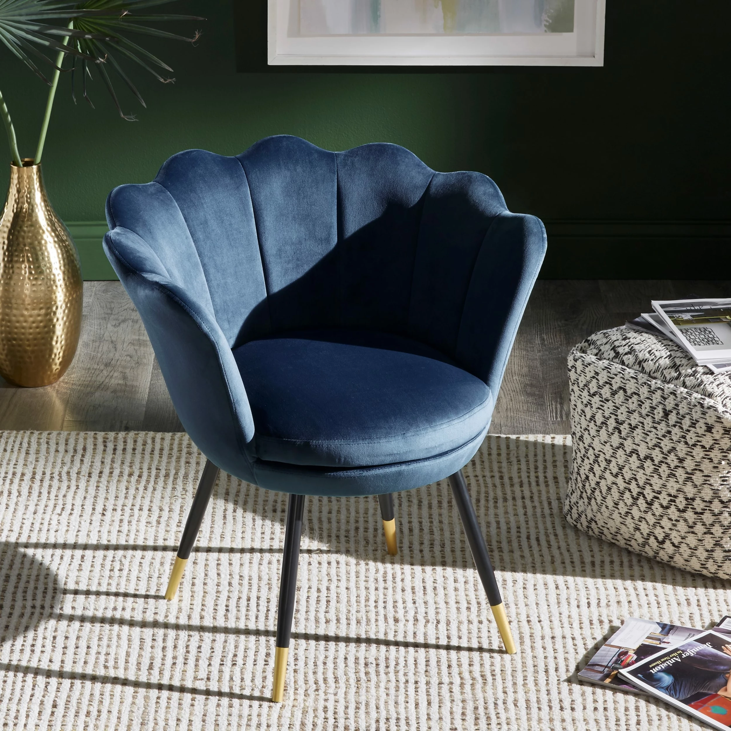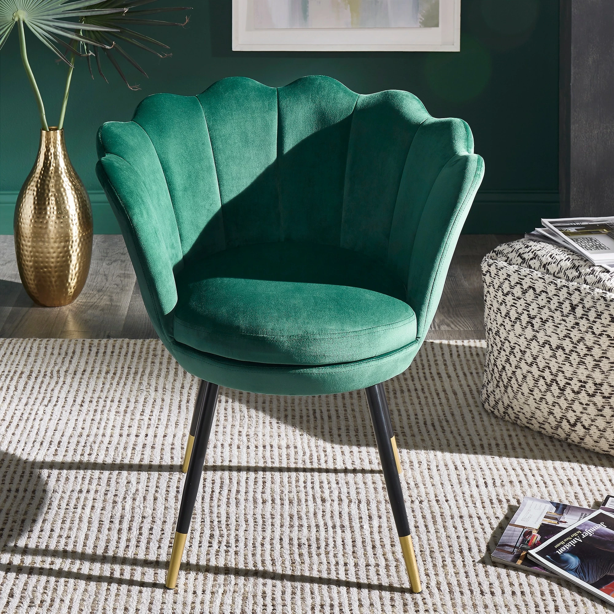 The Angela Black and Gold Metal Leg Velvet Seashell Accent Chair from iNSPIRE Q Bold will have you sitting pretty in your home. This chic chair has many eye-catching features such as the graceful, seashell-shaped back, rich velvet upholstery, and stunning gold-tipped legs. Plush cushioning makes this chair as comfortable as it is stylish. A sturdy plywood and metal construction promises years of use and multiple color options are available to best suit your glamorous style.