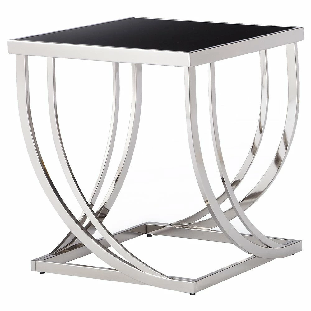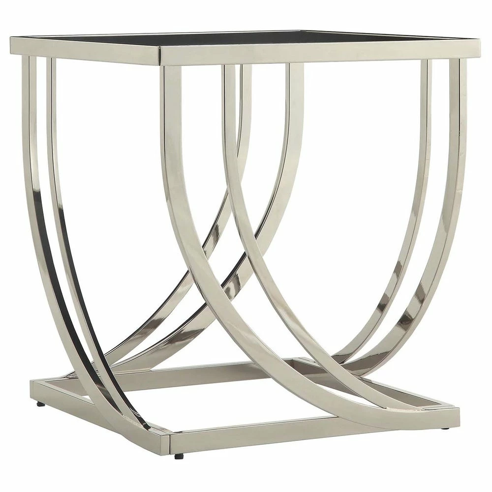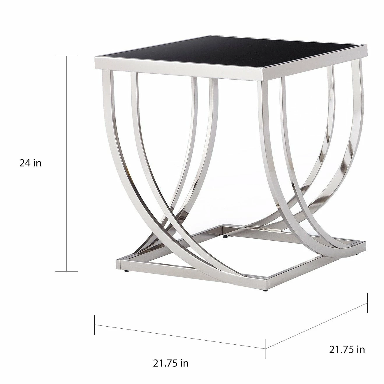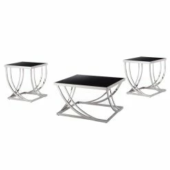 Add a modern flair to your living room with this iNSPIRE Qยฎ Bold curved modern three-piece Anson occasional set. The ultra sleek curves of the brushed nickel legs contrast wonderfully with the black tempered glass top. These tables look just as beautiful on a designer rug as they do on hardwood flooring and complement both dark and bright aesthetics.