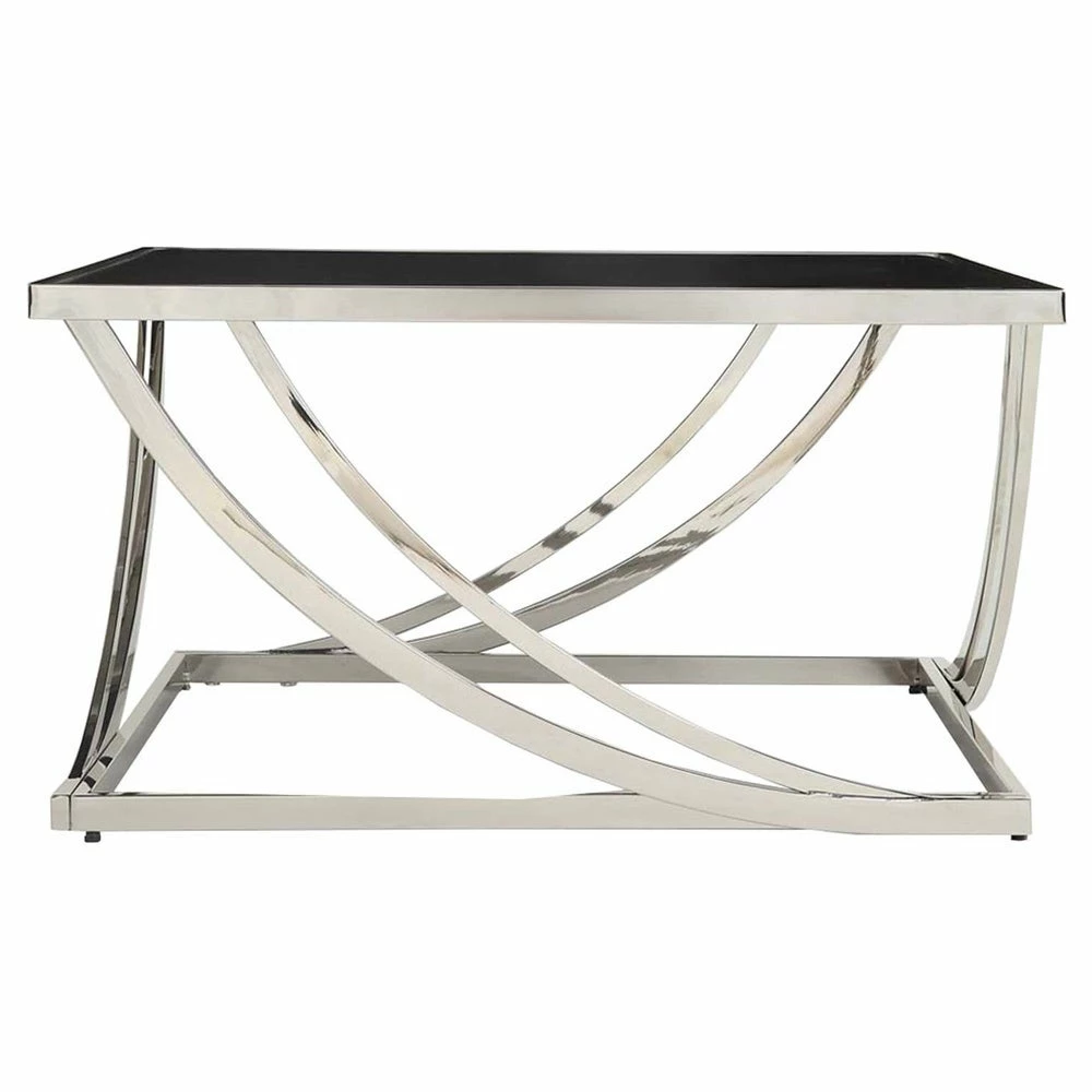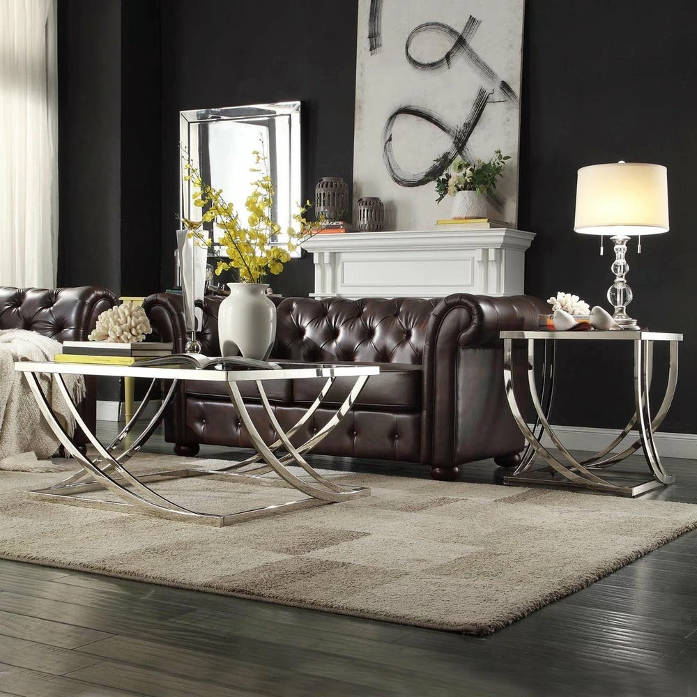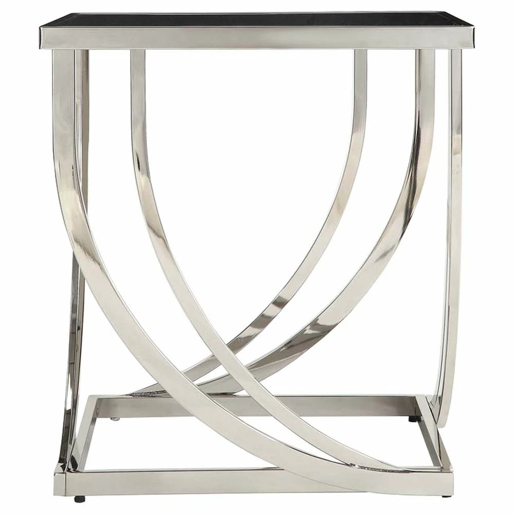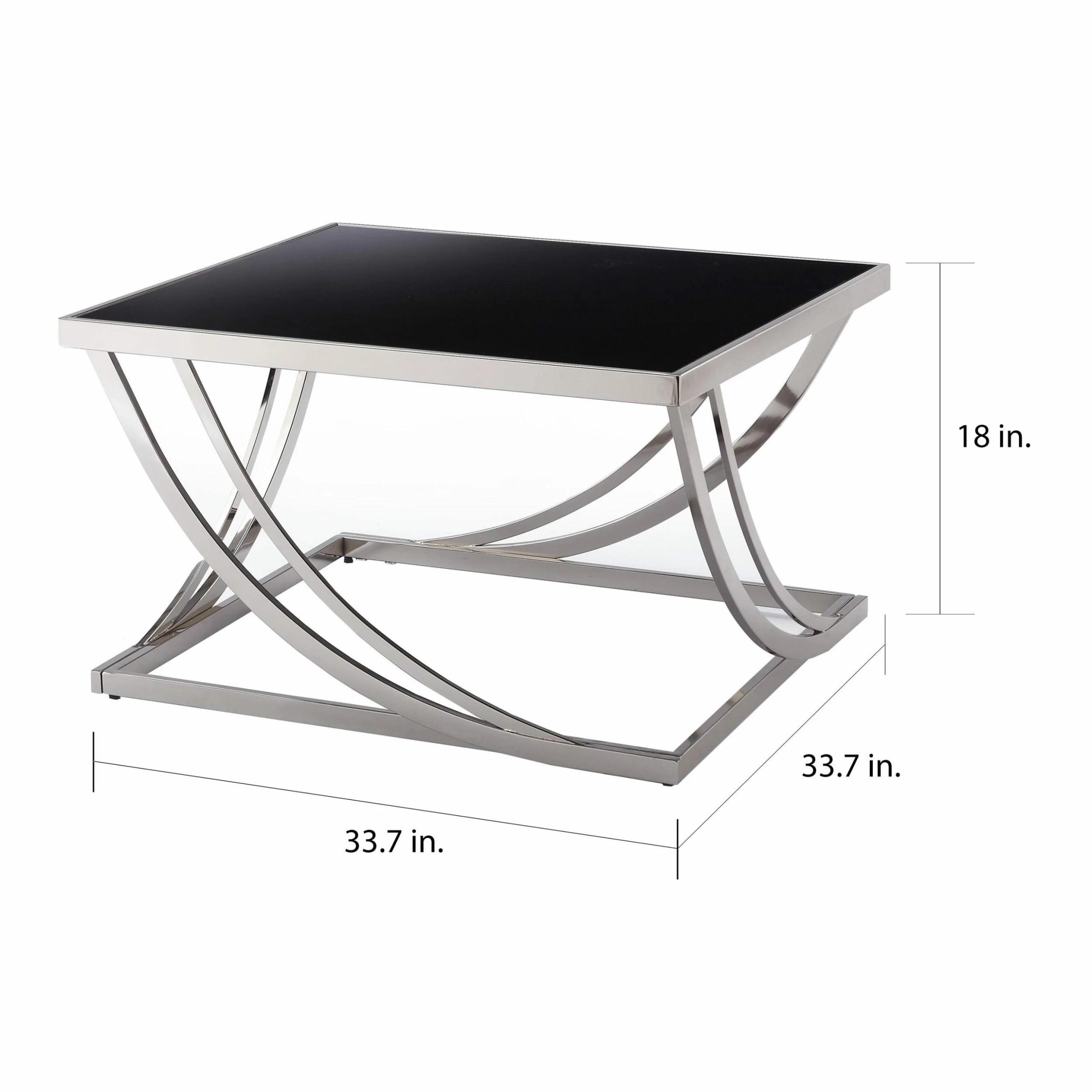 Add a modern flair to your living room with this iNSPIRE Qยฎ Bold curved modern three-piece Anson occasional set. The ultra sleek curves of the brushed nickel legs contrast wonderfully with the black tempered glass top. These tables look just as beautiful on a designer rug as they do on hardwood flooring and complement both dark and bright aesthetics.