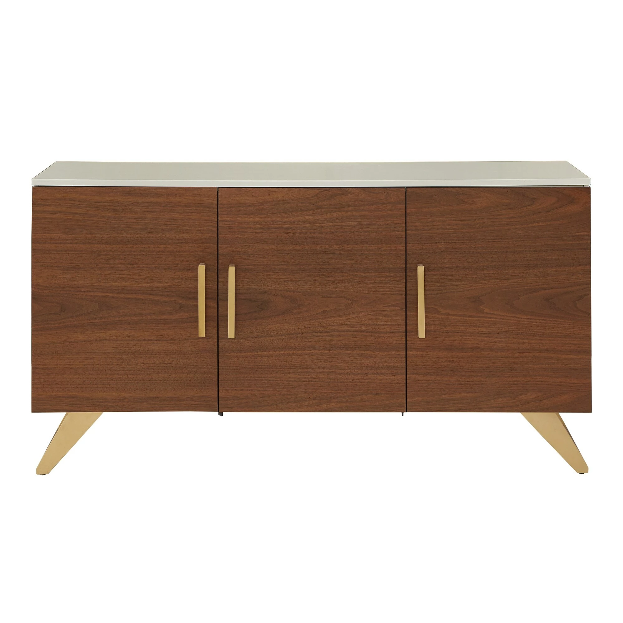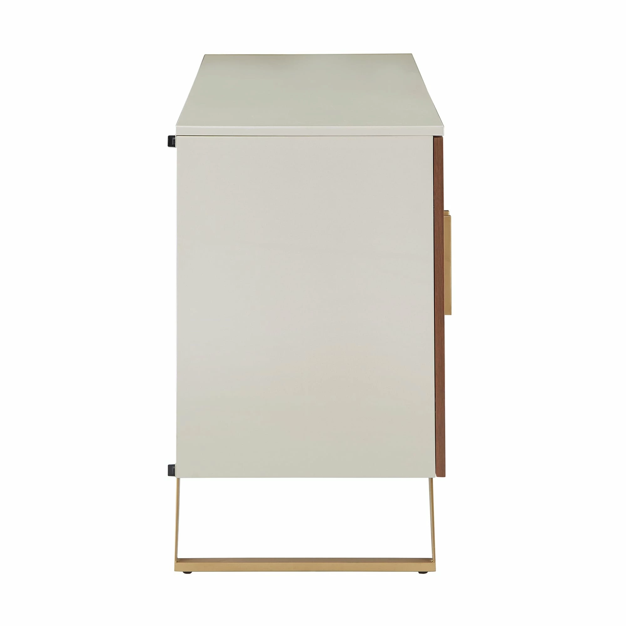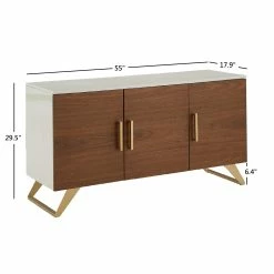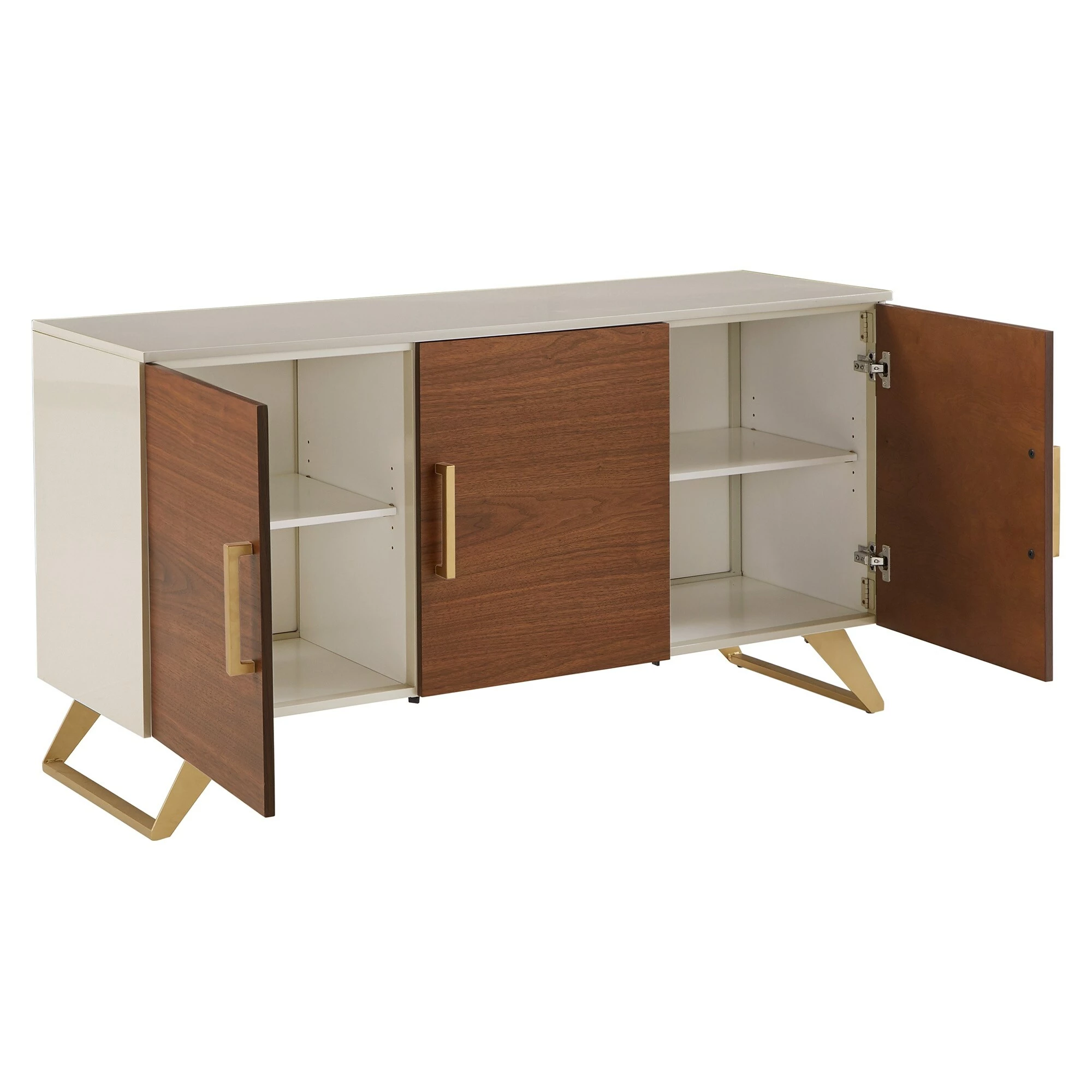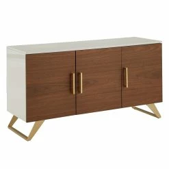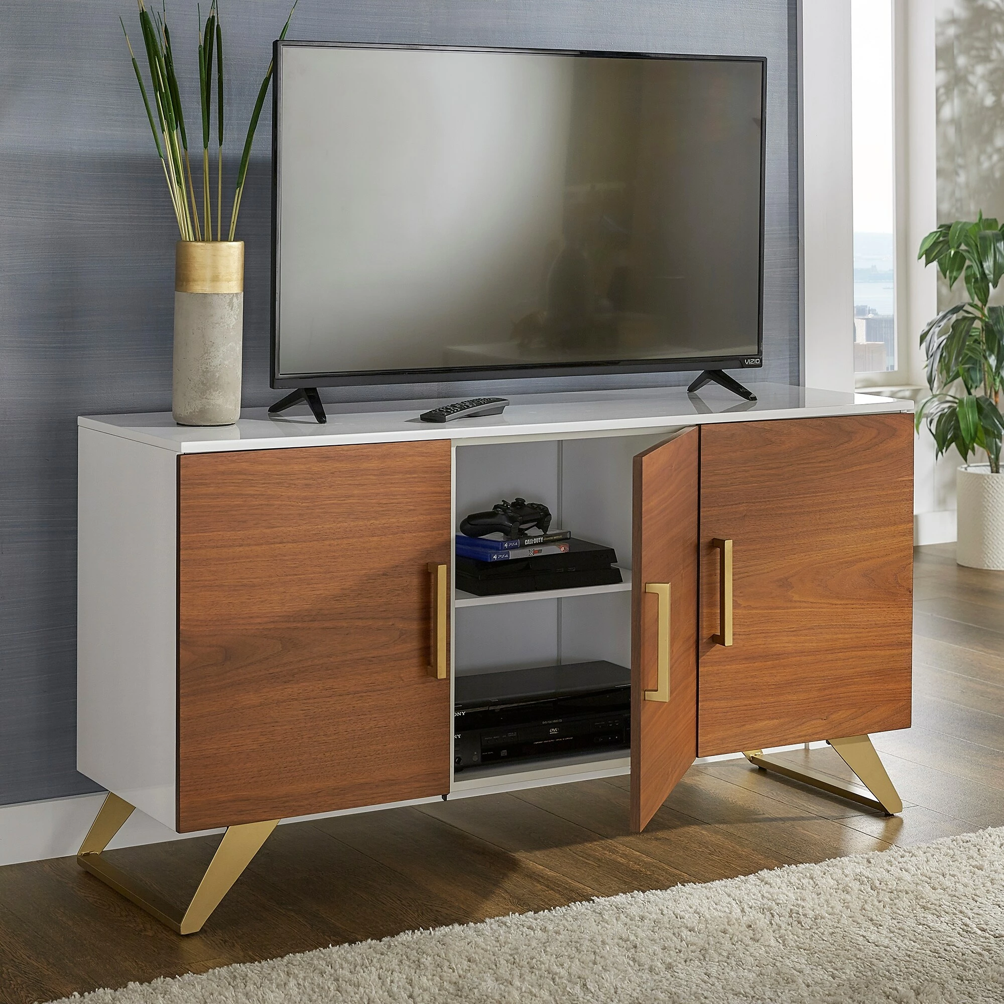 Set your TV up on the Archer Two-Tone High Gloss White and Walnut Finish 3-Door TV Stand by iNSPIRE Q Modern. This attractive TV stand features a striking two-tone finish with a high gloss glittery white finish on the frame paired with a warm walnut finish on the cabinet doors. Tying the whole piece together is gold-finished door handles and splayed legs for an extra touch of glitz and glam. Behind each of the three doors is an interior storage compartment, each one equipped with a single shelf for extra organization. Expertly crafted with MDF and metal, this multi functional piece can be used as a TV stand, console table, or buffet server.
