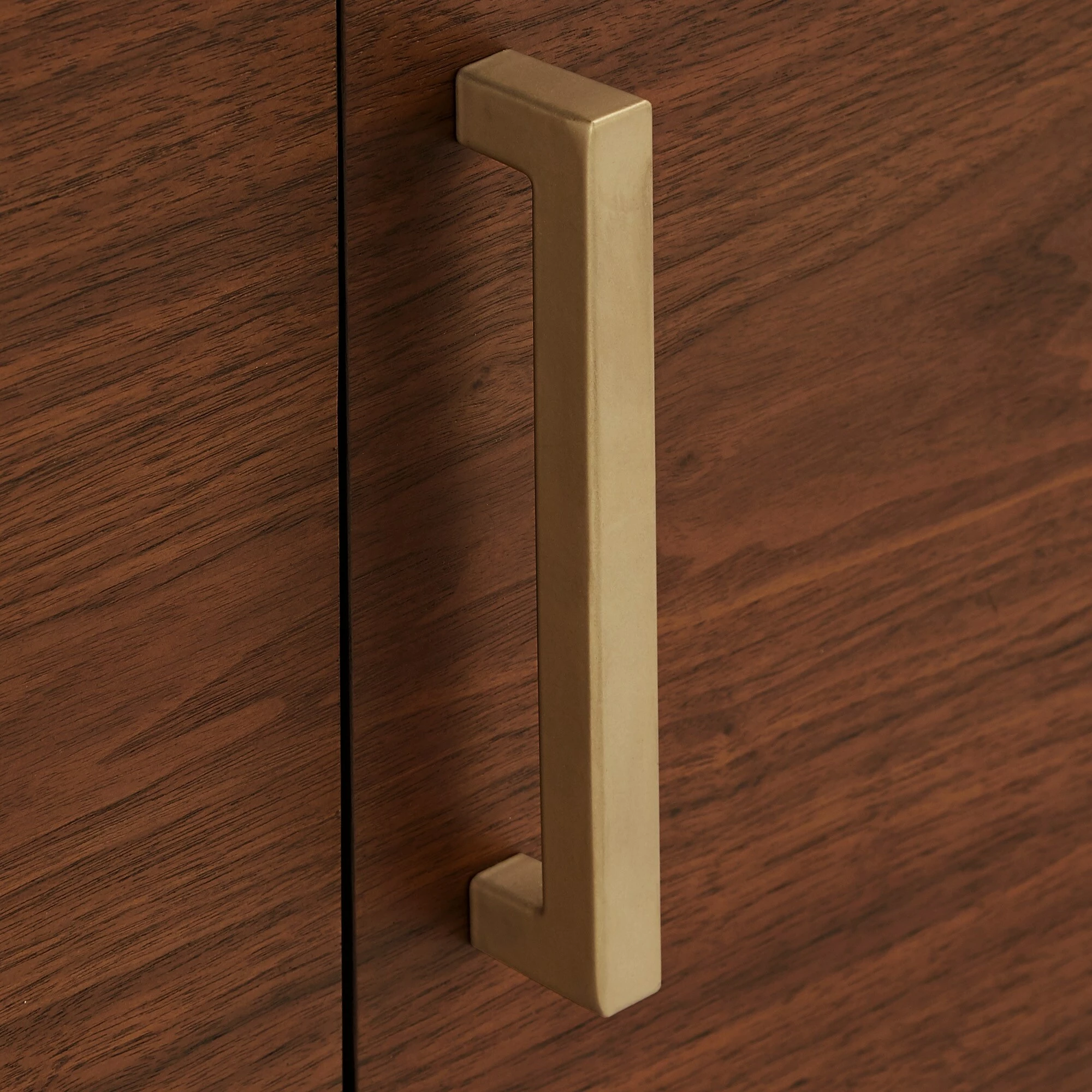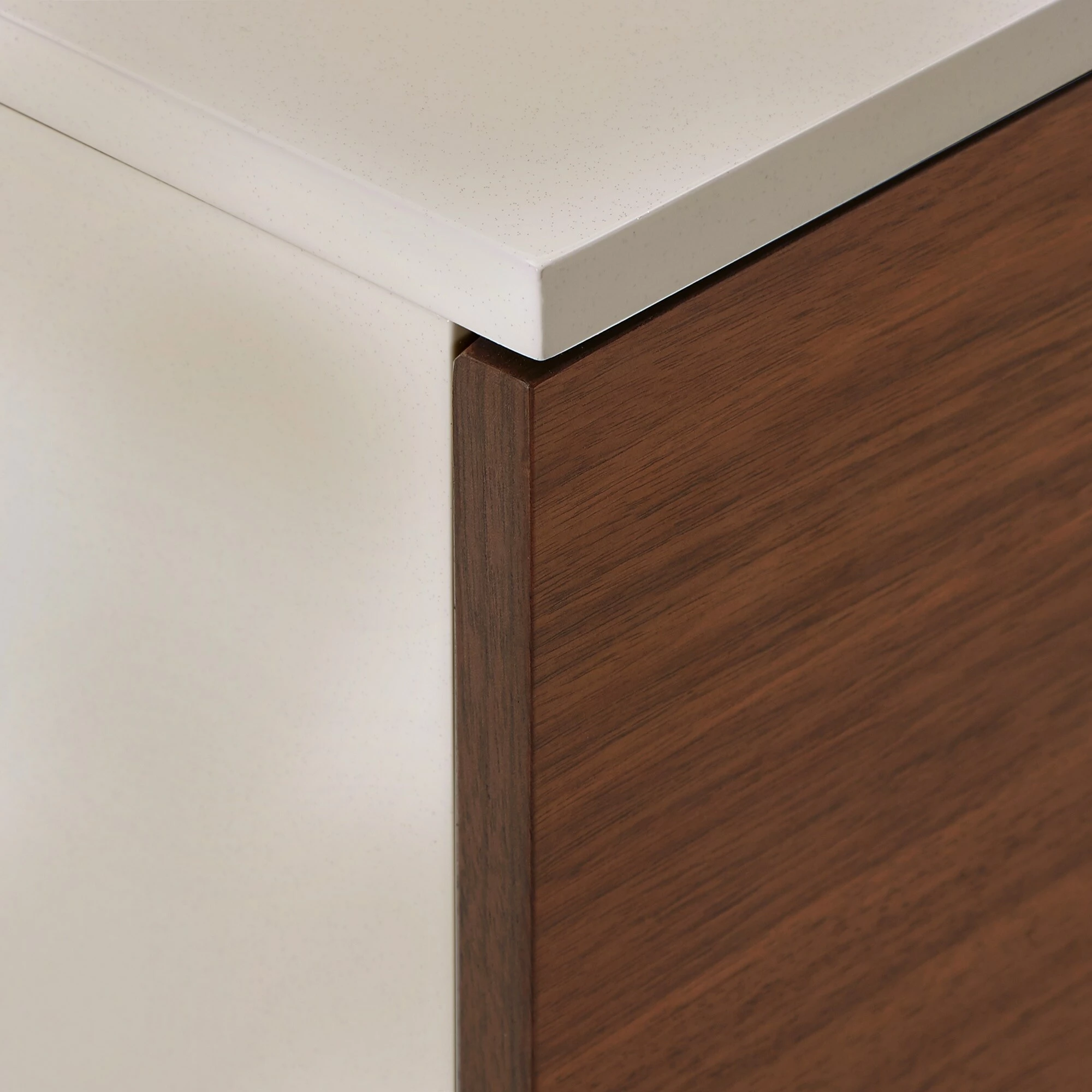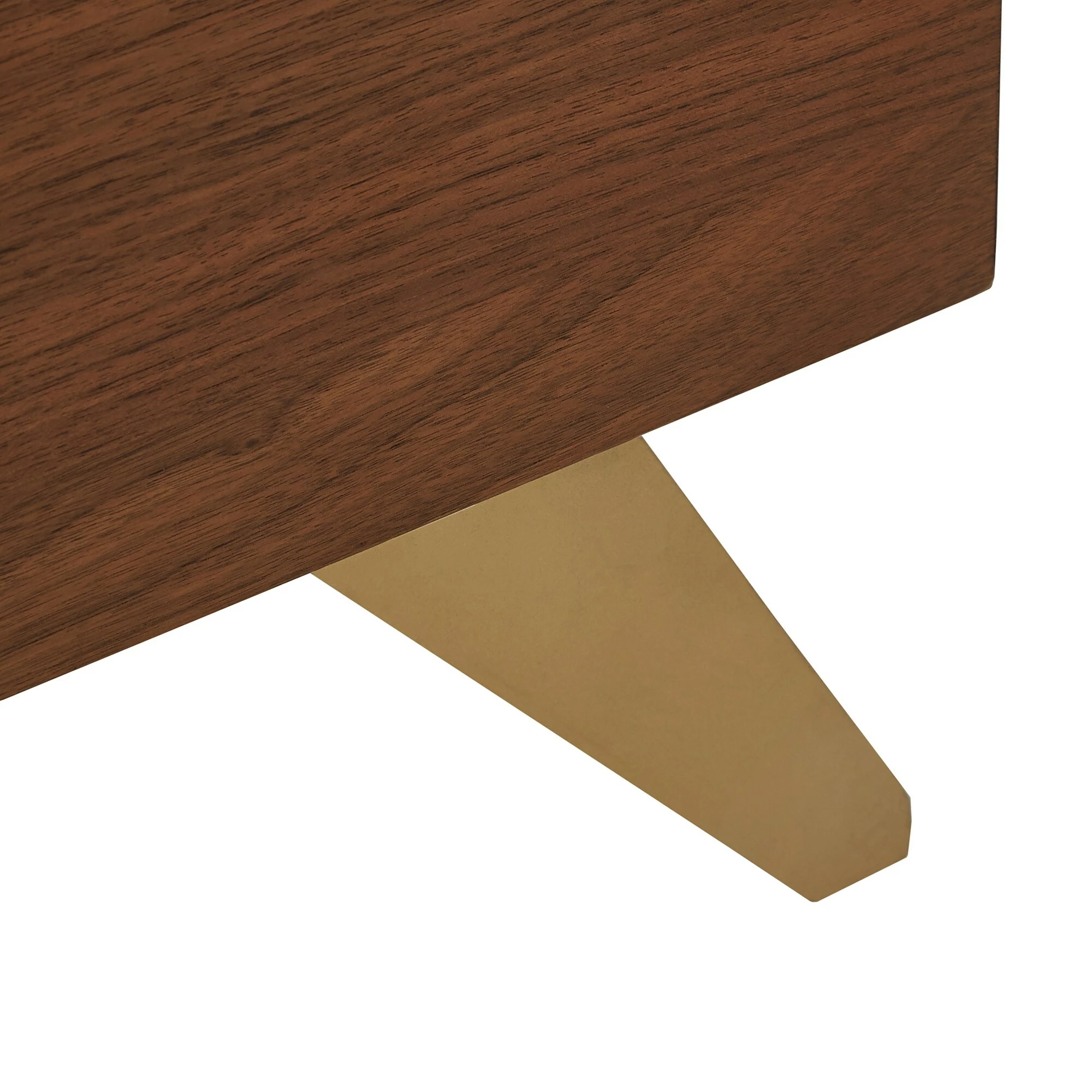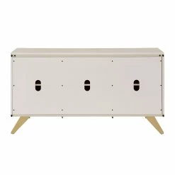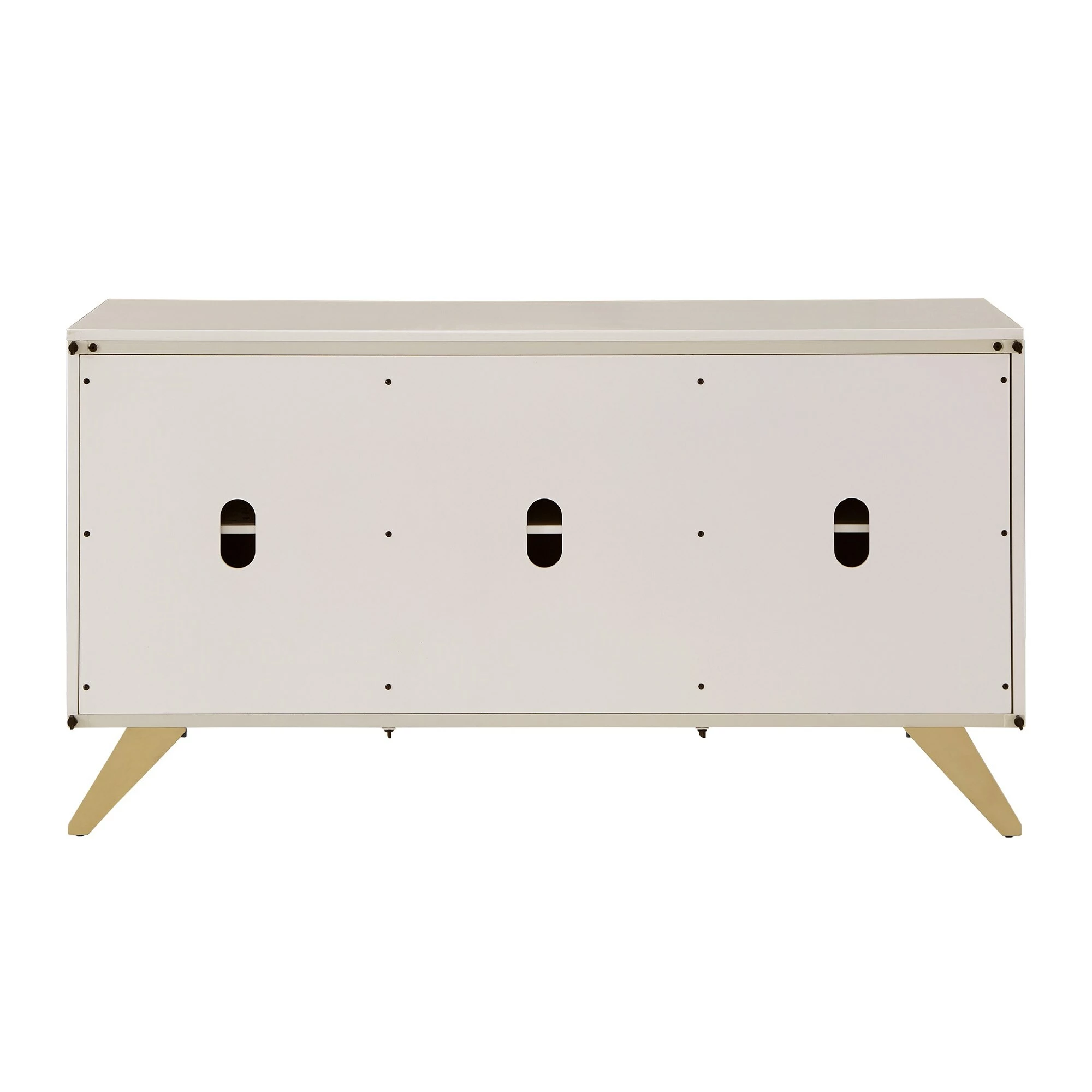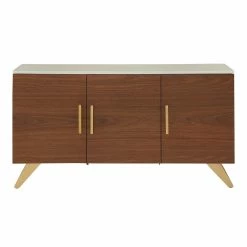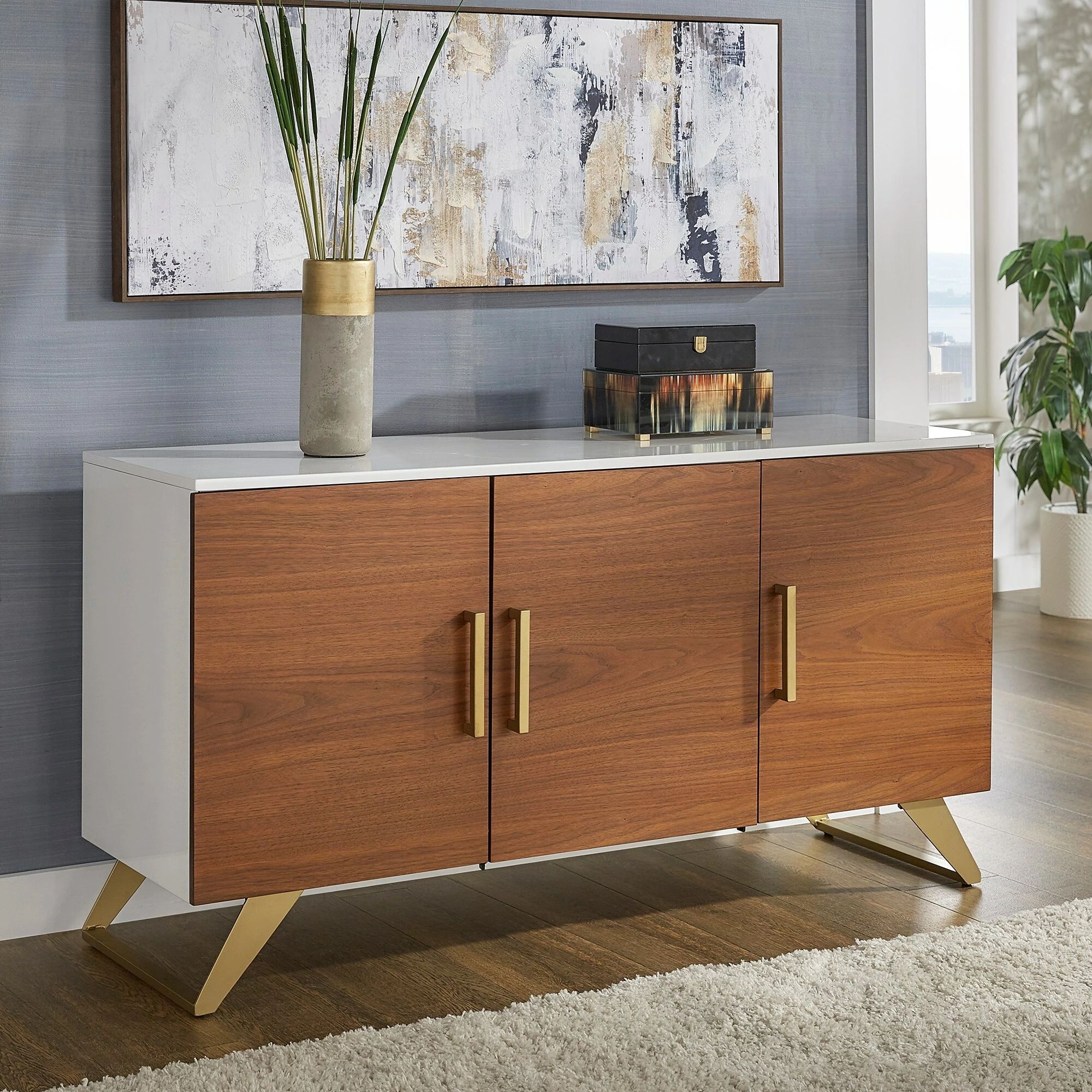 Set your TV up on the Archer Two-Tone High Gloss White and Walnut Finish 3-Door TV Stand by iNSPIRE Q Modern. This attractive TV stand features a striking two-tone finish with a high gloss glittery white finish on the frame paired with a warm walnut finish on the cabinet doors. Tying the whole piece together is gold-finished door handles and splayed legs for an extra touch of glitz and glam. Behind each of the three doors is an interior storage compartment, each one equipped with a single shelf for extra organization. Expertly crafted with MDF and metal, this multi functional piece can be used as a TV stand, console table, or buffet server.