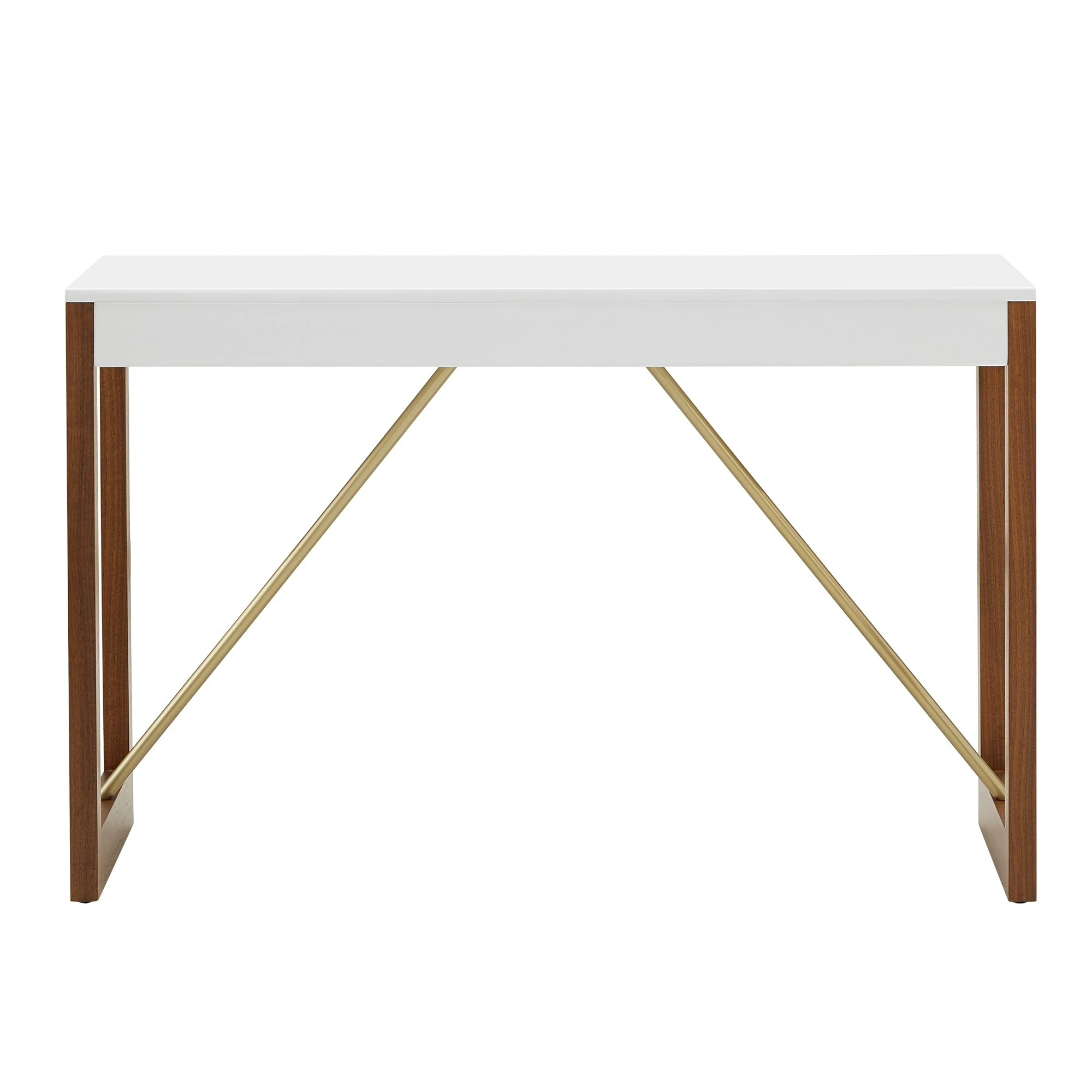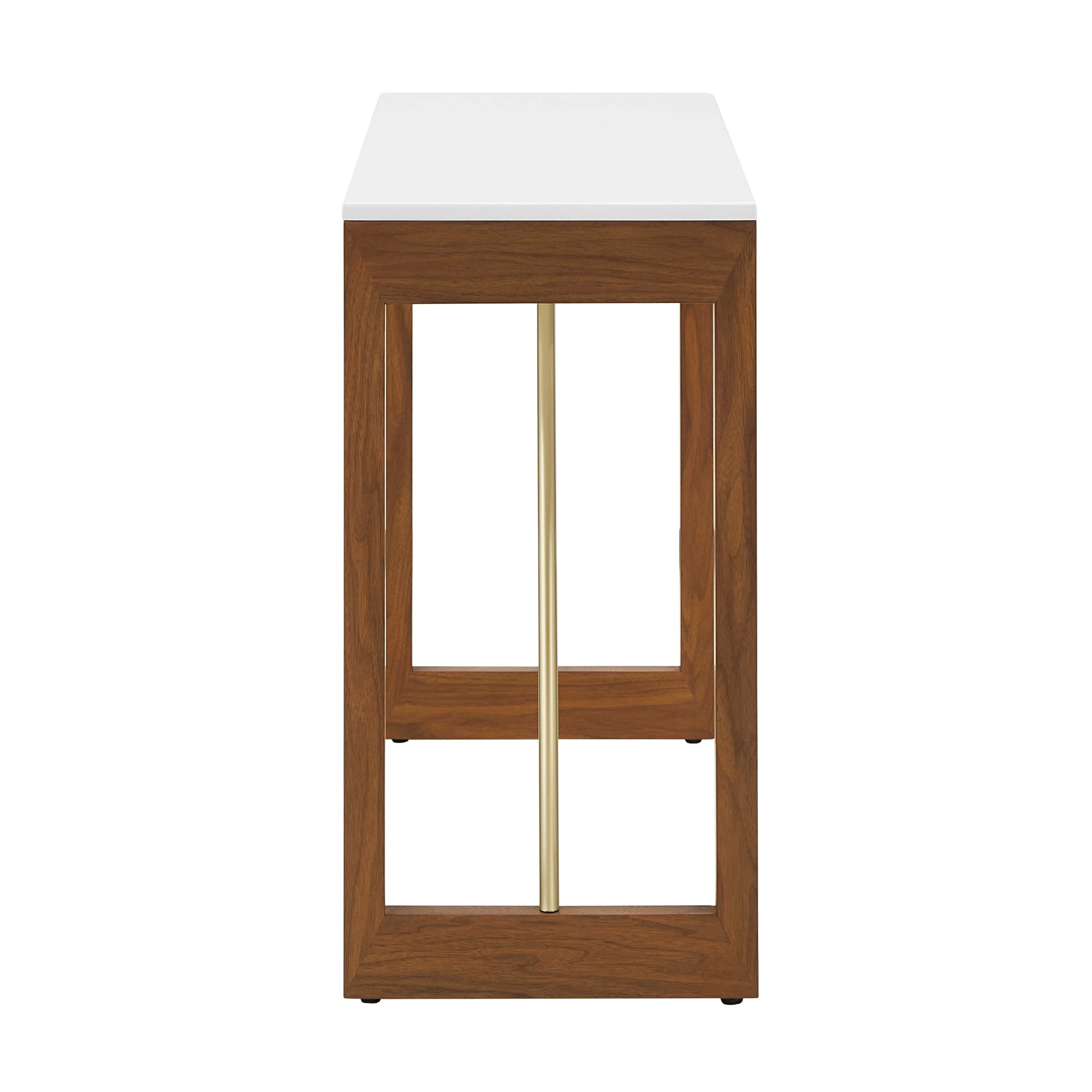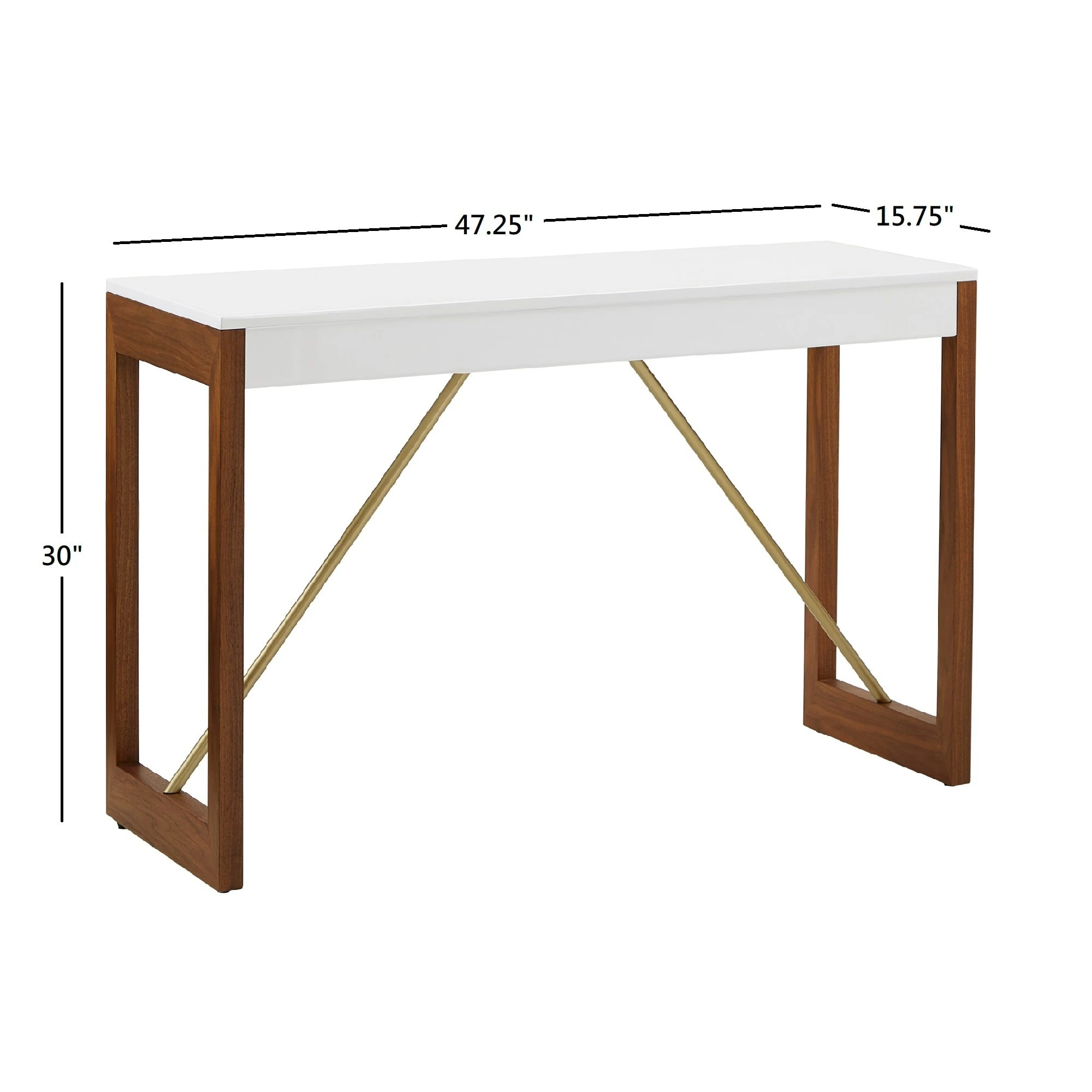 The Archer Two-Tone High Gloss White and Walnut Finish Sofa Table from iNSPIRE Q Modern updates your living space in stylish fashion. White, gold, and brown hues complement each other beautifully in this piece for an impressive look. The smooth table top is finished in a high gloss white finish that has some sparkle to it. A walnut finish accents the sides of this table, bearing a visible wood grain for a more down-to-earth aesthetic. Gold-finished metal bars complete this piece, adding clean-cut lines and a pop of glamour. Add this versatile piece to any contemporary or bold-themed space.