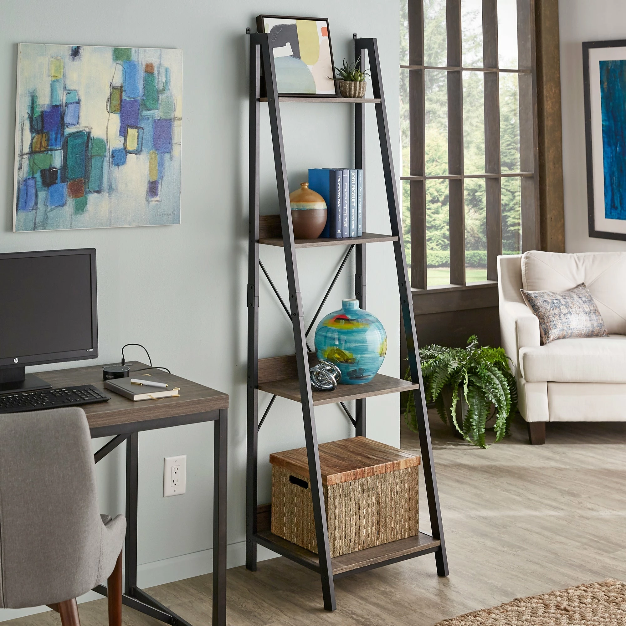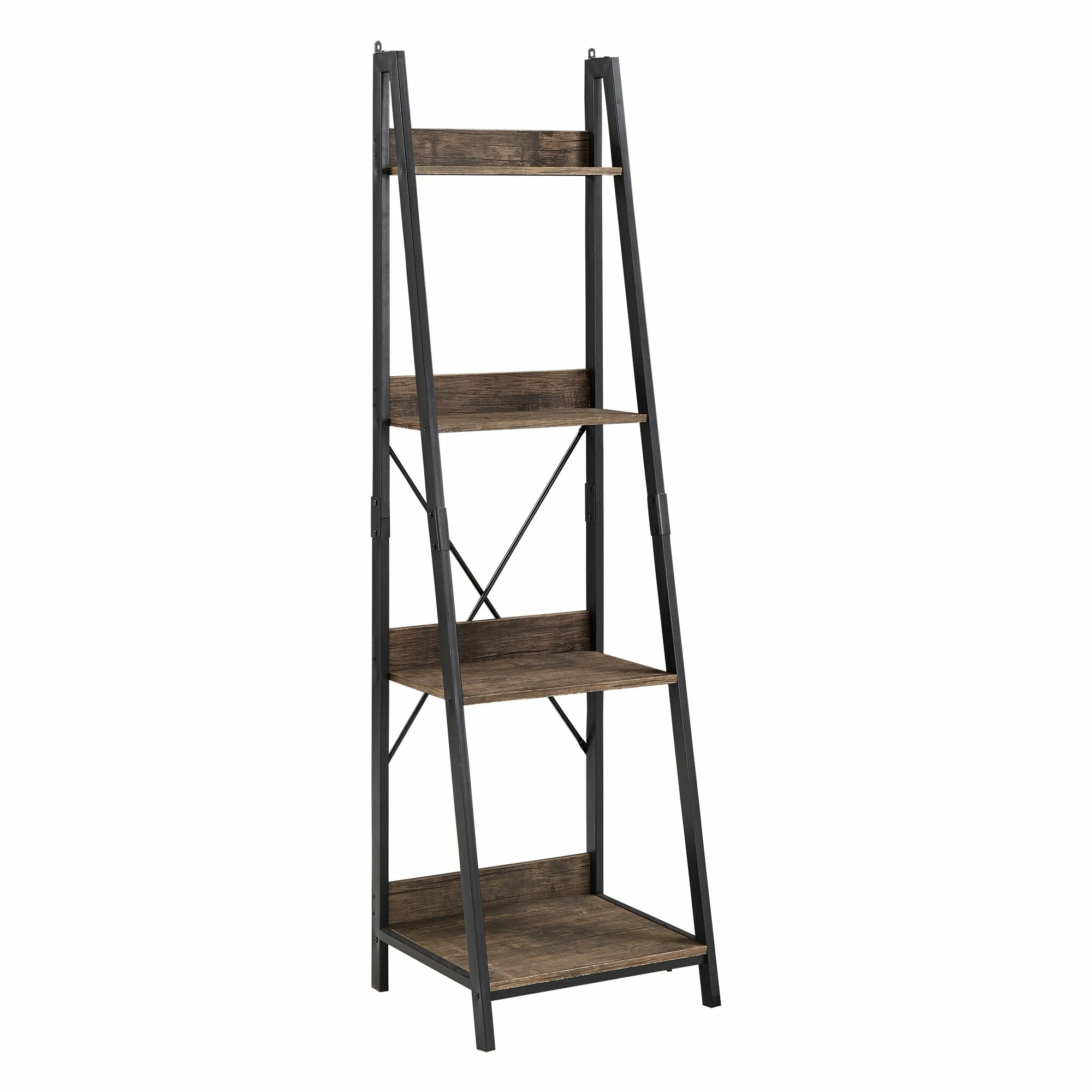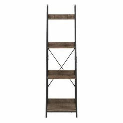 Update the organization in your office or study with the Argis Black Metal Rustic Ladder Bookcase from iNSPIRE Q Modern. Four tiered shelves feature a warm brown finish with a visible wood grain for a vintage farmhouse aesthetic. The shelves are varied in size to accommodate your various belongings, perfect for storing collections of books or showcasing framed photos and décor. An industrial contrast is created by the black metal frame supporting the shelves. Complete with an X-cross back, this innovative piece blends well with a multitude of design styles, from rustic to transitional to contemporary.