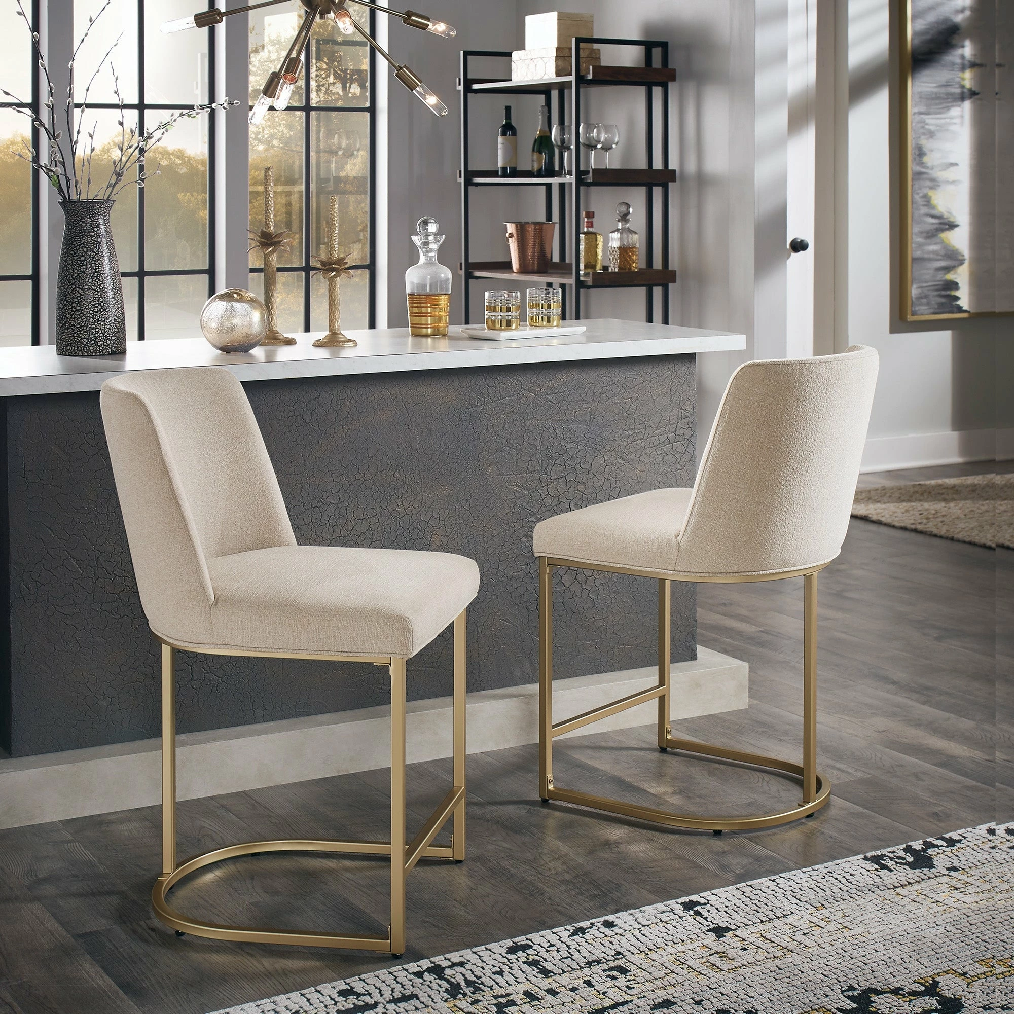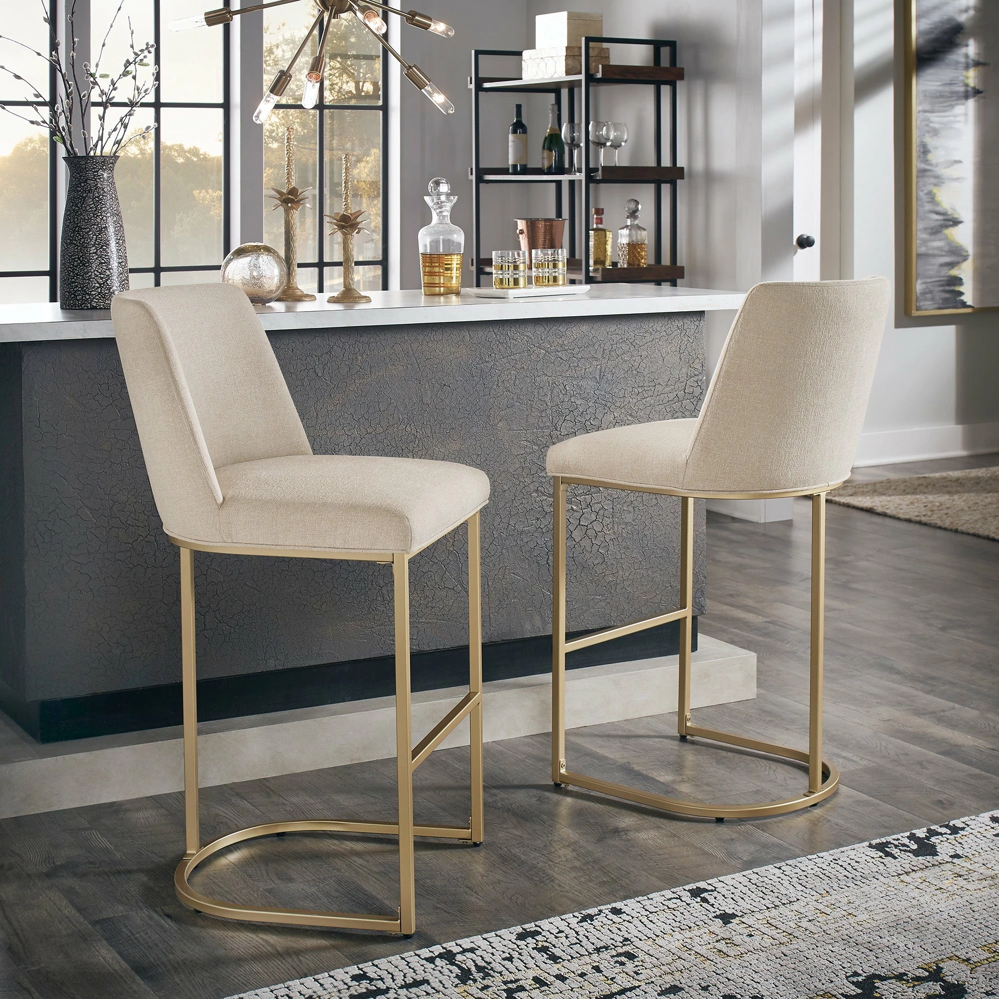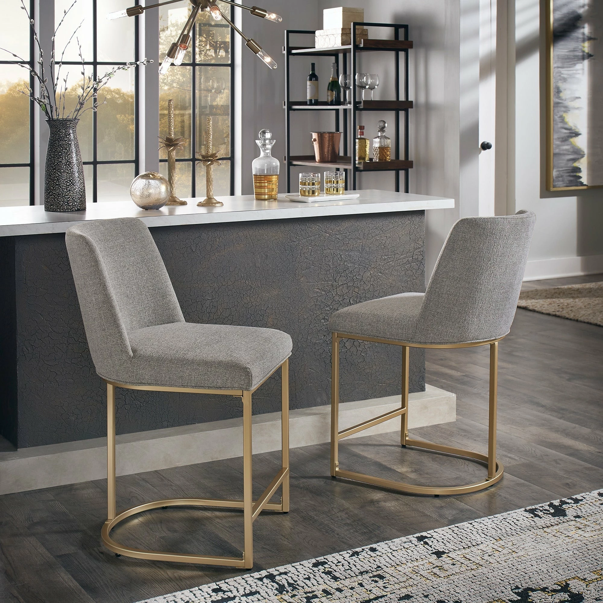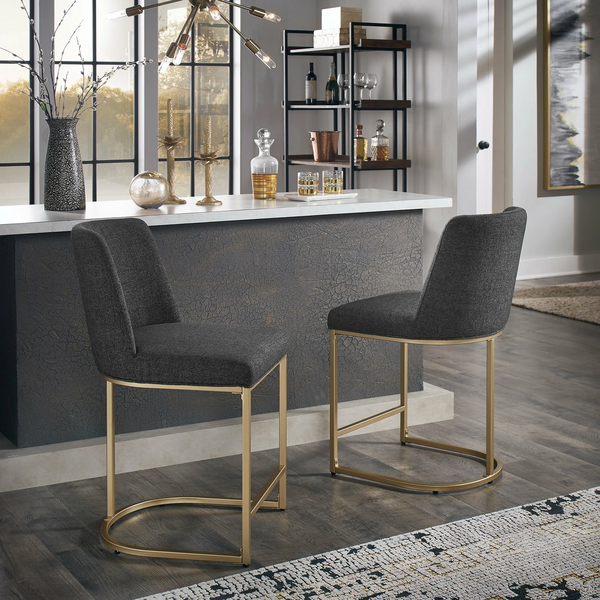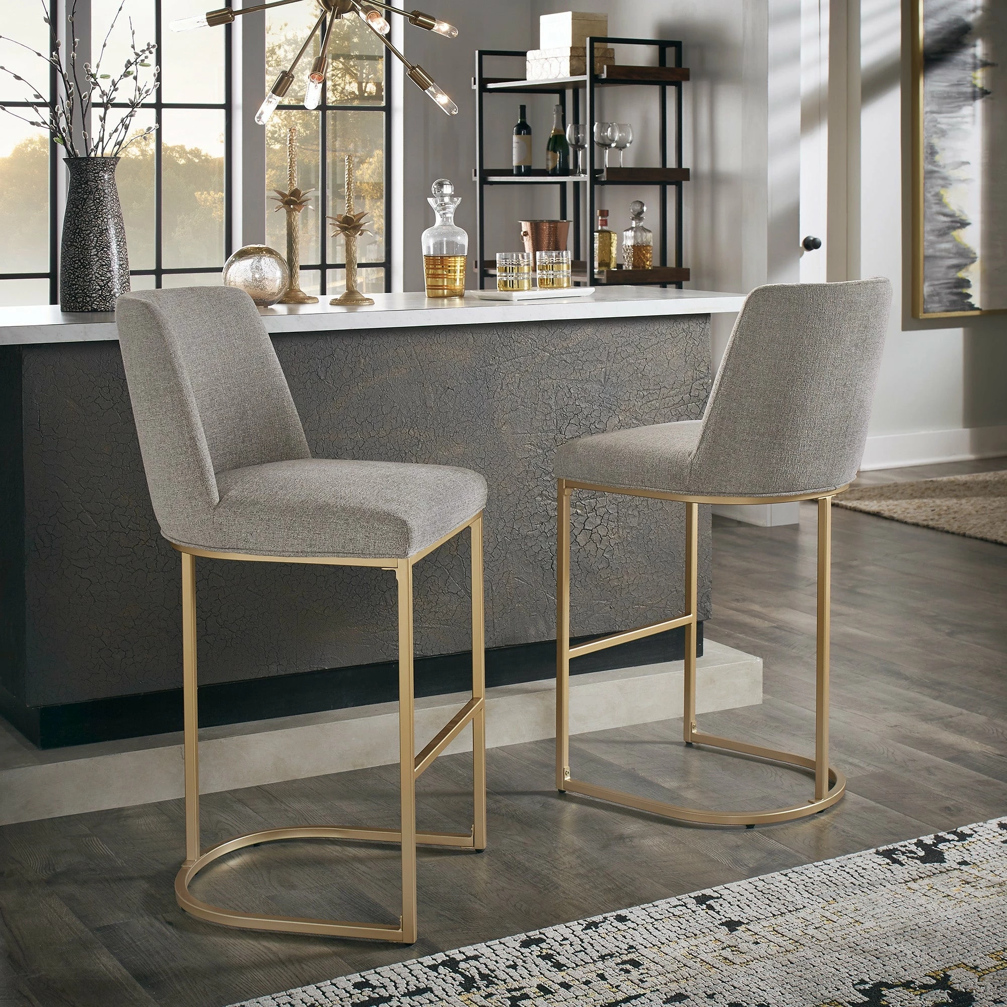 Our Art Deco bar and counter stools have a perfect combination of contemporary design and glam style. The mid-century modern gold finish metal base lends this piece a modern appeal, while the curving back and slim sled legs lend it a sleek, simple elegance. With luxurious heathered weave, soft fabric upholstery, and plush foam cushioning, these bar and counter stools are the perfect places to enjoy your morning coffee or evening drink. The curving back and built-in footrests make them comfortable enough to use as chairs in any room of your home!