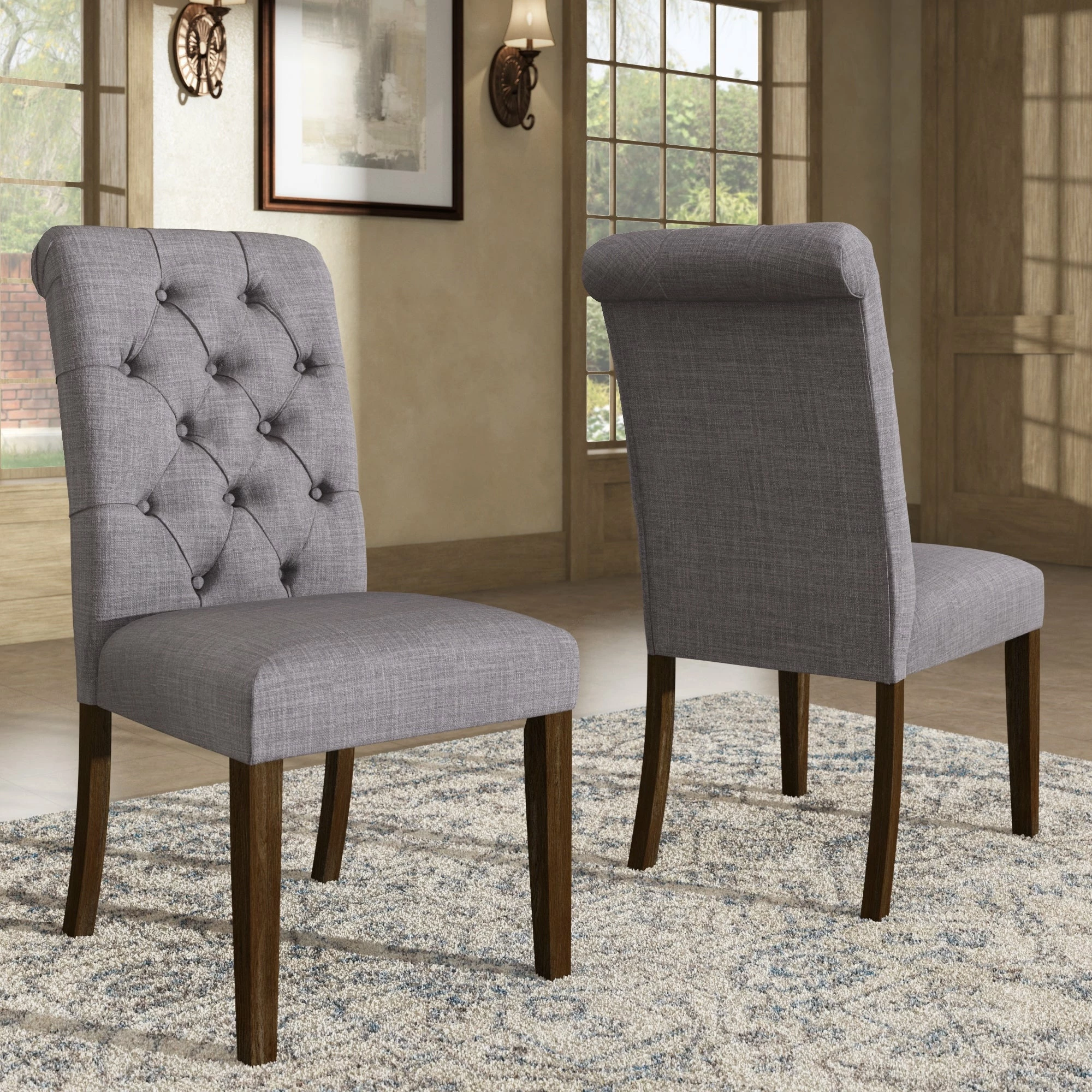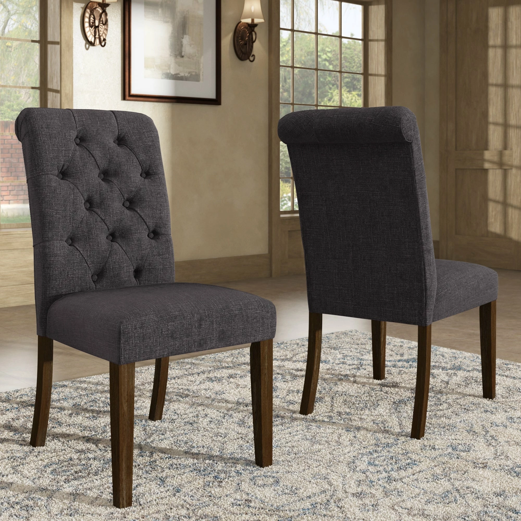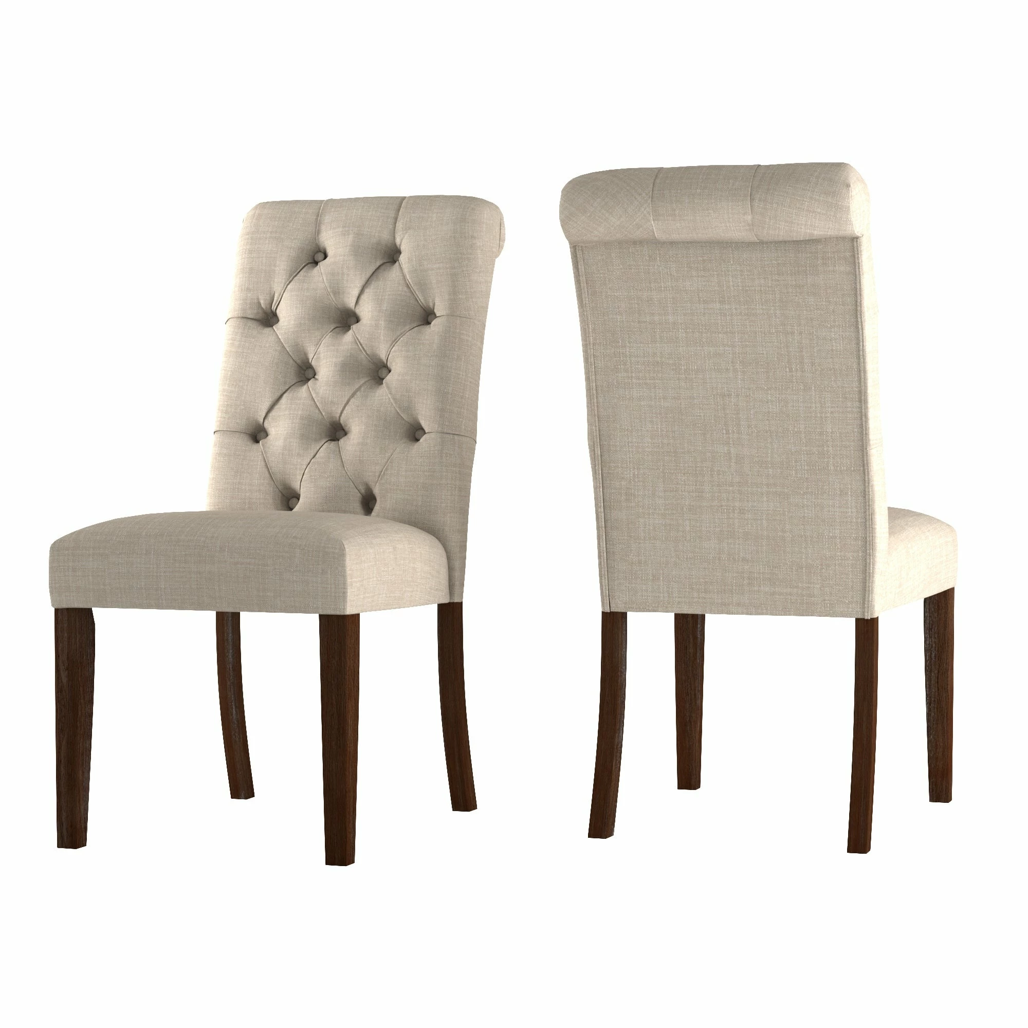 - Button-tufted, rolled chair backs