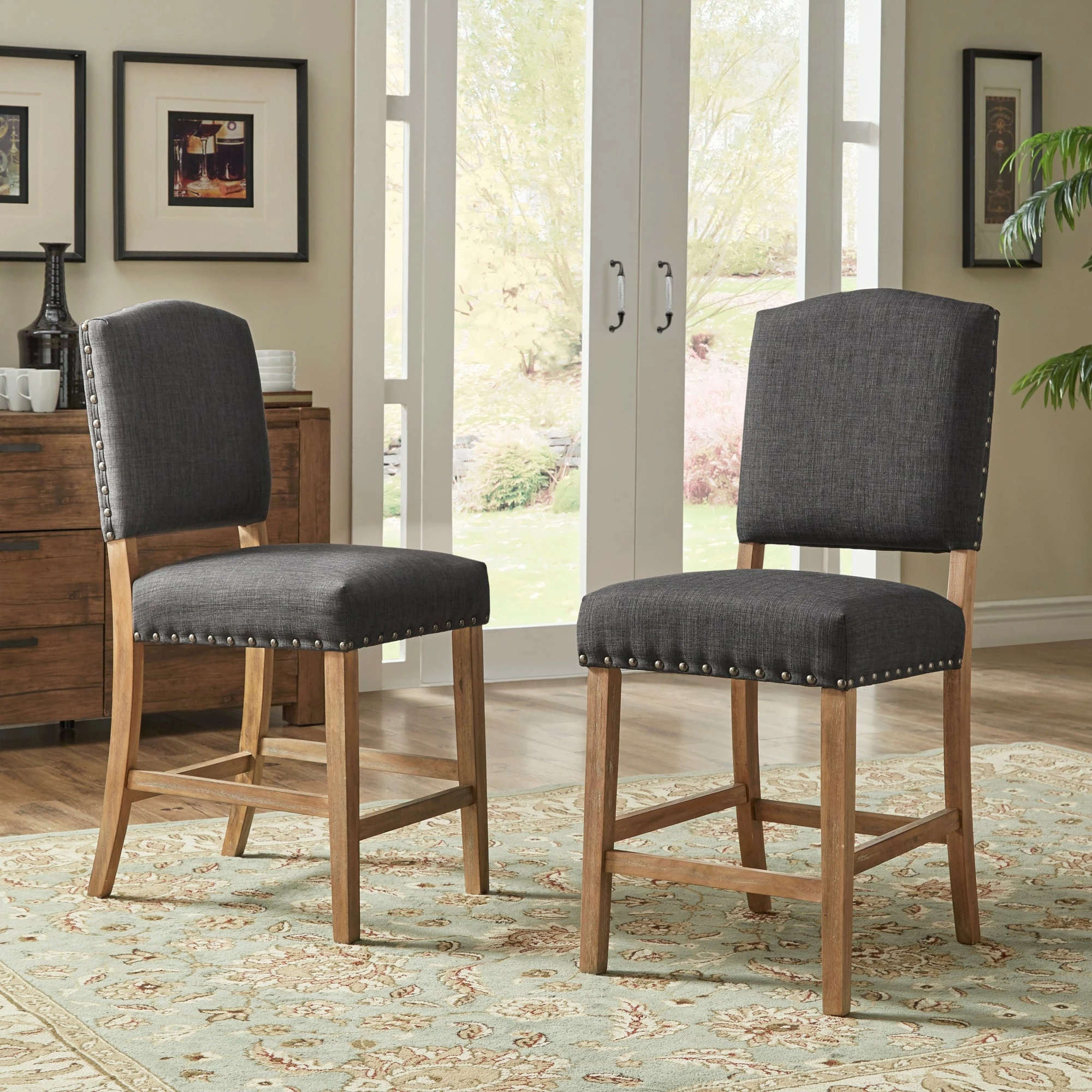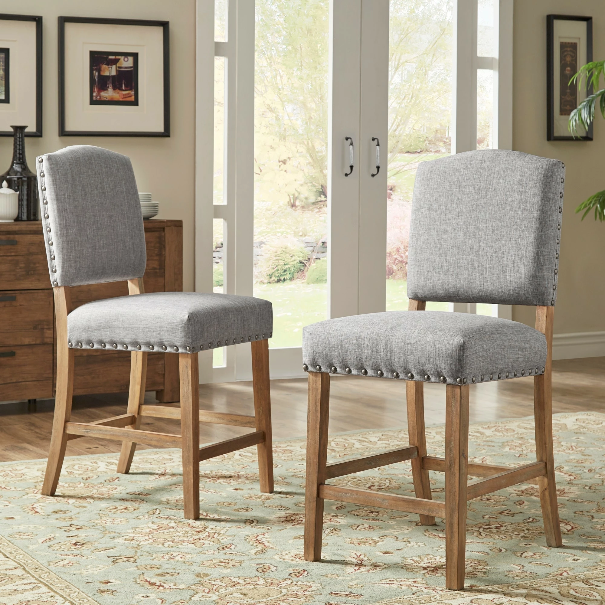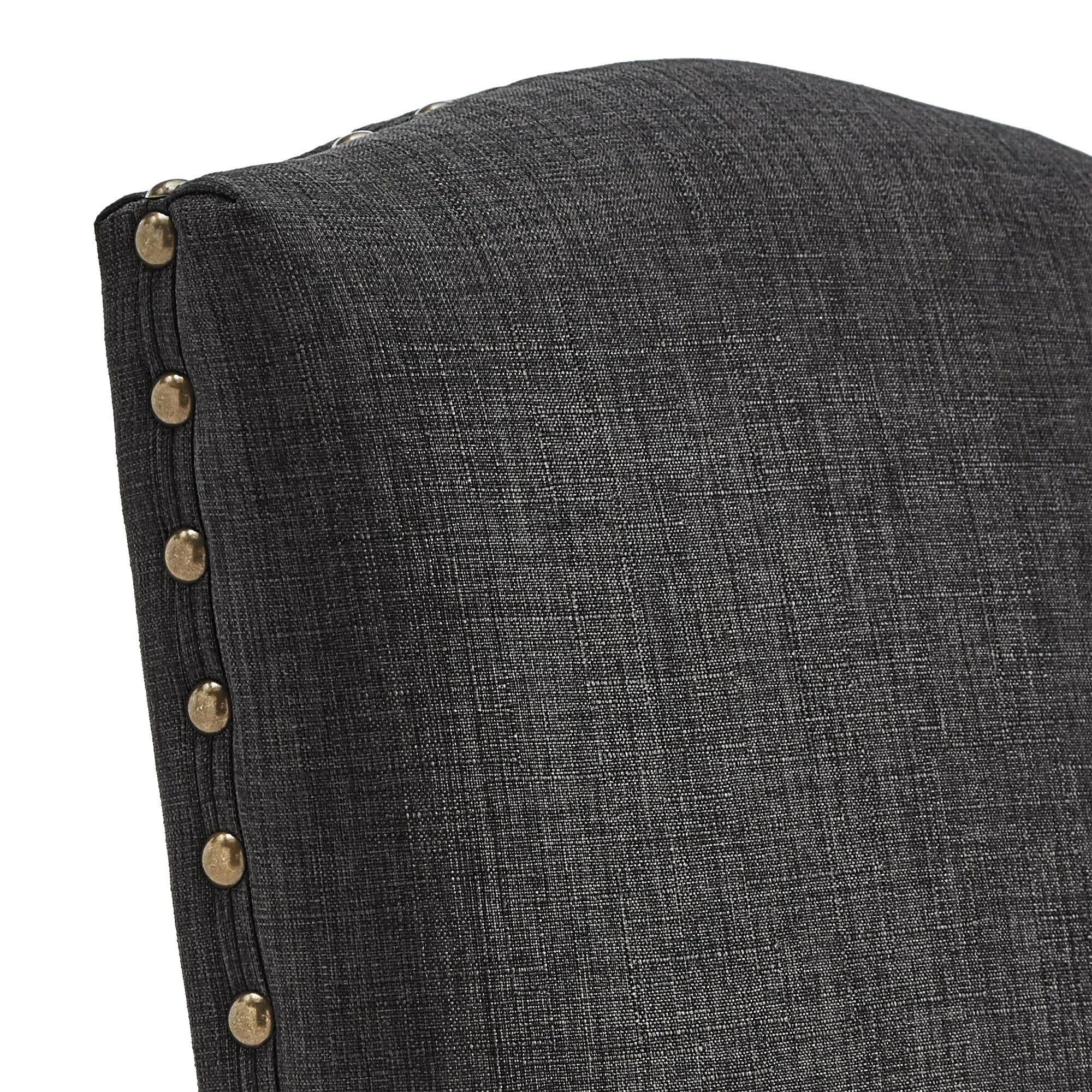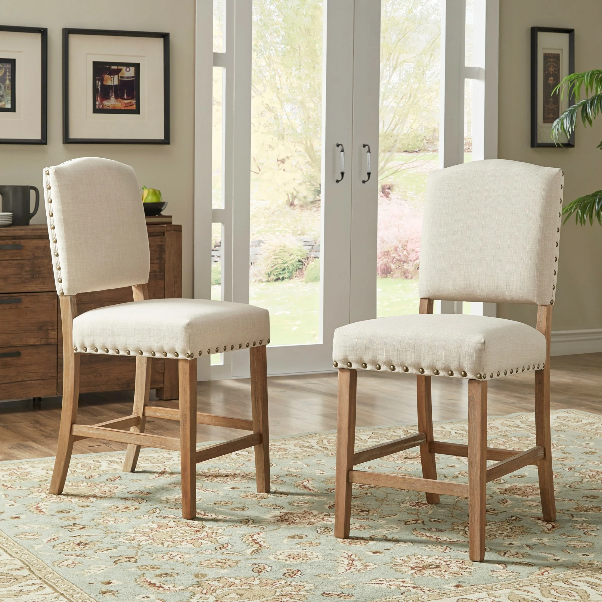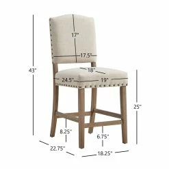 Add sitting space to your kitchen or bar counter with these Benchwright counter-height chairs by iNSPIRE Q Artisan. Showcasing a sturdy rubberwood frame construction, these chairs have a linen fabric upholstery for extra durability. The antique bronze nail-head accents bring rustic charm to your space.