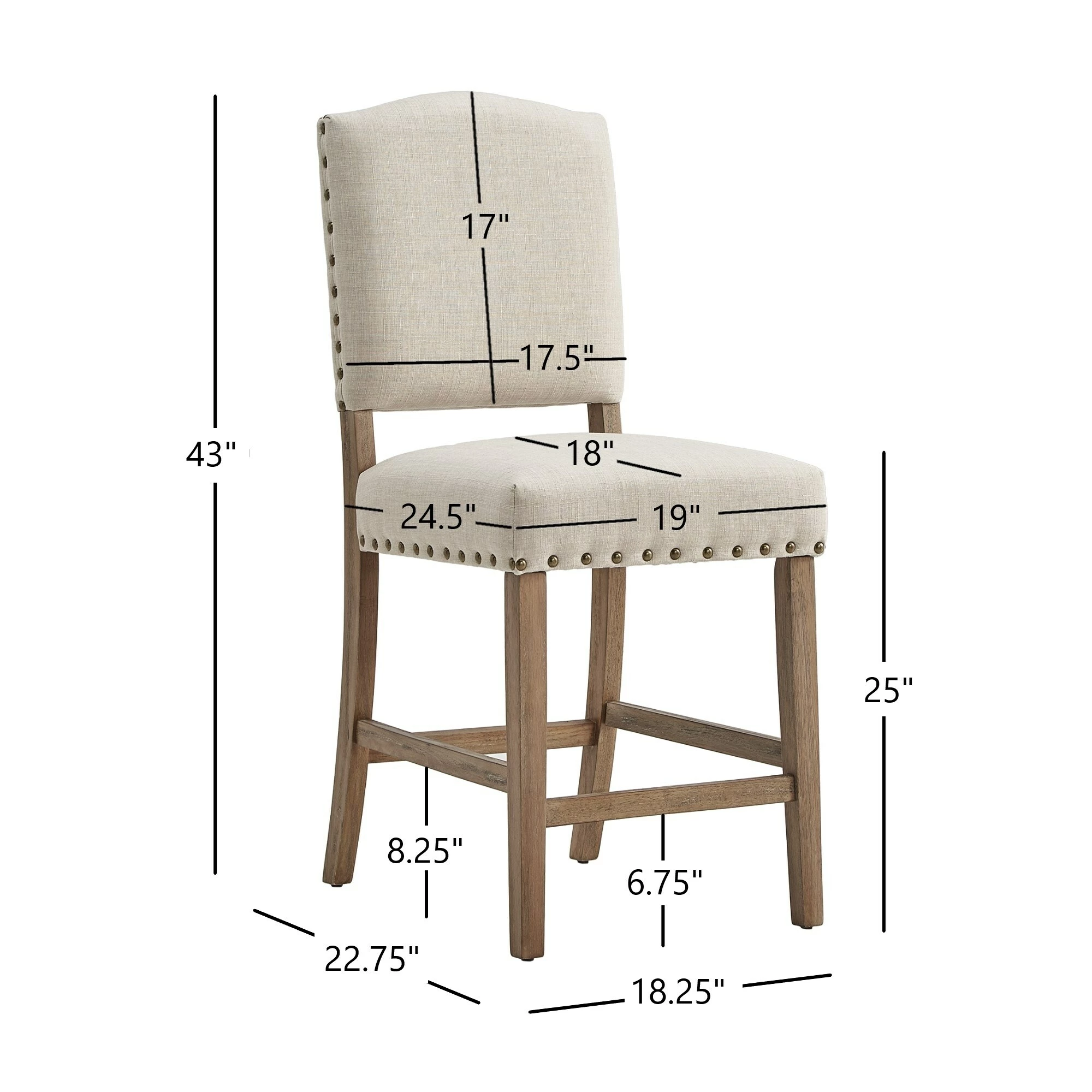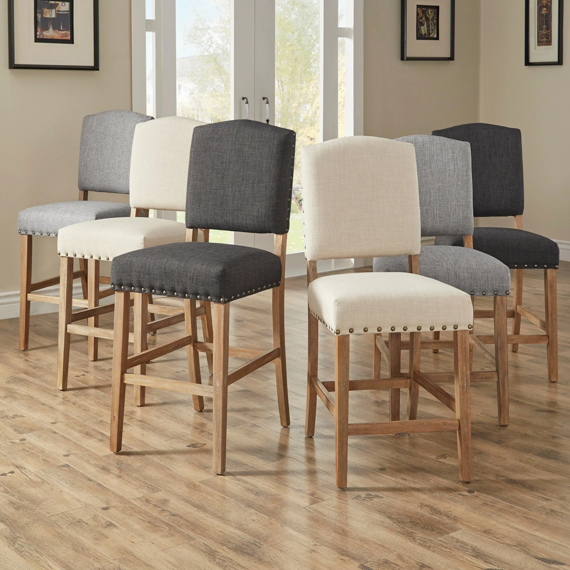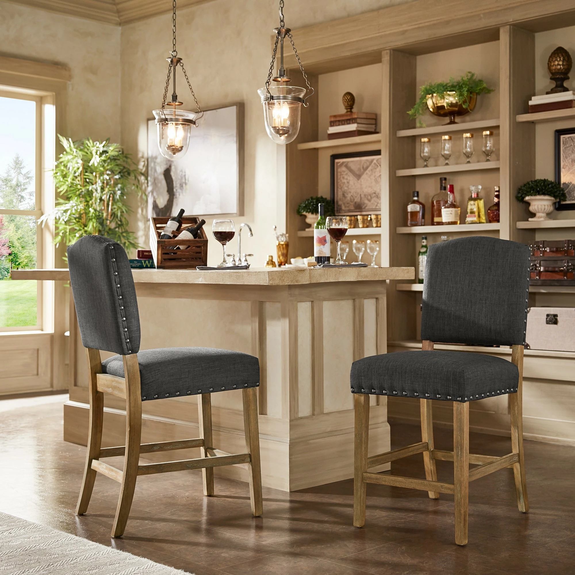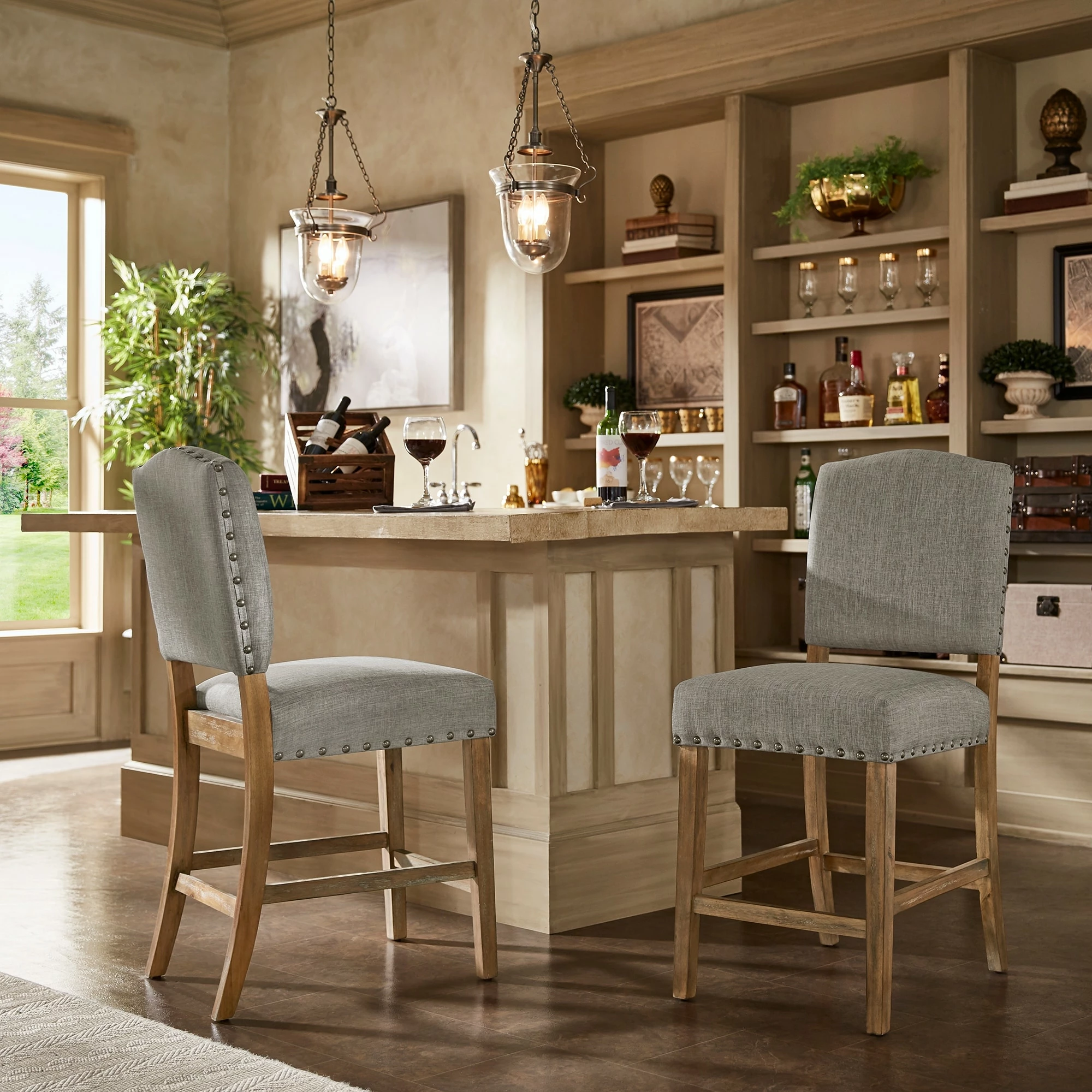 Add sitting space to your kitchen or bar counter with these Benchwright counter-height chairs by iNSPIRE Q Artisan. Showcasing a sturdy rubberwood frame construction, these chairs have a linen fabric upholstery for extra durability. The antique bronze nail-head accents bring rustic charm to your space.