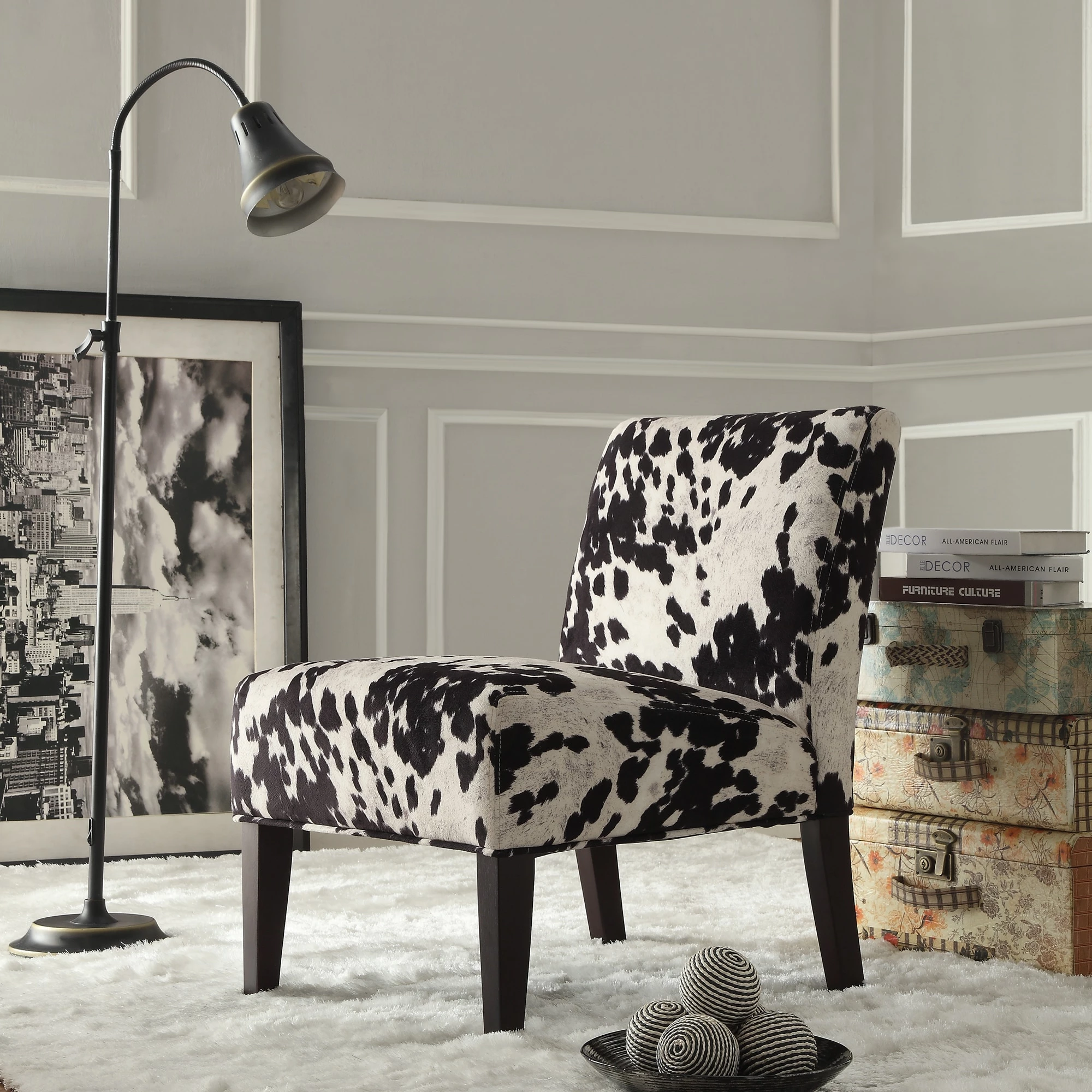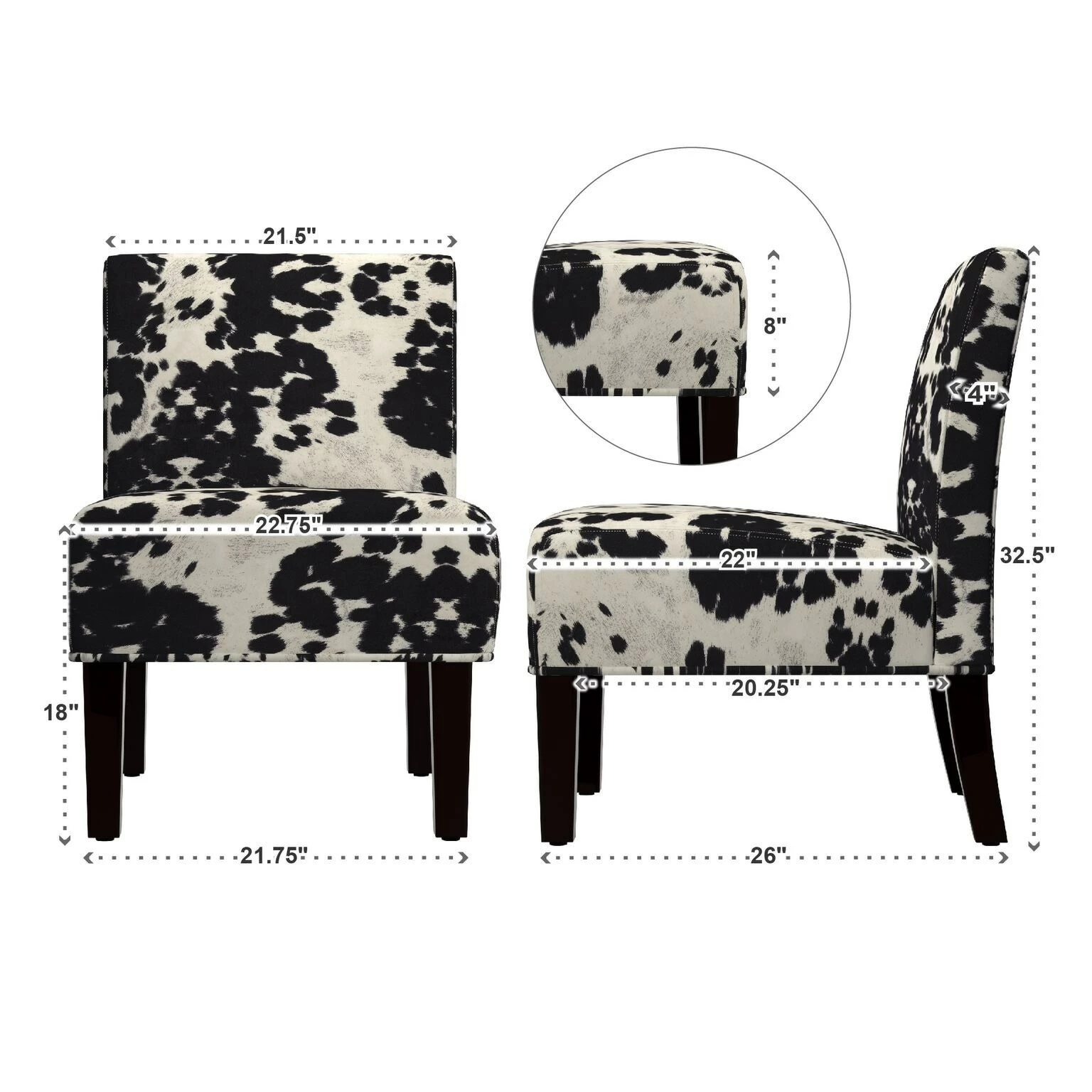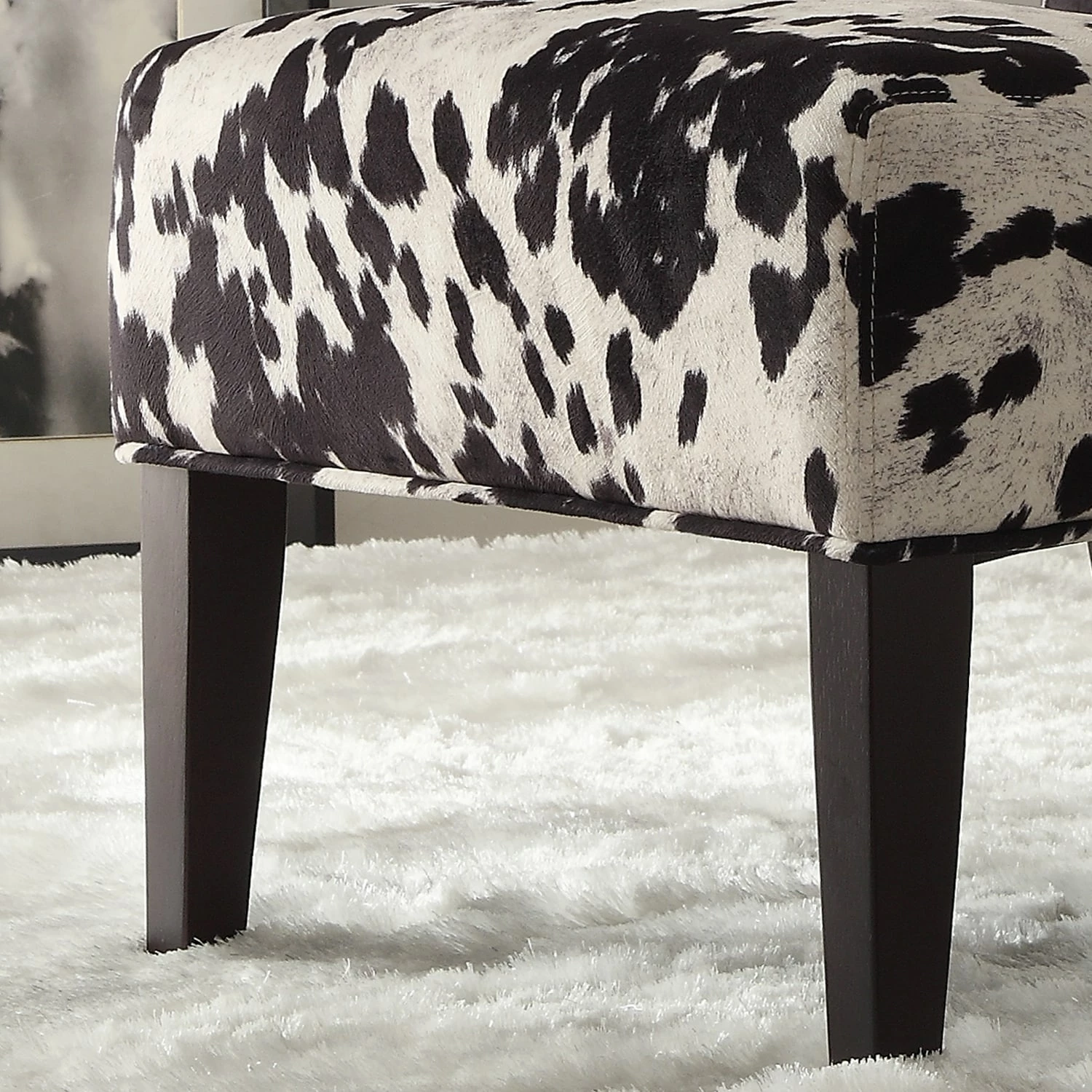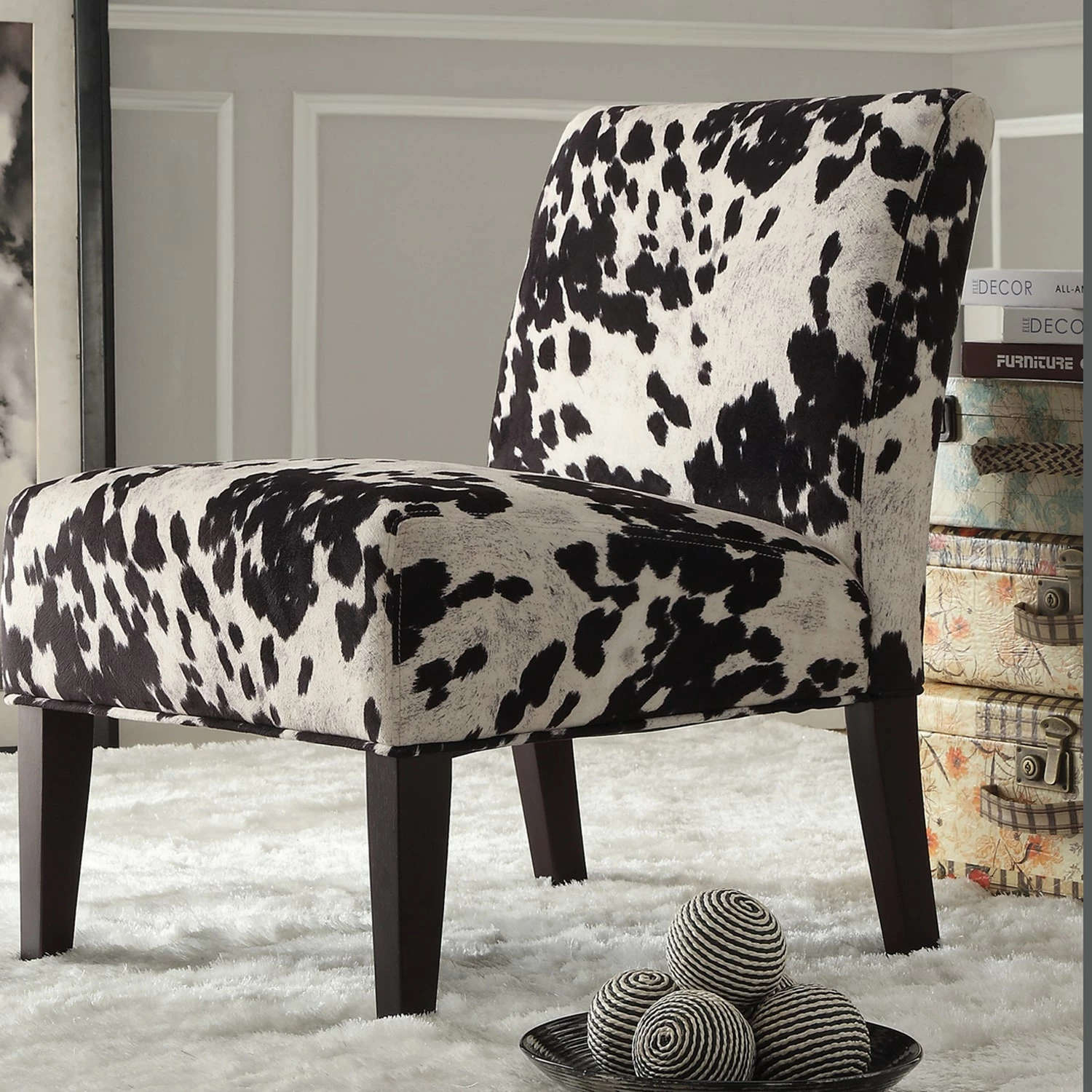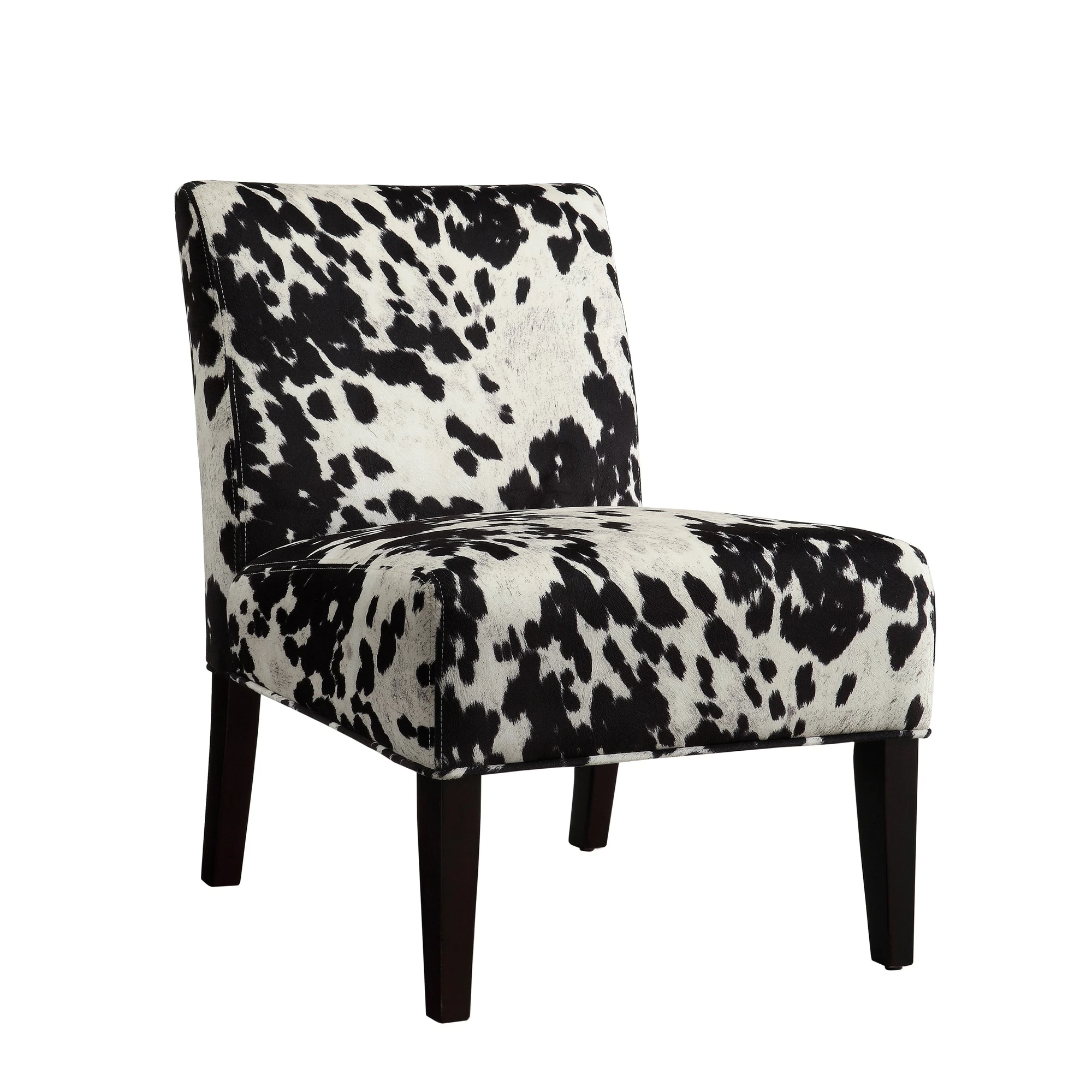 Southwestern charm meets traditional design with this striking accent chair from iNSPIRE Q®. The low profile chair features a durable rubberwood construction with firm foam cushioning and espresso finish legs. The faux cow hide print polyester upholstery features a life-like texture that makes this whimsical chair a great choice of your favorite space.