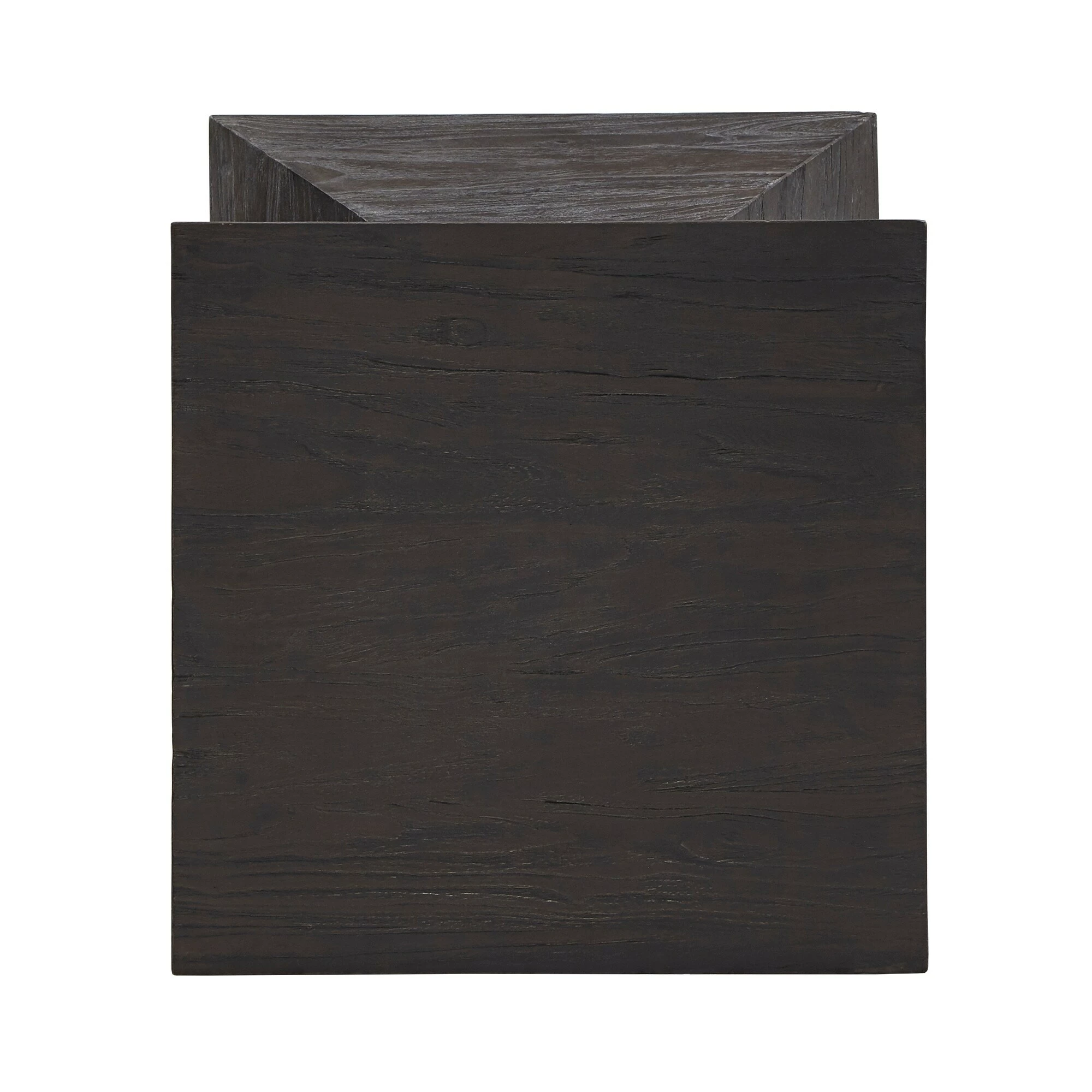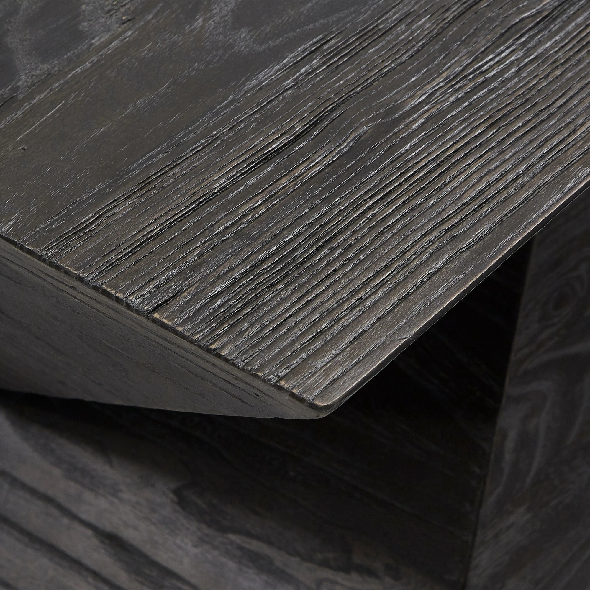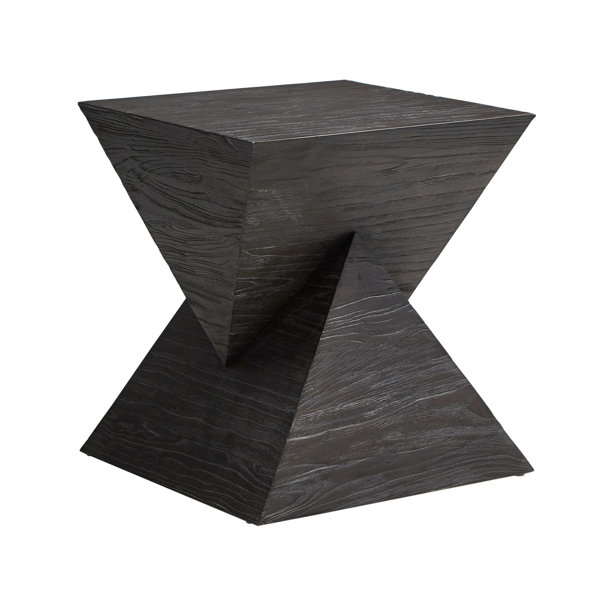 Make an extraordinary statement in your home with the Brennan Distressed Double Triangular Prism Shape End Table from iNSPIRE Q Modern. This up-to-date end table showcases a show-stopping geometric design with clean lines and smooth surfaces. A distressed wood grain finish adds some vintage charm to the overall piece. Crafted from new elm and solid wood for stability and durability, this innovative end table works great in contemporary settings.