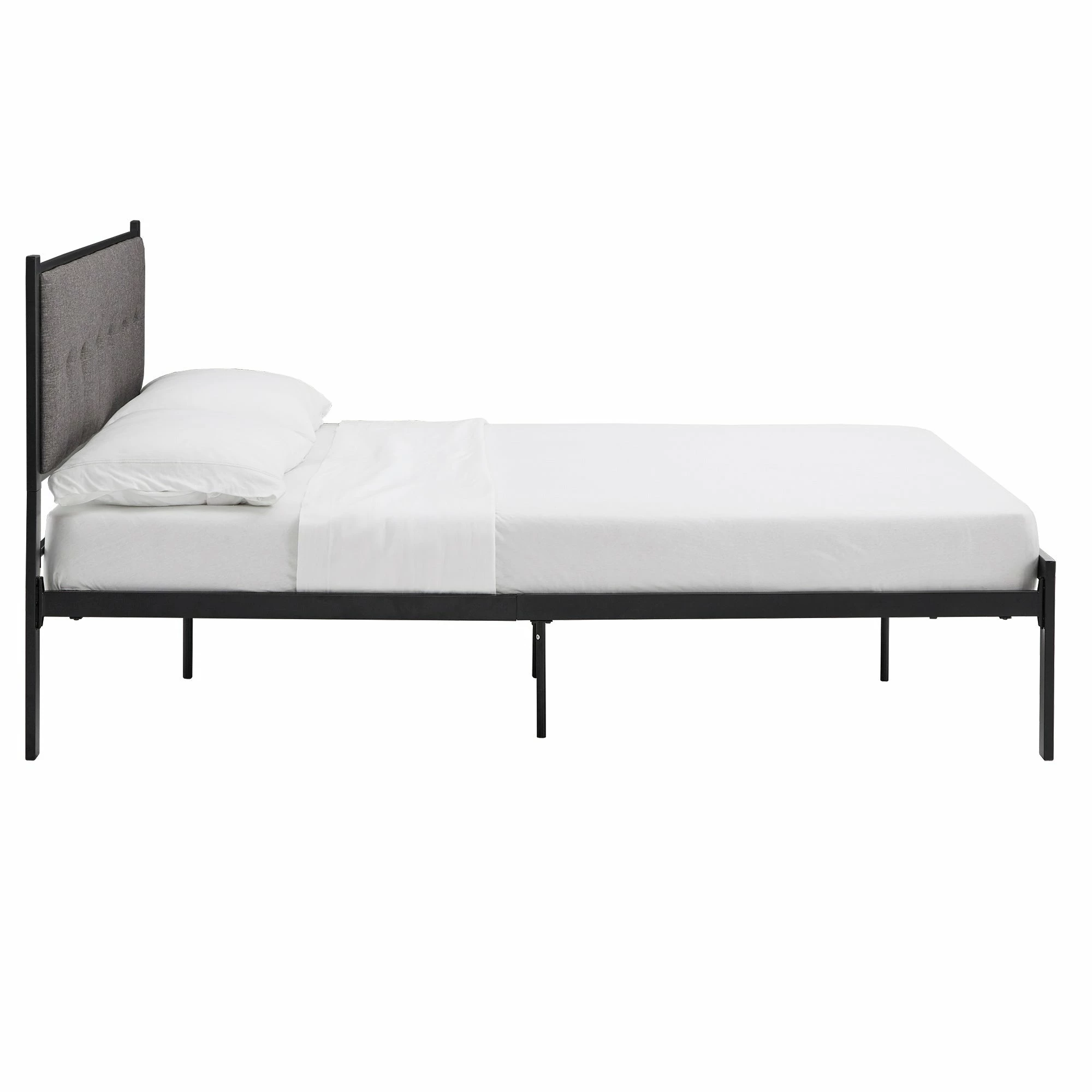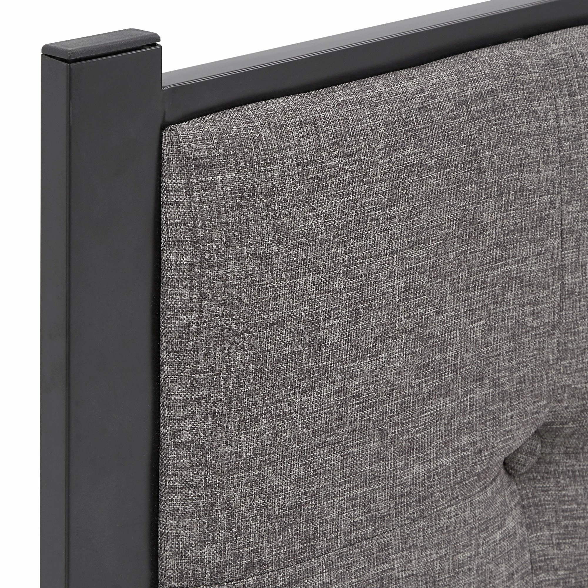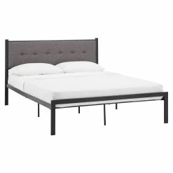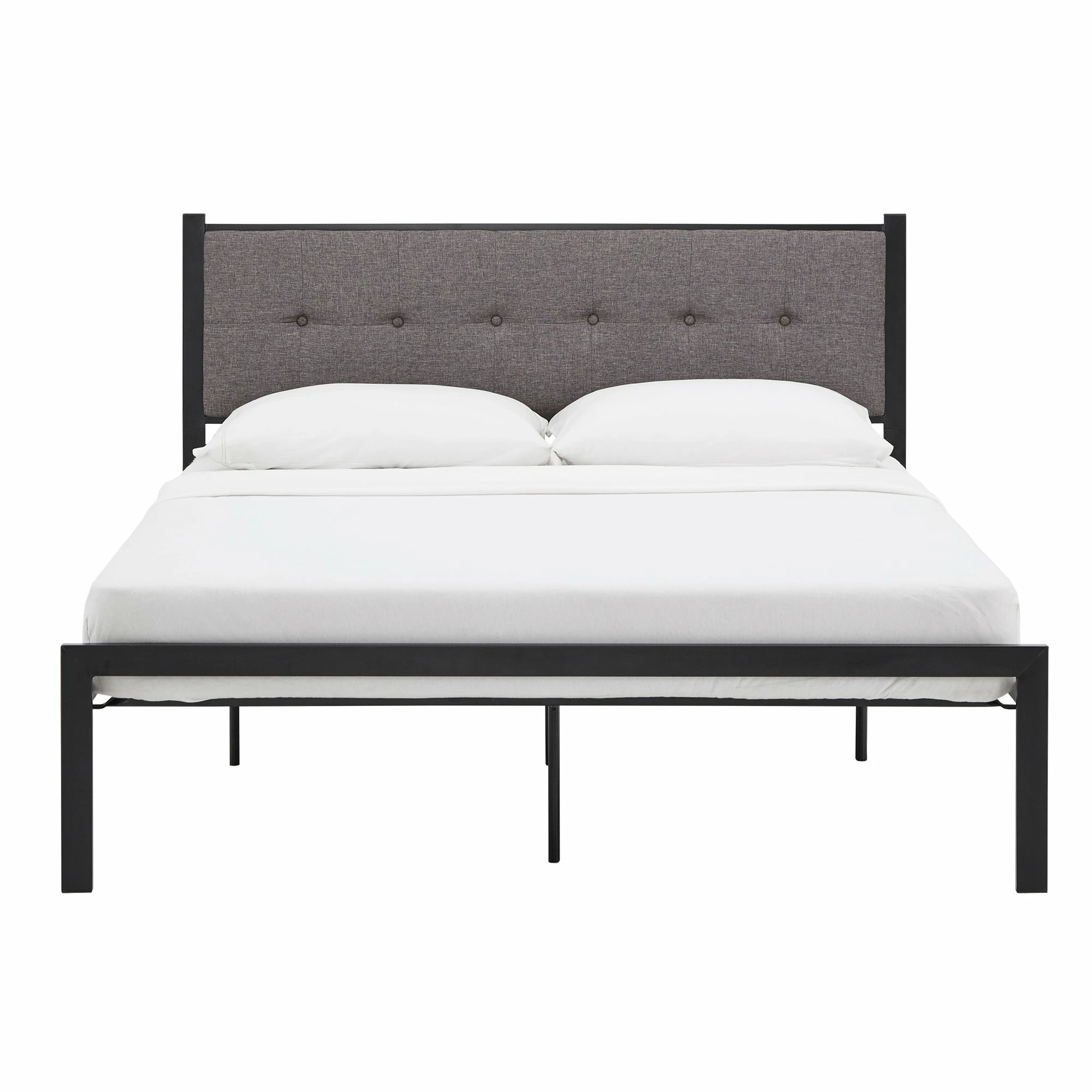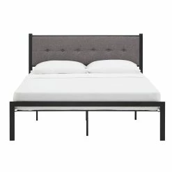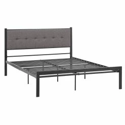 This Metal Platform Bed with Tufted Linen Headboard is the bed your room has been waiting for. It features a streamlined contemporary design that will look great in any space and a sturdily crafted iron frame for durability. The headboard has soft linen upholstery with delicate button tufting help you drift off to dreamland. All you need to do is lay your mattress on top of the sturdy metal slatted frame, and you’re good to go!