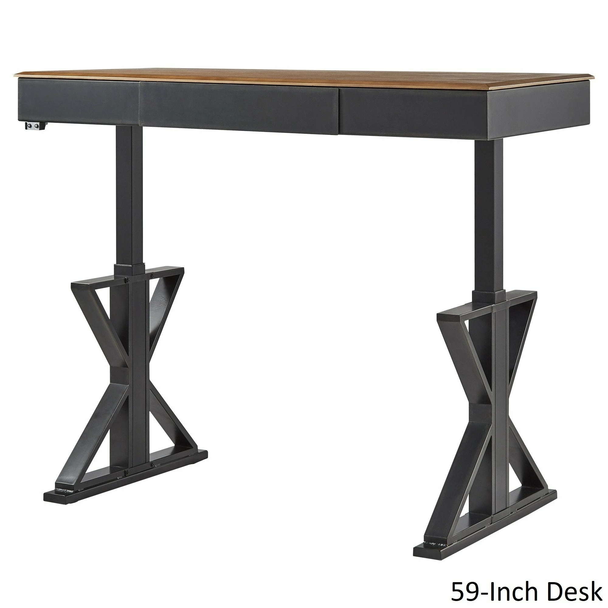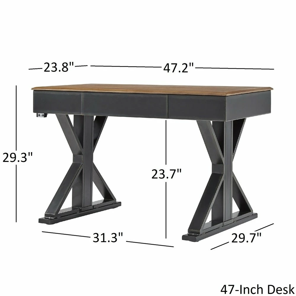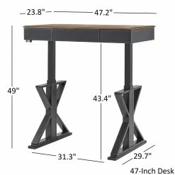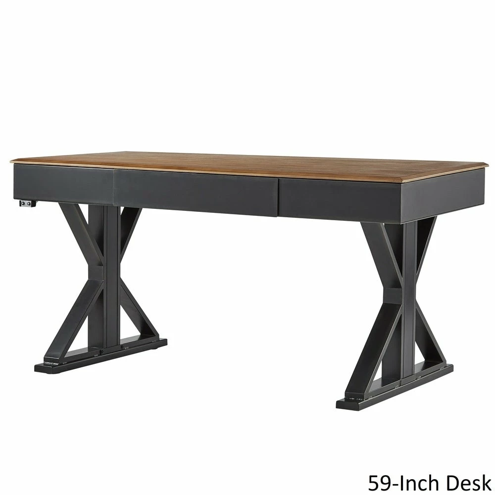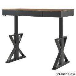 Add a sophisticated and multifunctional desk to your office space with the Cabella Adjustable Desk by iNSPIRE Q® Classic. This desk has an electric height adjustment feature so that you can sit or stand while working. The transitional design features a rich black metal frame with sturdy x-base legs. As a unique bonus, the desk includes a hidden power strip to keep power accessible at any height. With a poplar wood grain table top, this stylish desk is sure to be a favorite for years to come. Available in two width sizes.