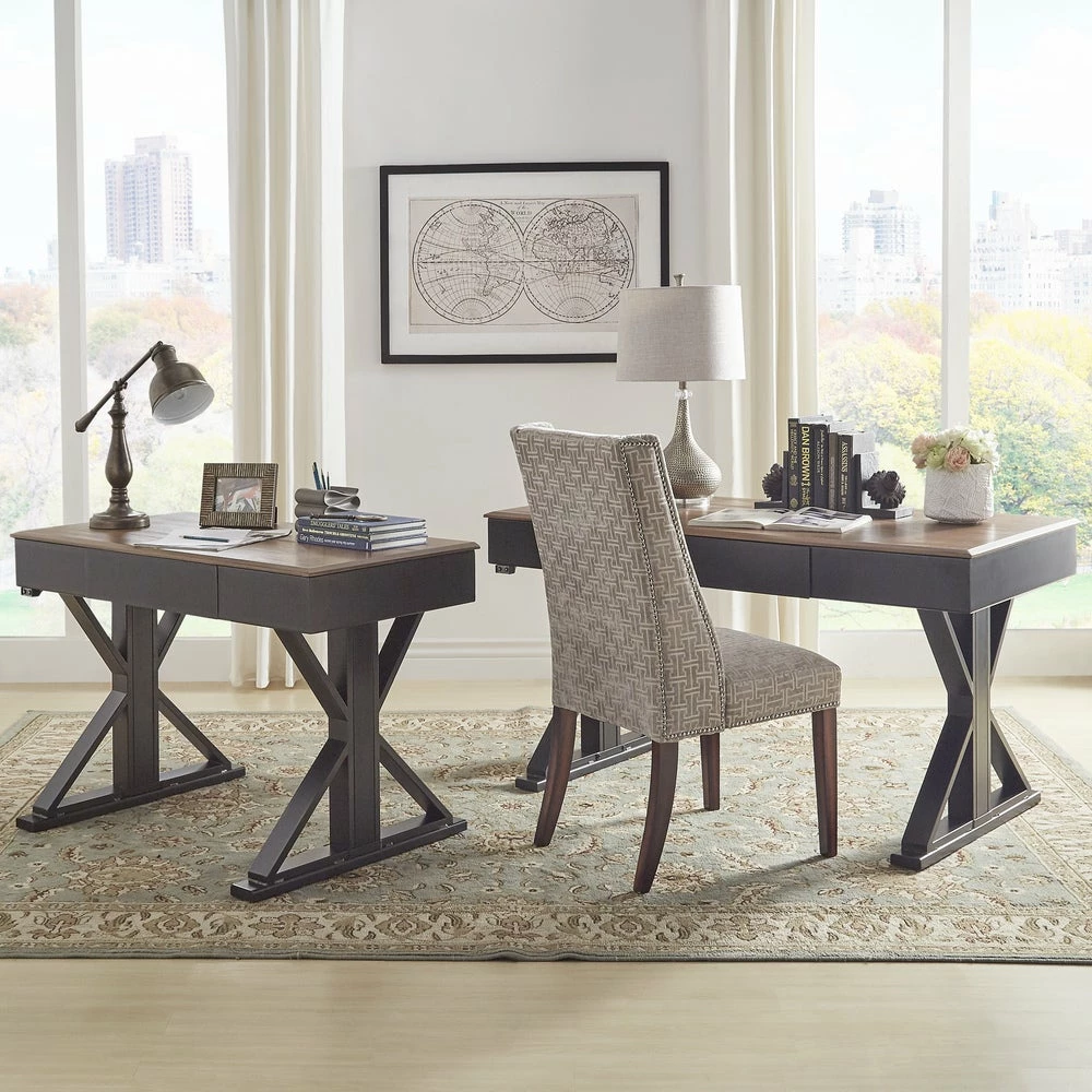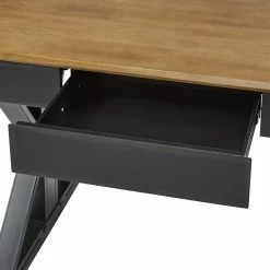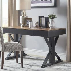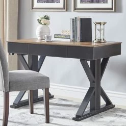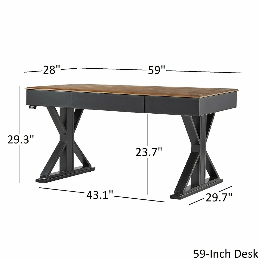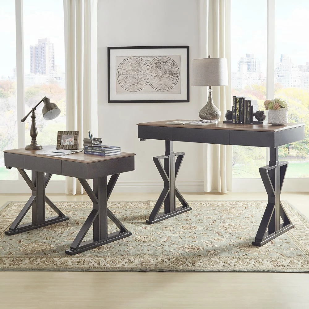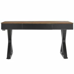 Add a sophisticated and multifunctional desk to your office space with the Cabella Adjustable Desk by iNSPIRE Q® Classic. This desk has an electric height adjustment feature so that you can sit or stand while working. The transitional design features a rich black metal frame with sturdy x-base legs. As a unique bonus, the desk includes a hidden power strip to keep power accessible at any height. With a poplar wood grain table top, this stylish desk is sure to be a favorite for years to come. Available in two width sizes.