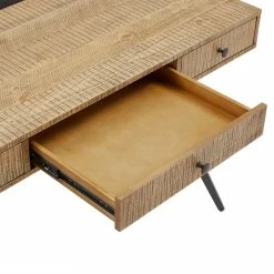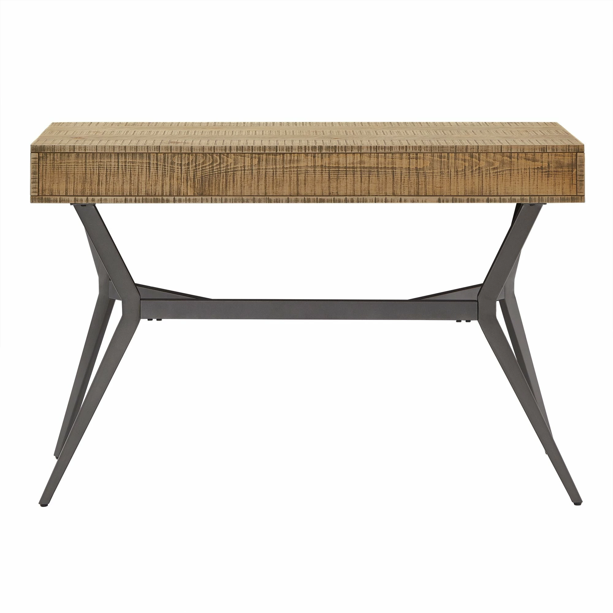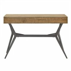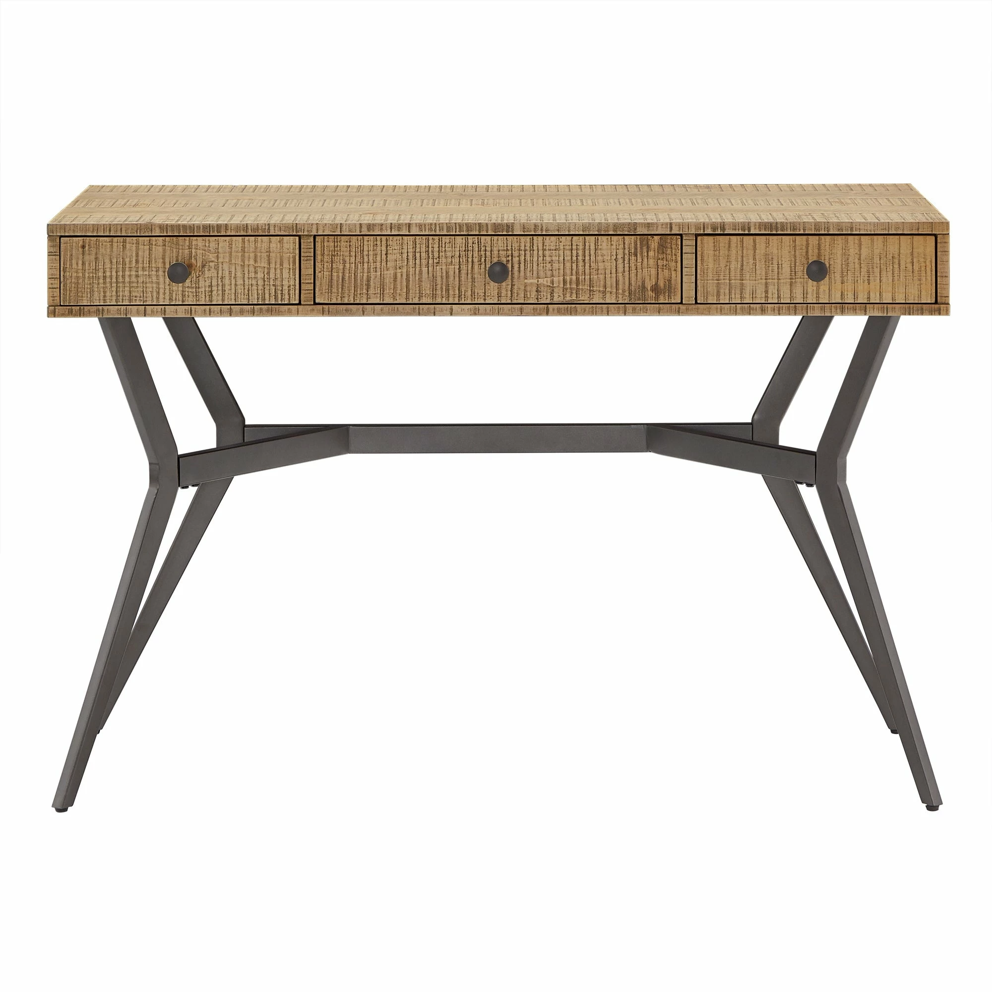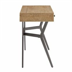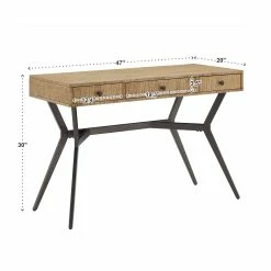 The Calem Light Pine Finish Writing Desk with Black Metal Base from iNSPIRE Q Modern is expertly crafted with a rustic wood grain on the desktop to deliver a stylish space to work. Three drawers provide ample storage. The sturdy black metal base contrasts the natural wood for striking mid-century inspired silhouette. This desk will complement any neutral decor, whether traditional or modern.