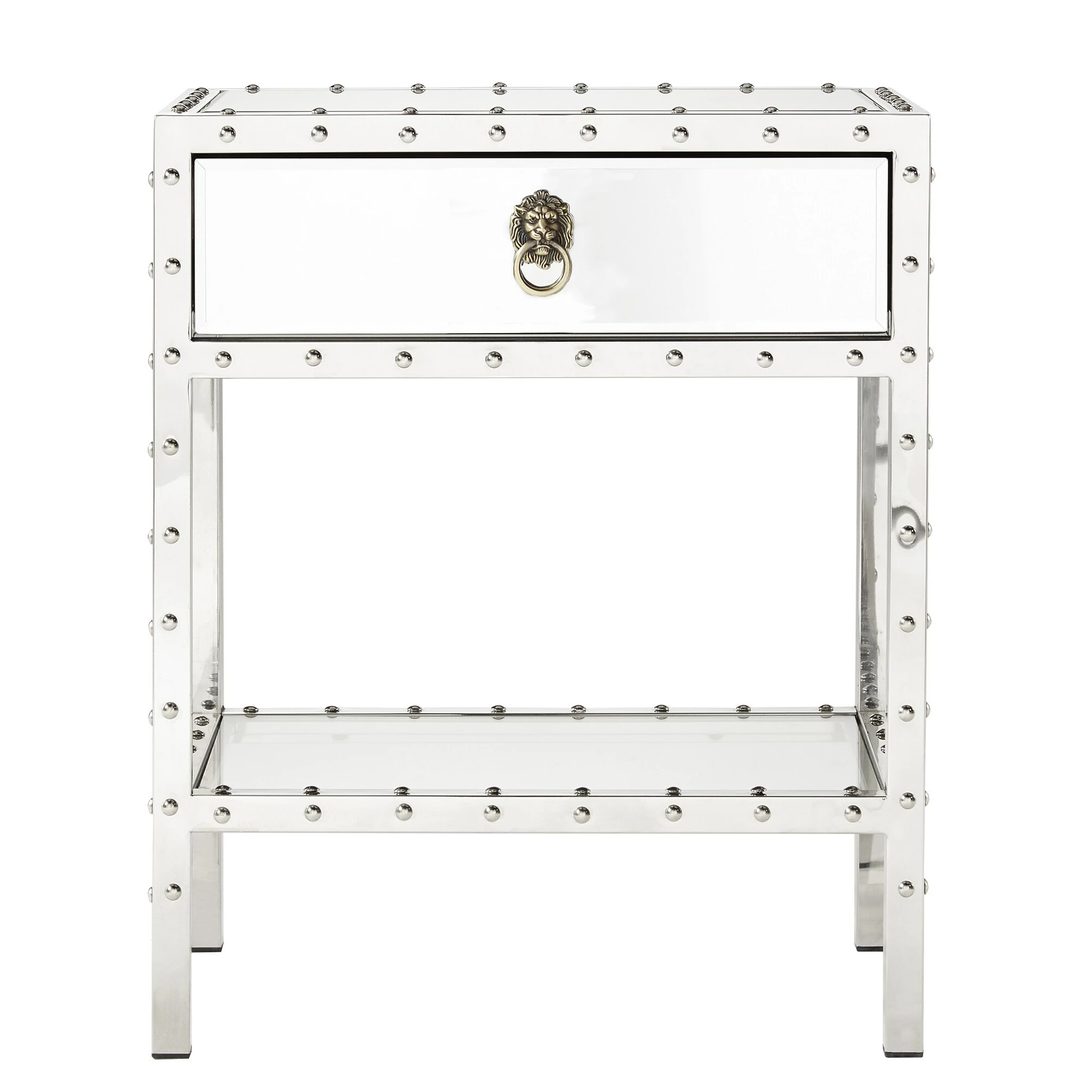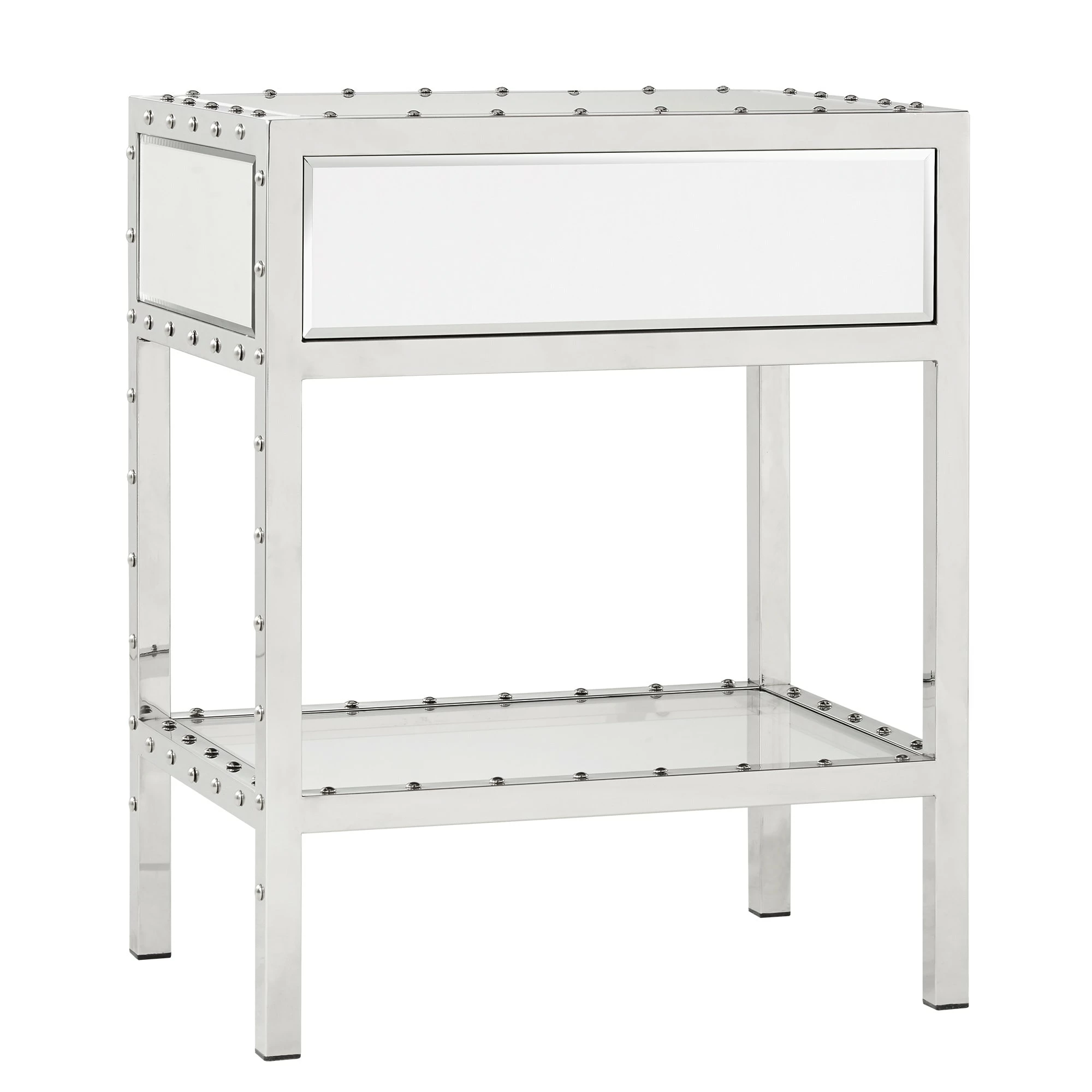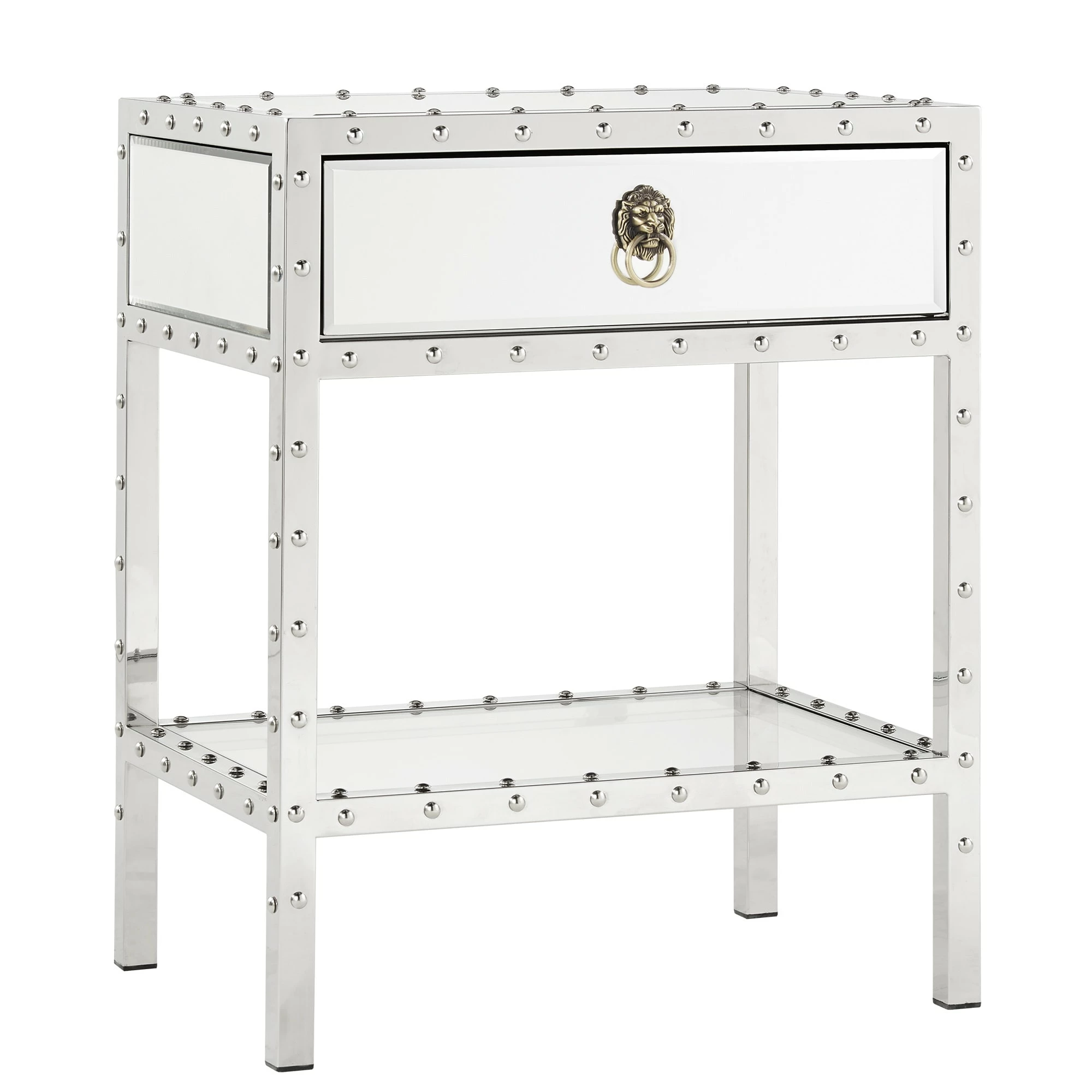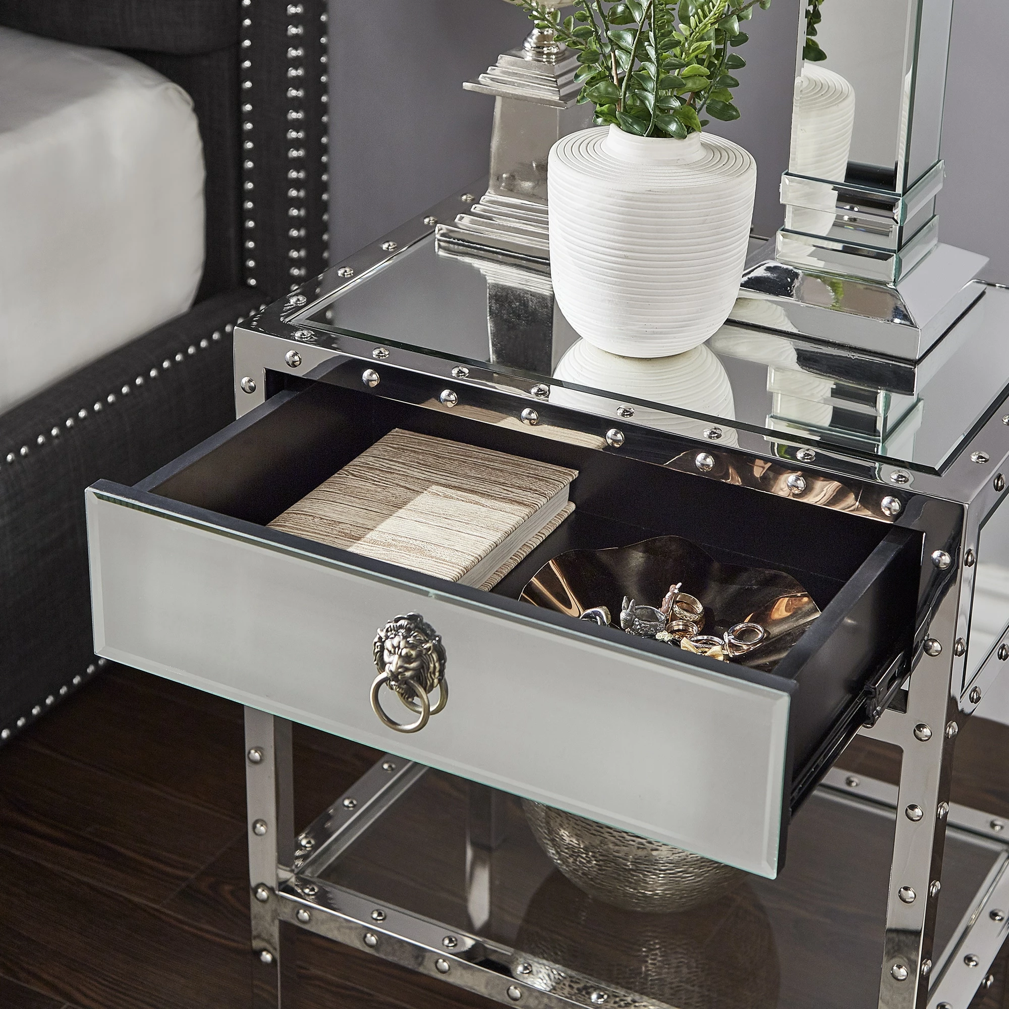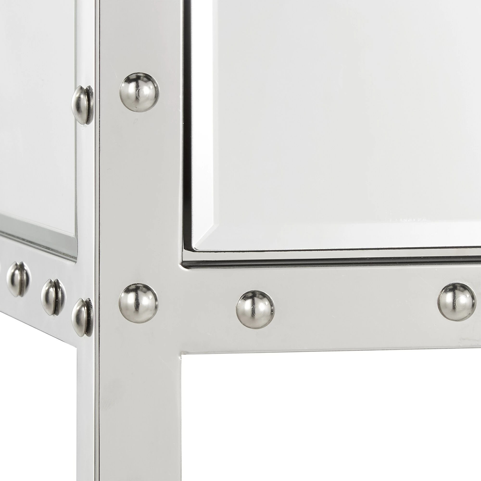 Add a glamorous accent to your home with the Carter Riveted Stainless Steel Mirrored Accent Table by iNSPIRE Q® Bold. This accent table features industrial inspired rivet details on the sturdy stainless-steel frame. The top and sides all feature beveled mirrors for added glitz and glamour. The sturdy glass shelf allows you to display your favorite home décor, while a spacious drawer stores all your essentials. The ornate lion head ring pull lets you open and close your drawer with ease and adds a touch of elegance. Add dazzling style to your space with this bold piece that lasts.