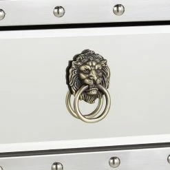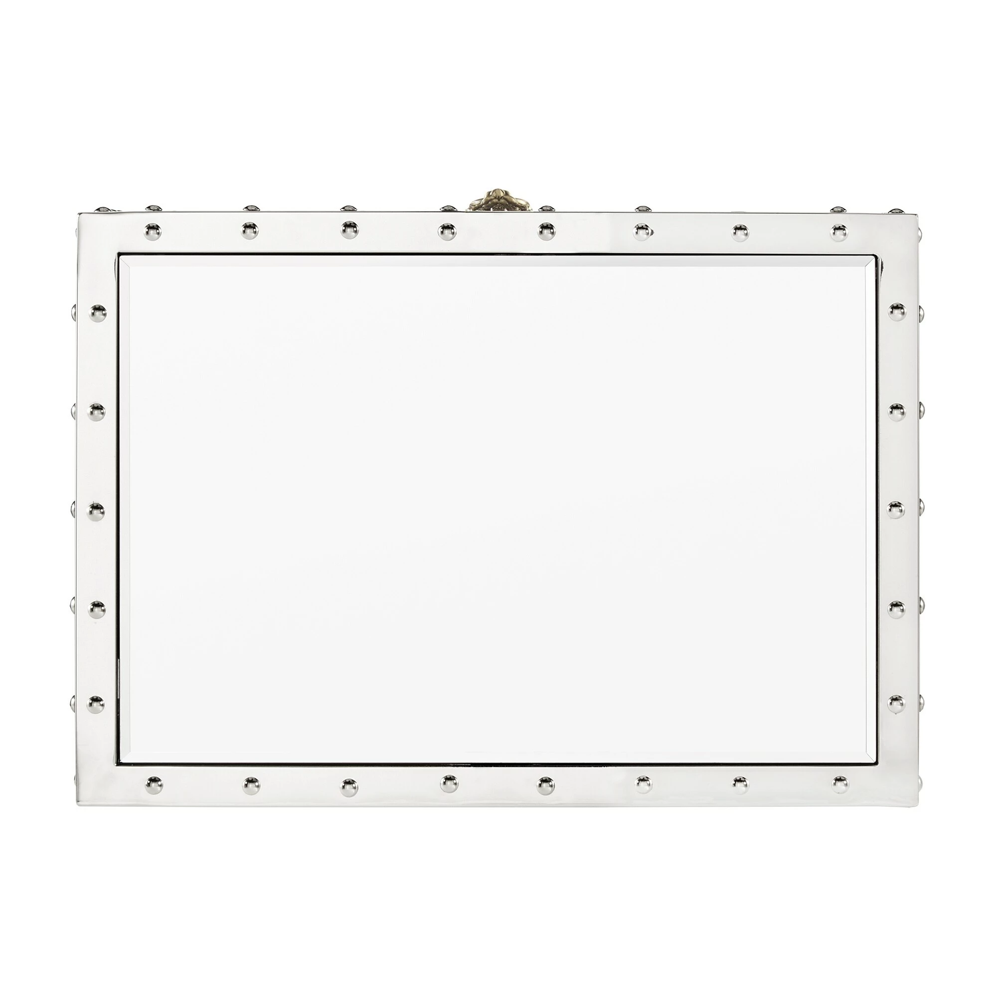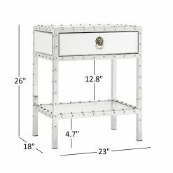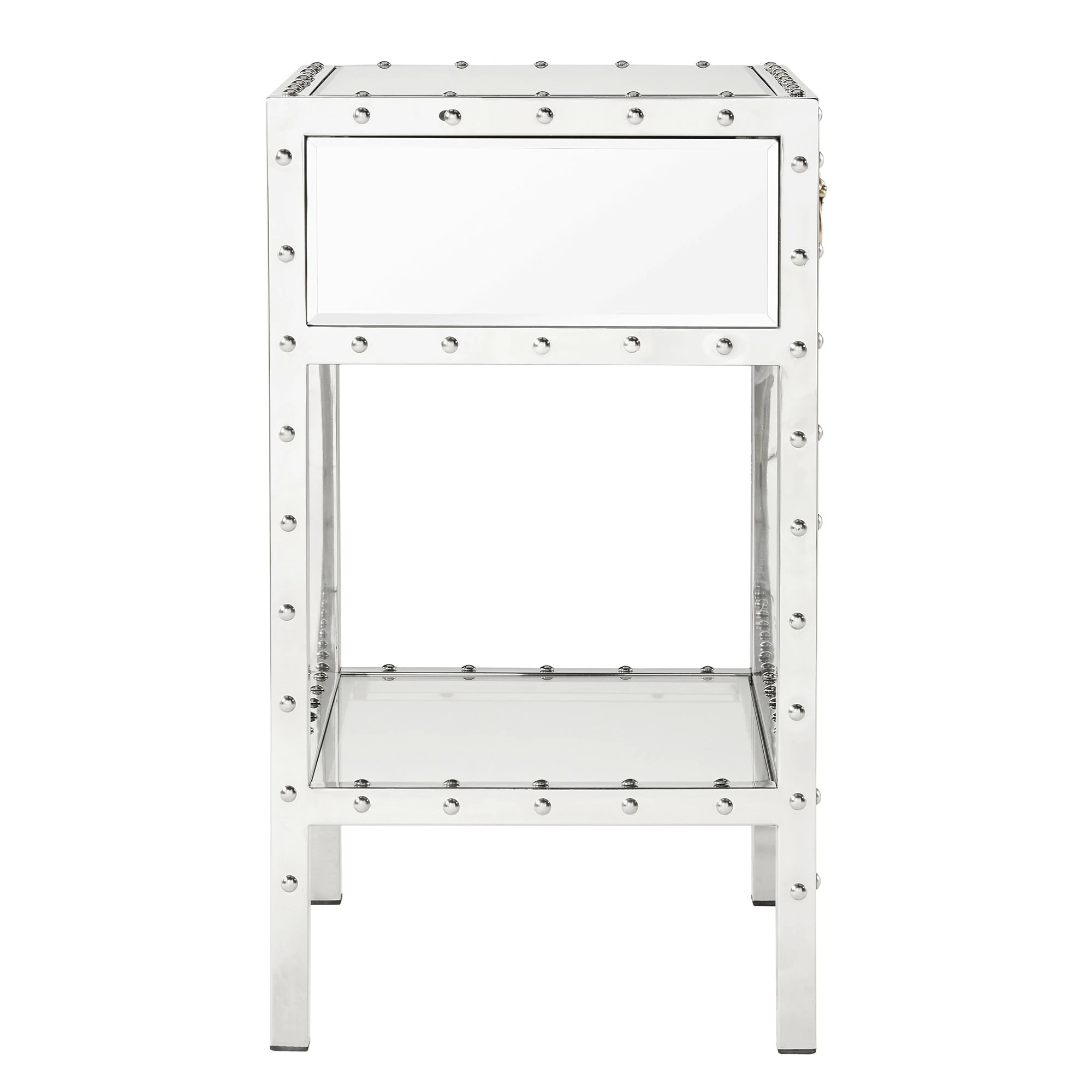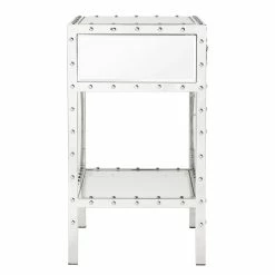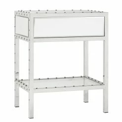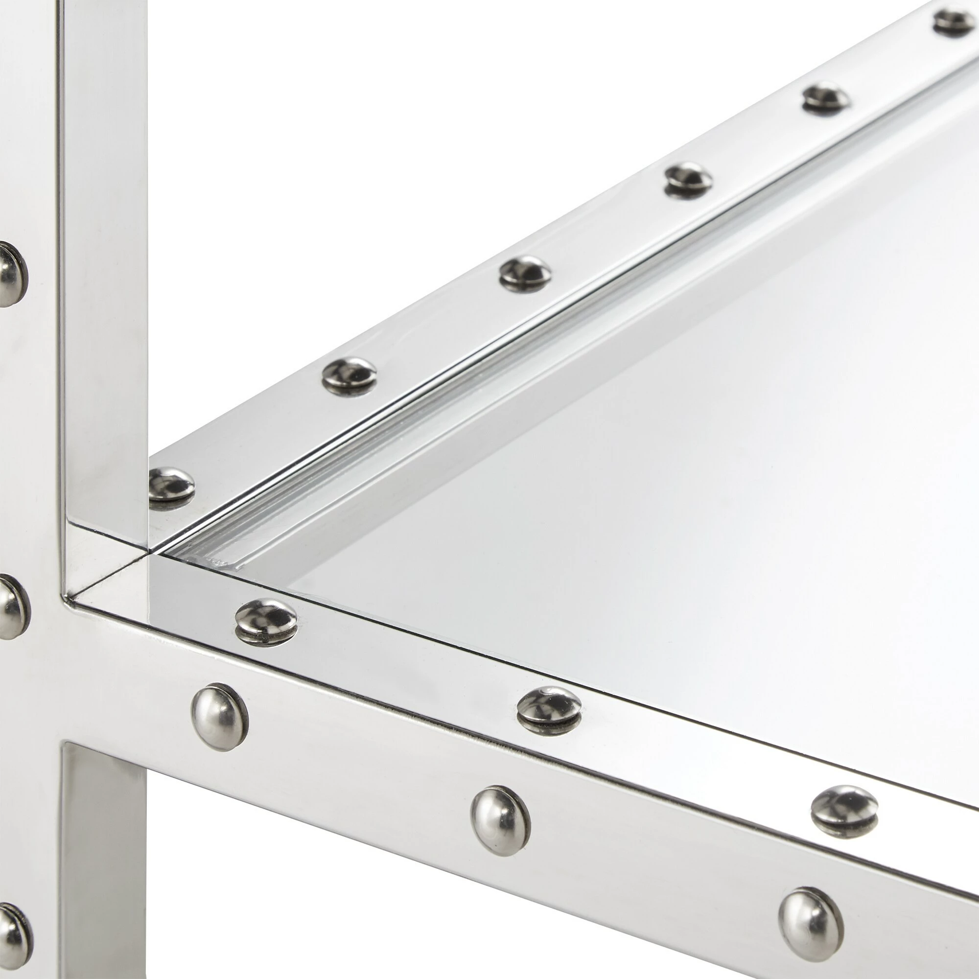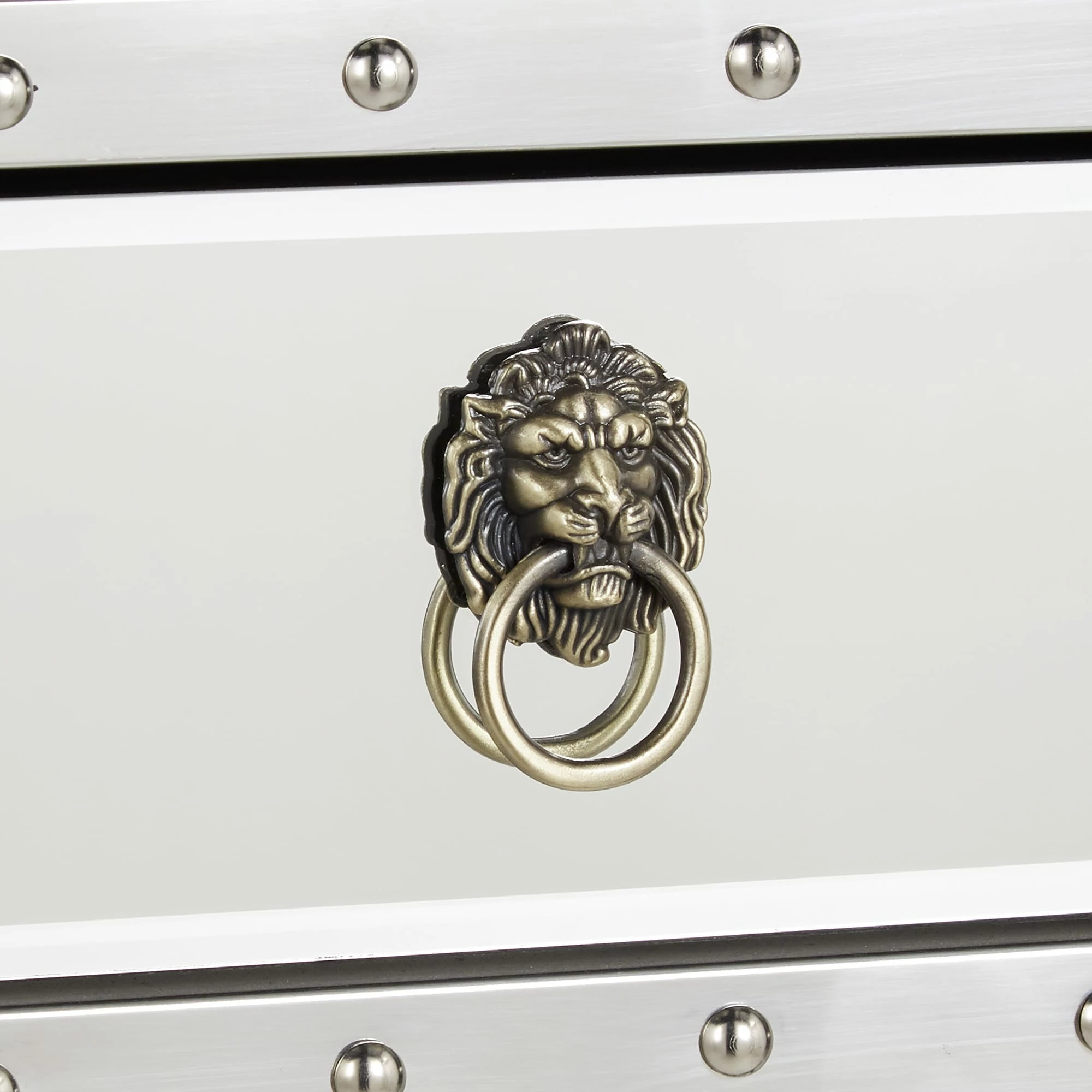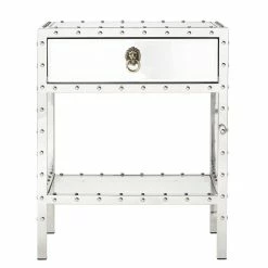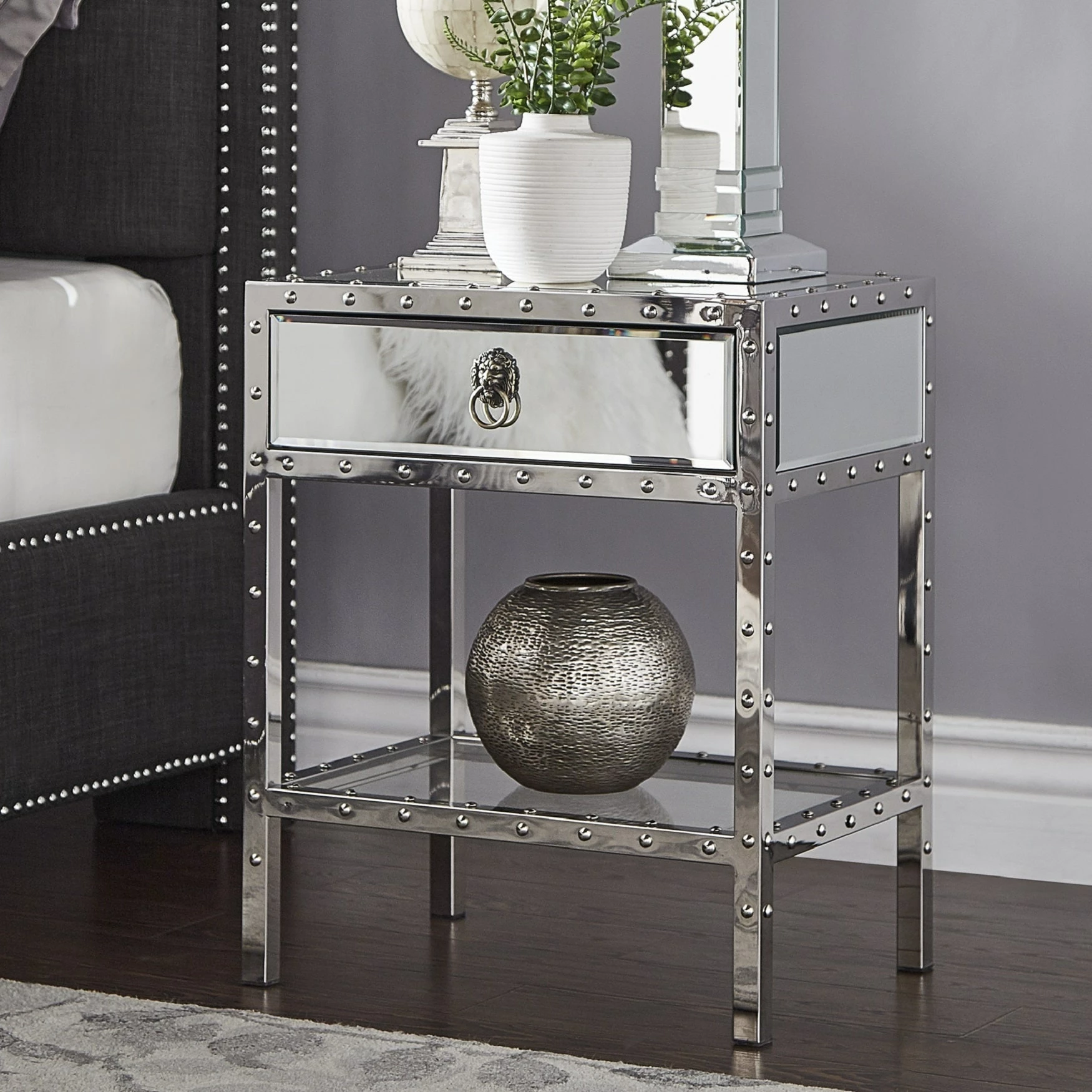 Add a glamorous accent to your home with the Carter Riveted Stainless Steel Mirrored Accent Table by iNSPIRE Q® Bold. This accent table features industrial inspired rivet details on the sturdy stainless-steel frame. The top and sides all feature beveled mirrors for added glitz and glamour. The sturdy glass shelf allows you to display your favorite home décor, while a spacious drawer stores all your essentials. The ornate lion head ring pull lets you open and close your drawer with ease and adds a touch of elegance. Add dazzling style to your space with this bold piece that lasts.