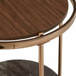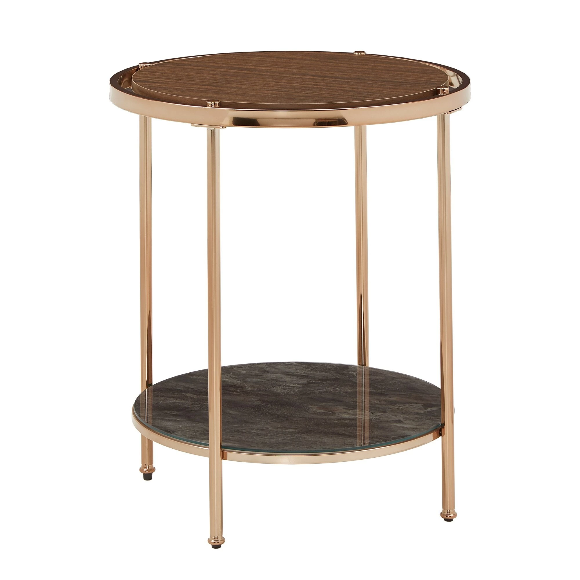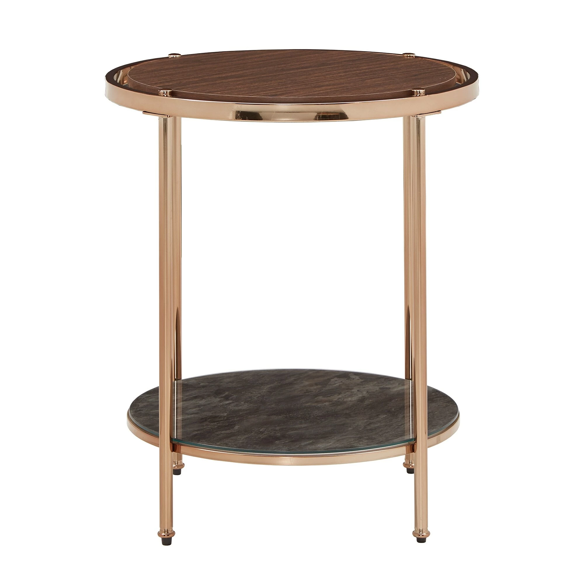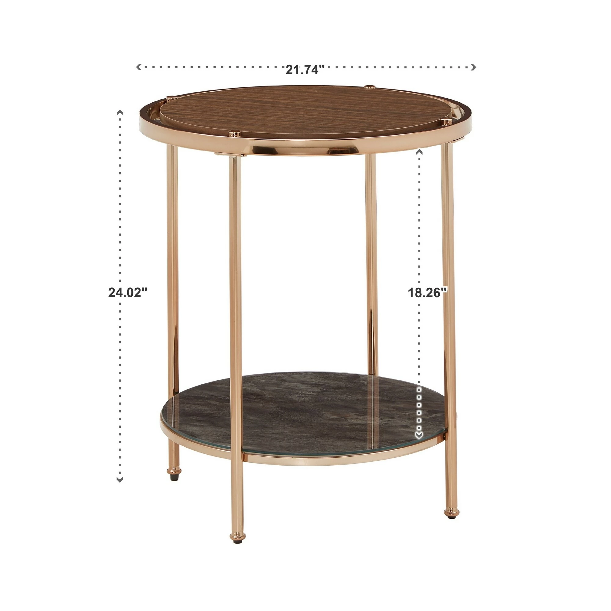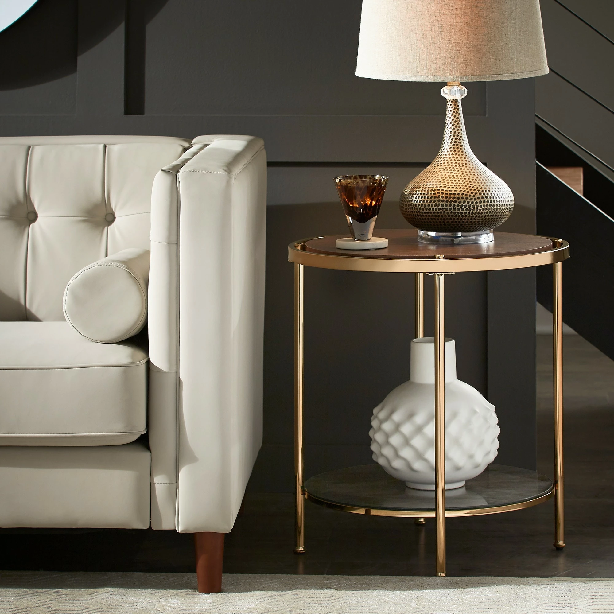 The iNSPIRE Q Champagne Gold End Table with Storage adds an upscale, glam vibe to your living space. Glitzy style is displayed through the shiny, champagne gold metal circular silhouettes and four legs, while the dark marble glass mirrored bottom shelf provides a beautiful spot to display your favorite home decor items. The walnut wood finished tabletop adds unique, contrasting detail that effortlessly compliments the overall theme of the table.