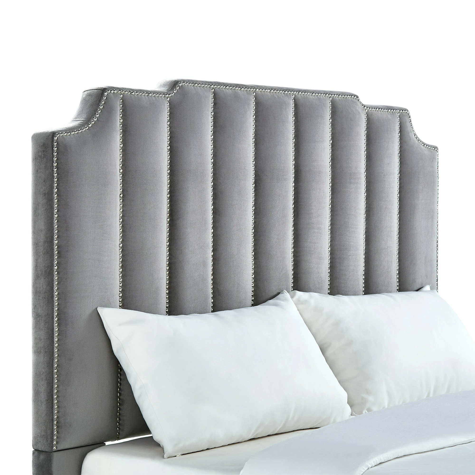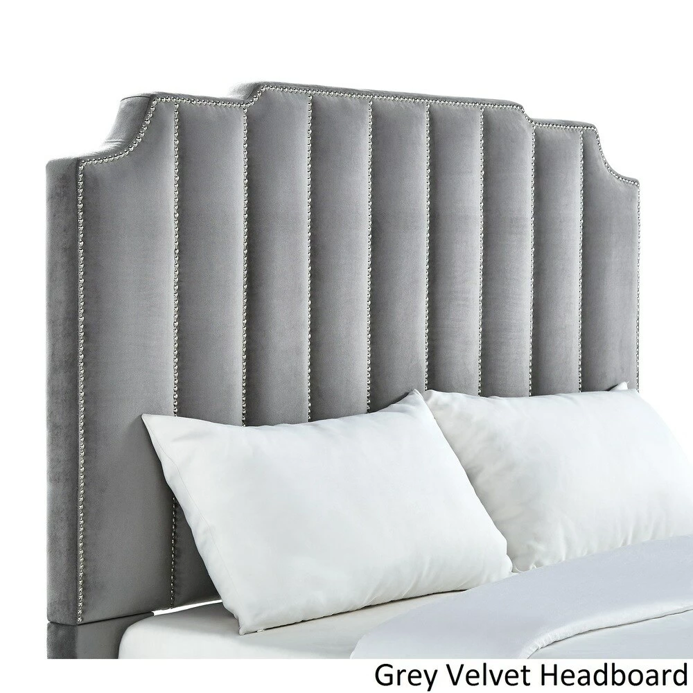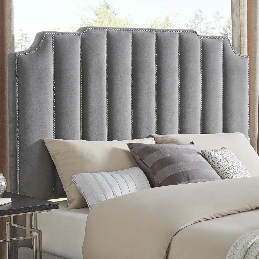 Pamper yourself with this opulent headboard. Showcasing gleaming nailhead trim and vertical channel tufting, this headboard features grey velvet upholstery for understated elegance that blends smoothly with your current color scheme. The versatile design is compatible with most metal frames, offering you simple, hassle-free installation.