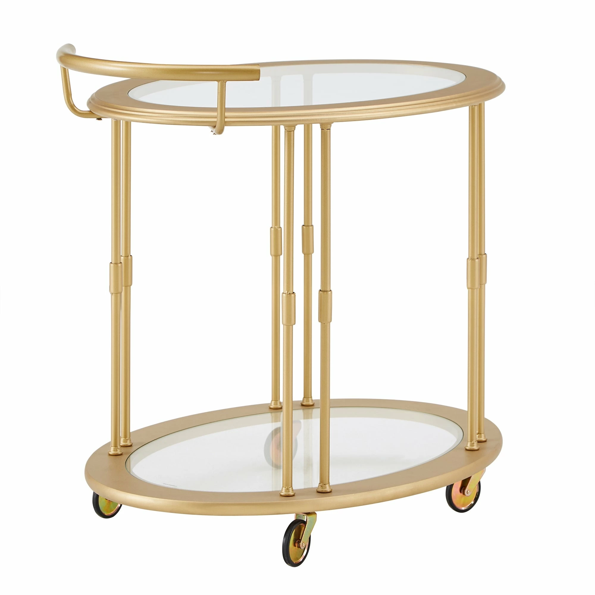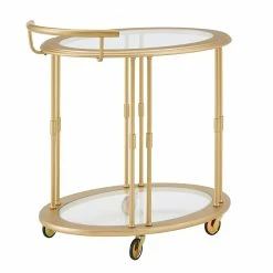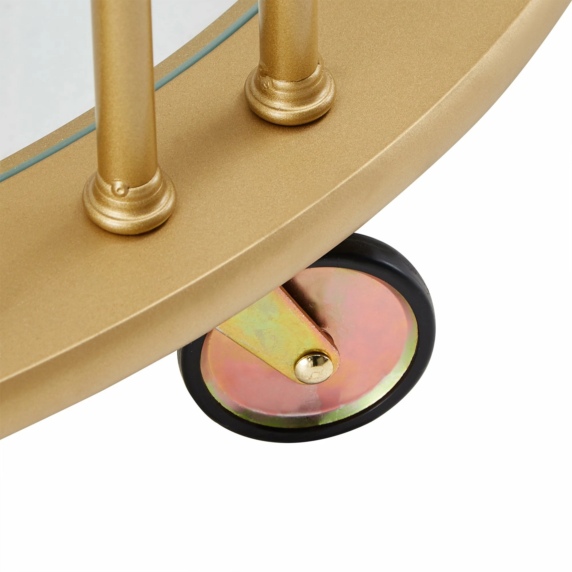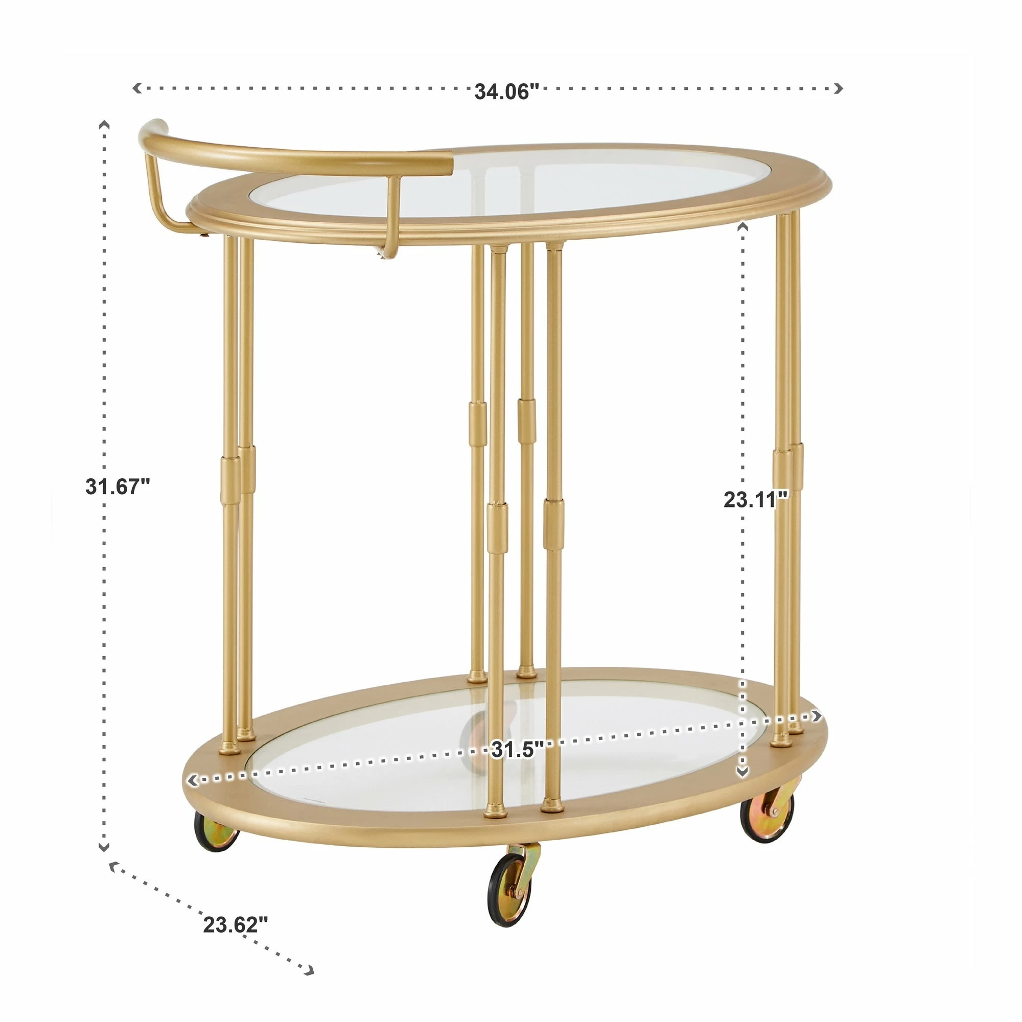 Upgrade your entertainment and at-home party experience with this elegant and sturdy Gold Finish Oval Bar Cart. The gold glass top and bottom shelf offer the perfect spot to keep and display glassware and other cocktail accessories. The gold finish metal frame displays a unique and eclectic design. This convenient piece will make your next party an absolute success with casters for mobility!