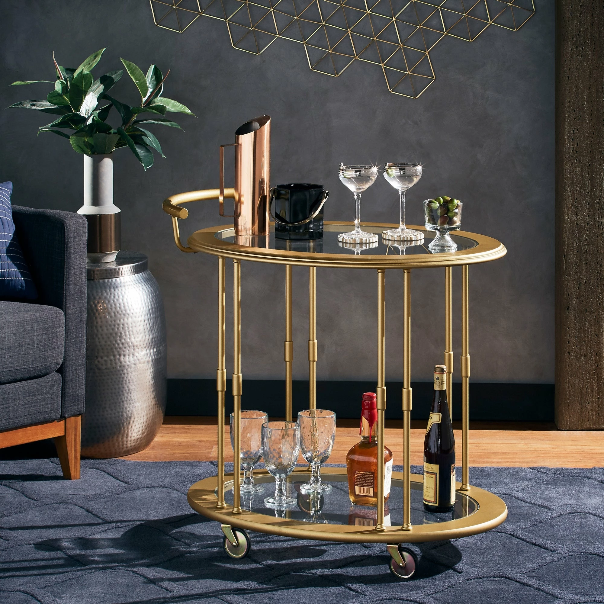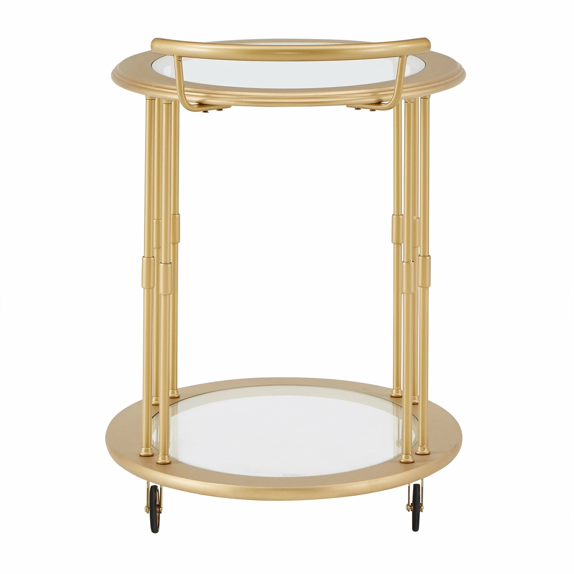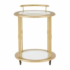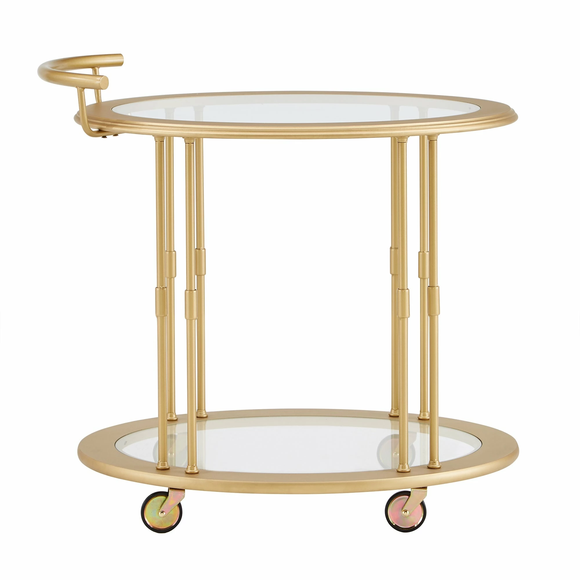 Upgrade your entertainment and at-home party experience with this elegant and sturdy Gold Finish Oval Bar Cart. The gold glass top and bottom shelf offer the perfect spot to keep and display glassware and other cocktail accessories. The gold finish metal frame displays a unique and eclectic design. This convenient piece will make your next party an absolute success with casters for mobility!
