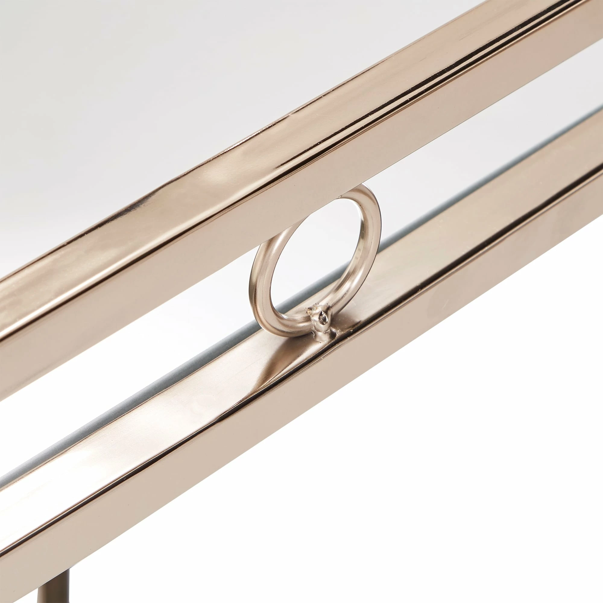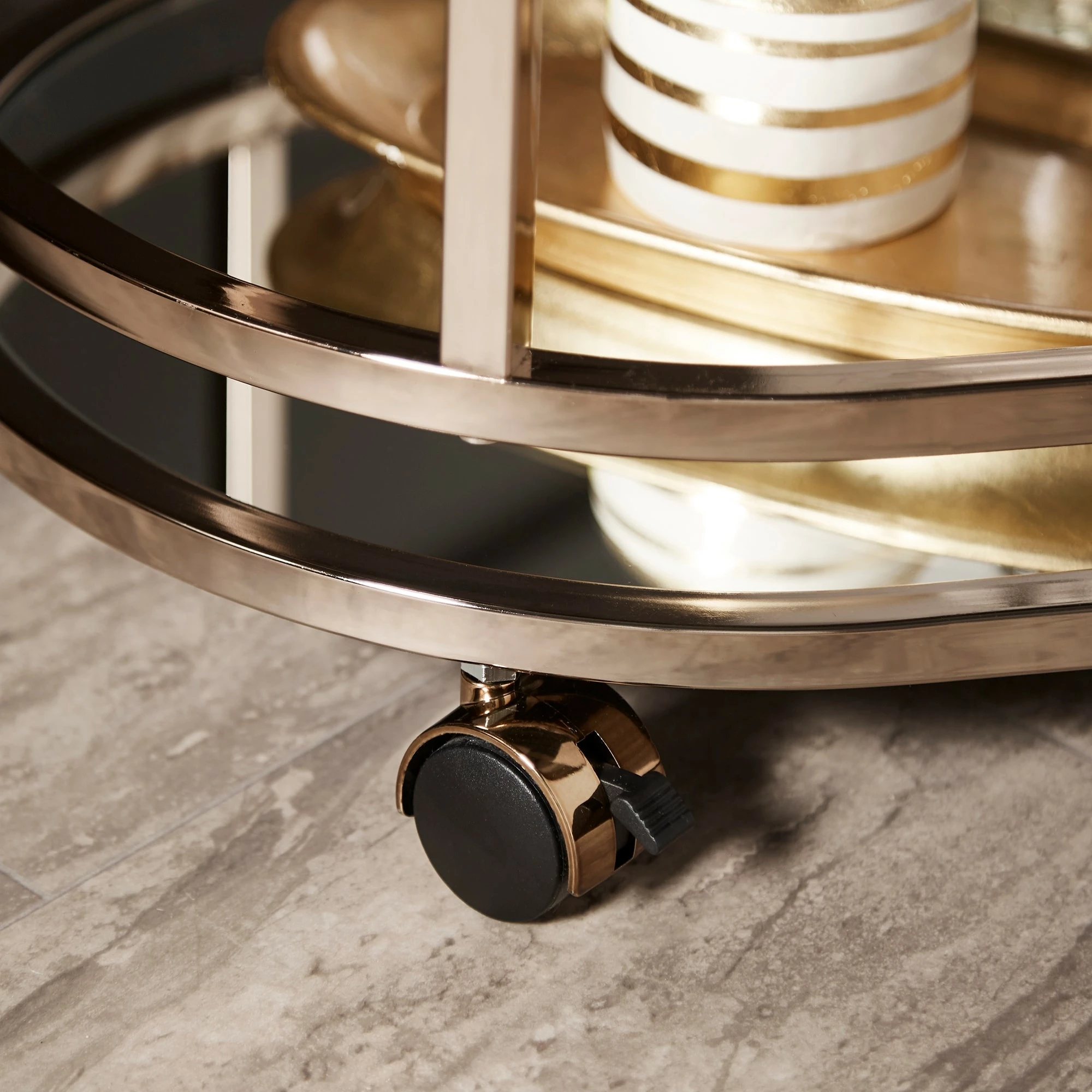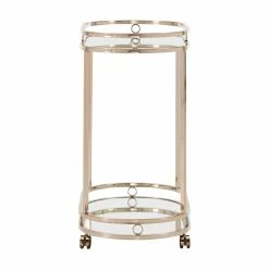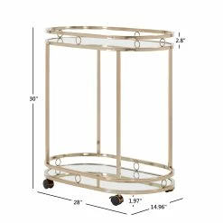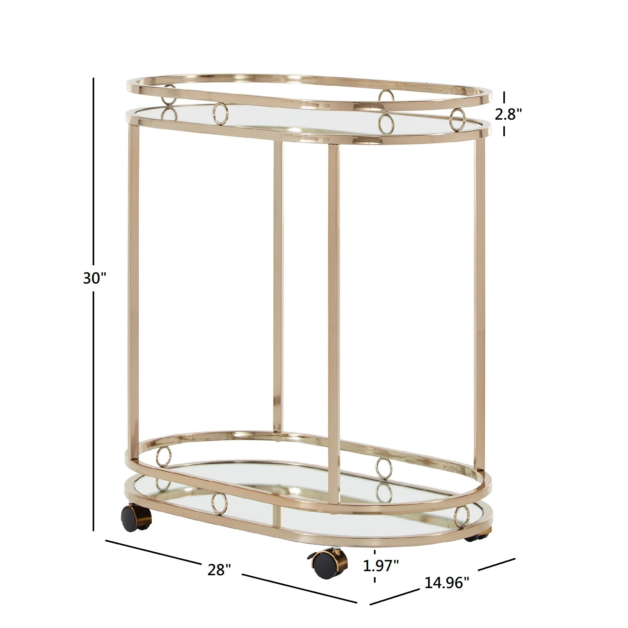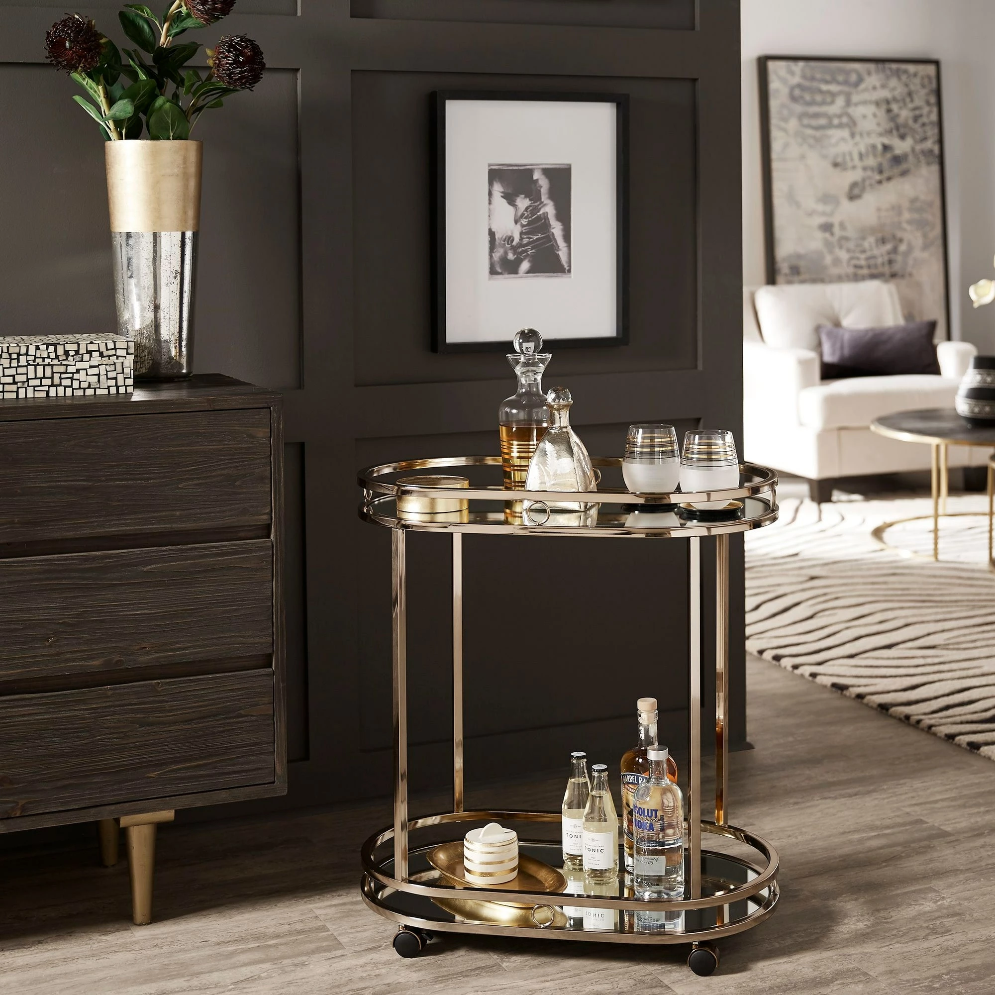 Set the stage for a glitzy, roarin’ 20s look within your living space with the iNSPIRE Q Chesley champagne gold oval bar cart. This beautiful cart is the perfect place to keep all your party and cocktail essentials with it’s mirrored top and bottom shelves. A glistening, champagne gold metal frame ties the cart’s design together perfectly by adding a timeless, glam look to your home’s décor, while caster wheels allow the cart to be easily maneuvered from room to room.
