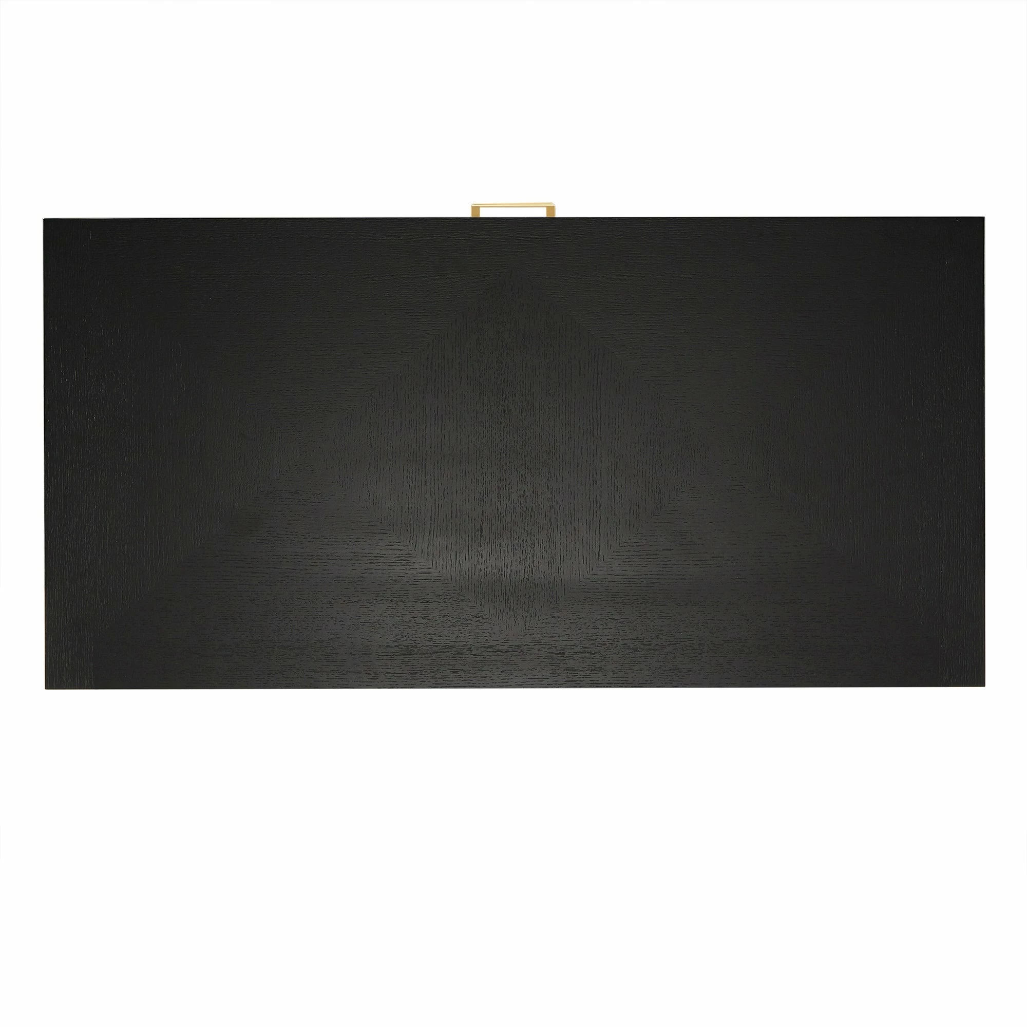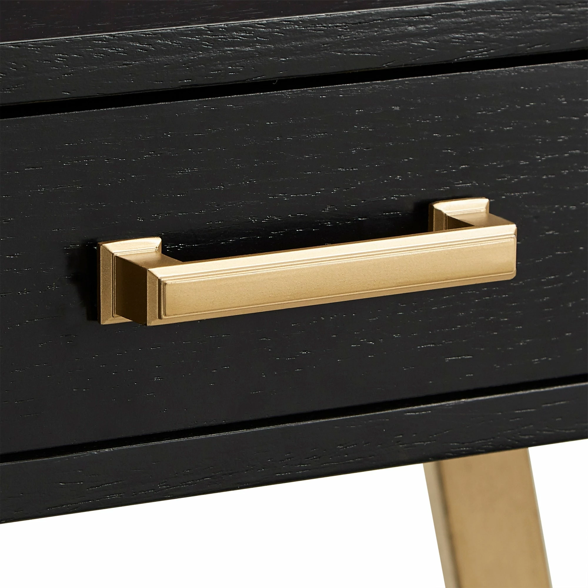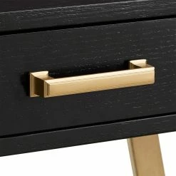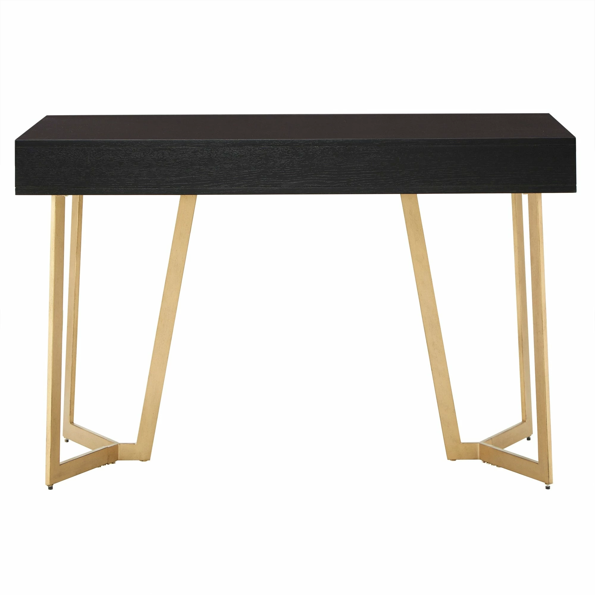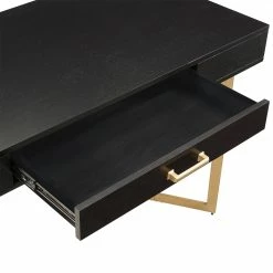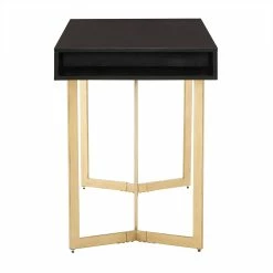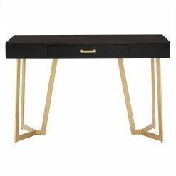 Display a bold and glam aesthetic in your home office work space with the iNSPIRE Q Cheyenne black and gold finish writing desk. This beautiful desk makes a dramatic statement as its black top contrasts with the metallic gold finish metal base. The smooth rolling and soft closing drawer provides ample storage. Generous openings on both sides of this desk are designed to provide additional storage.