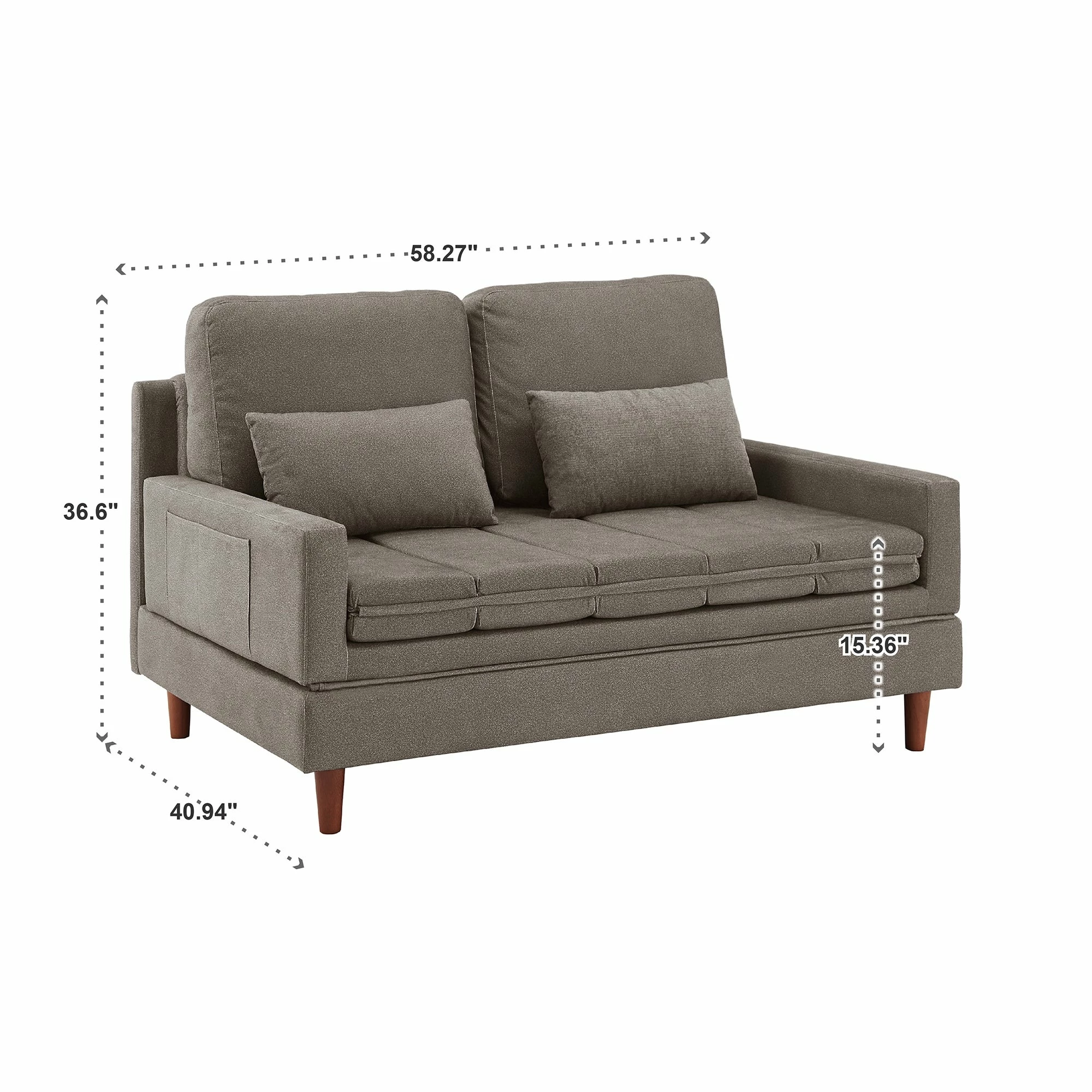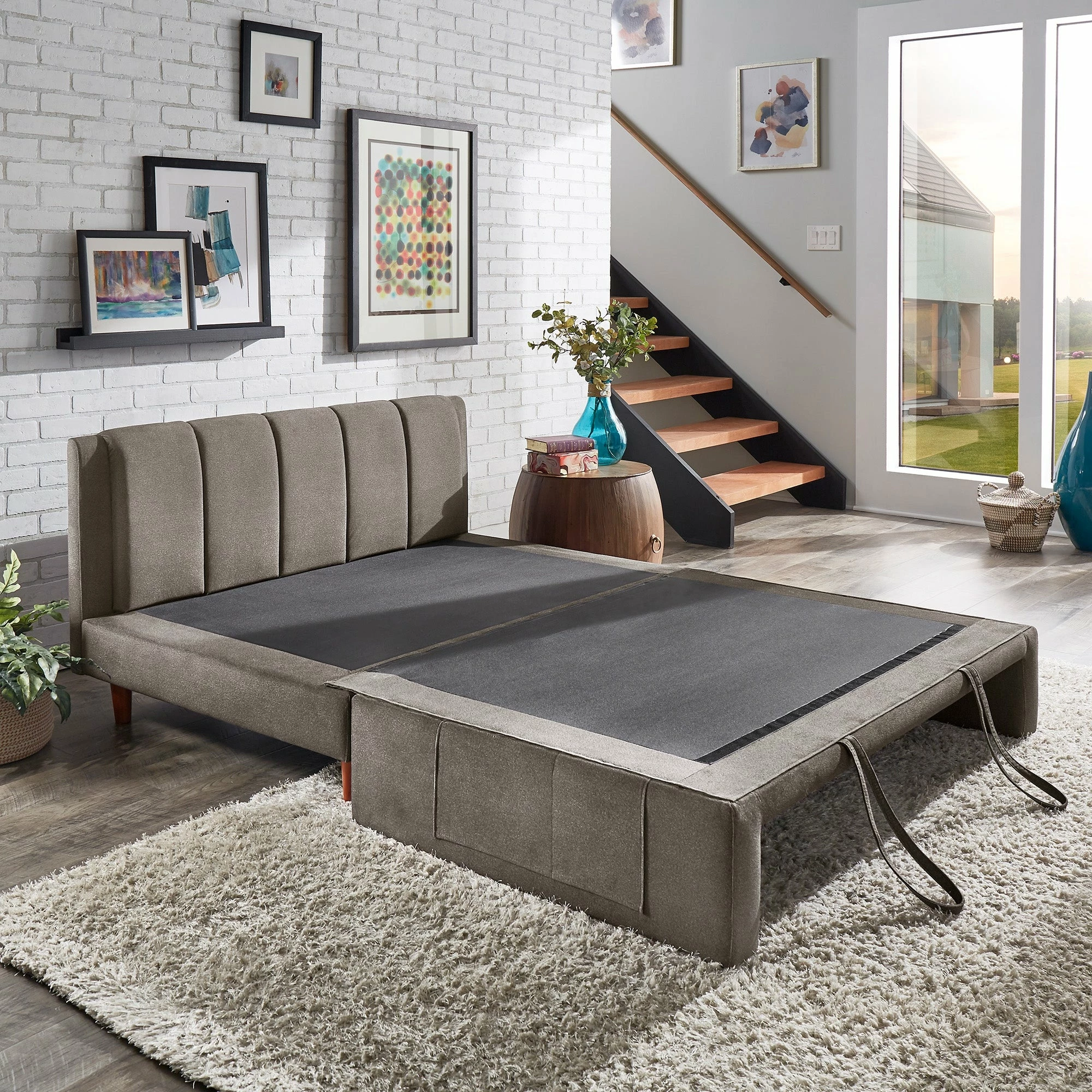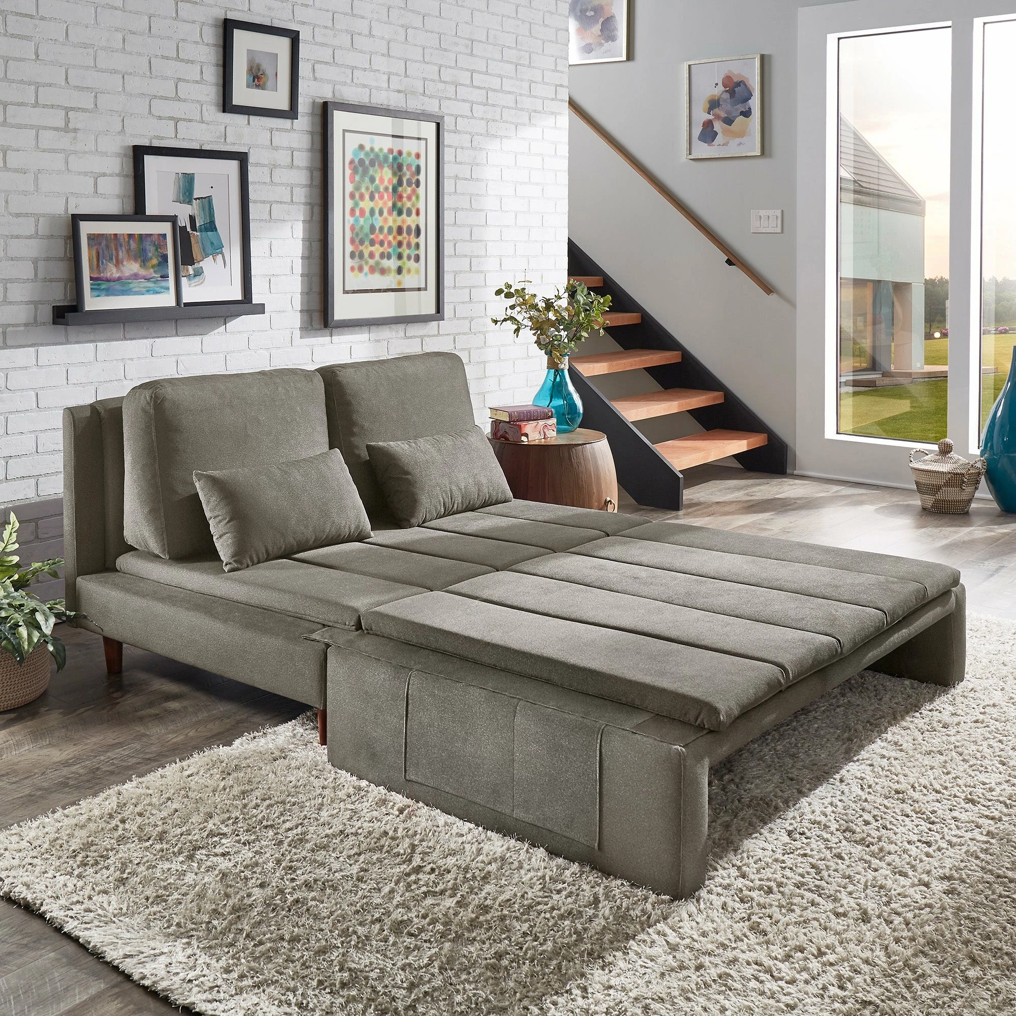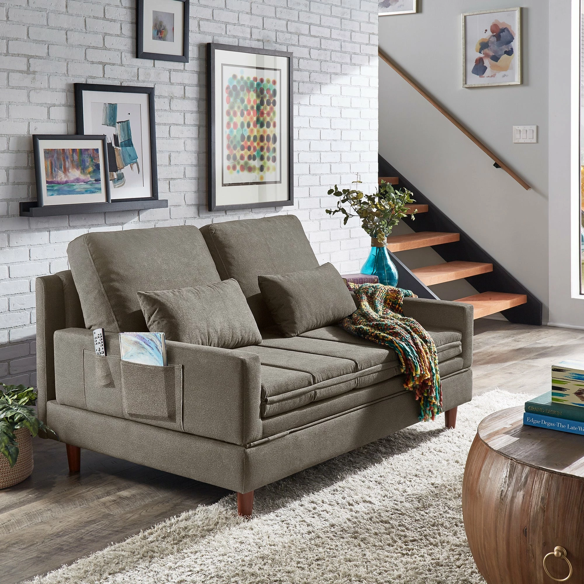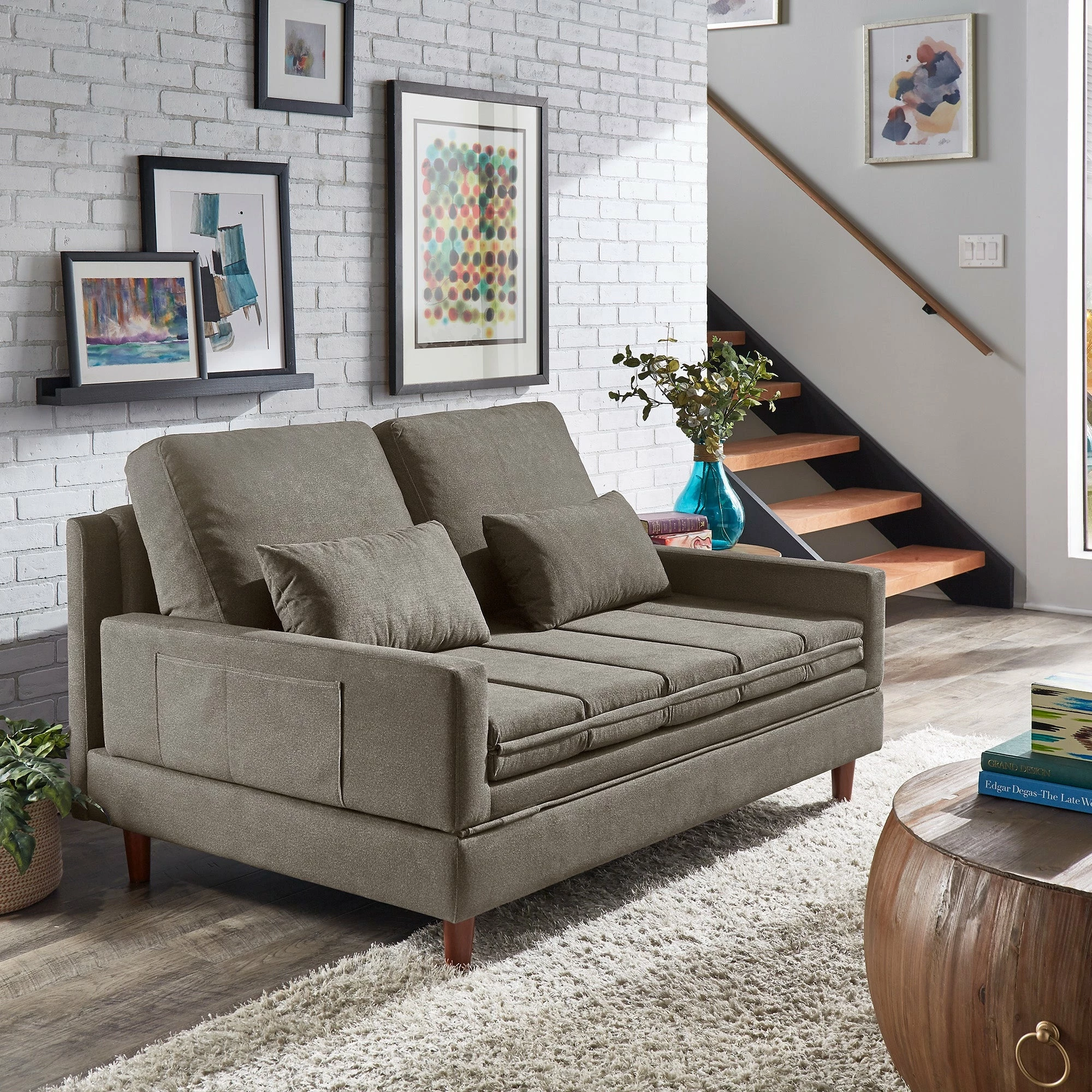 Deliver timeless style and modern functionality with the Cicero Grey Fabric Upholstered Convertible Settee by iNSPIRE Q Classic. This impressive piece features soft, grey, fabric-upholstered cushions on top of oak-finished peg legs. With the convertible design, this refined settee can be used both as a place to sit with friends or an extra spot to sleep for overnight guests.