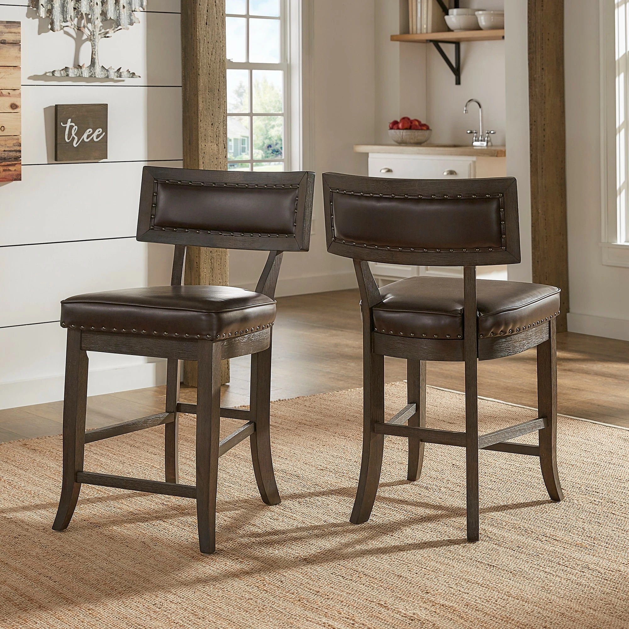 Keep your kitchen classic with the Colter Traditional Upholstered Dining Chair from the iNSPIRE Q Classic Collection. The sleek espresso finish and cozy faux leather cushions at counter height allows for both style and comfort to your kitchen or dining room. The rubberwood frame promises low maintenance and endurance, perfect for everyday use. Whether you are planning an elaborate three-course meal for the neighbors or a quick peanut butter and jelly sandwich for one at lunch, these chairs offer an industrial and chic style that fits all occasions.