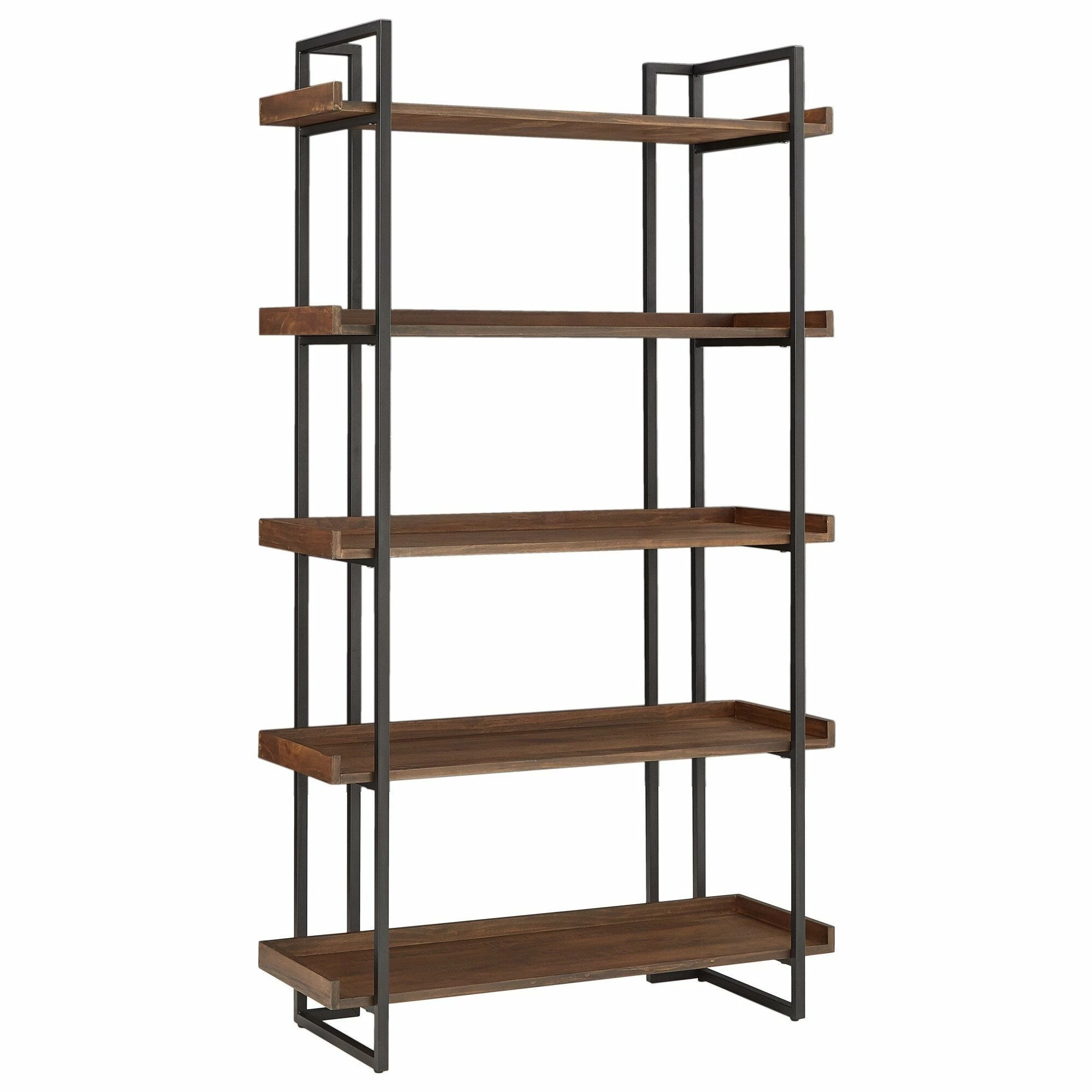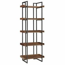 Work with modern rustic influences when you set up this etagere bookcase. Black powder-coated metal framing strengthens this bookcase while creating a simple yet bold outline, and textured, woodgrain-finished shelving creates a stunning mix of materials plus ample, sturdy display space for books and décor.