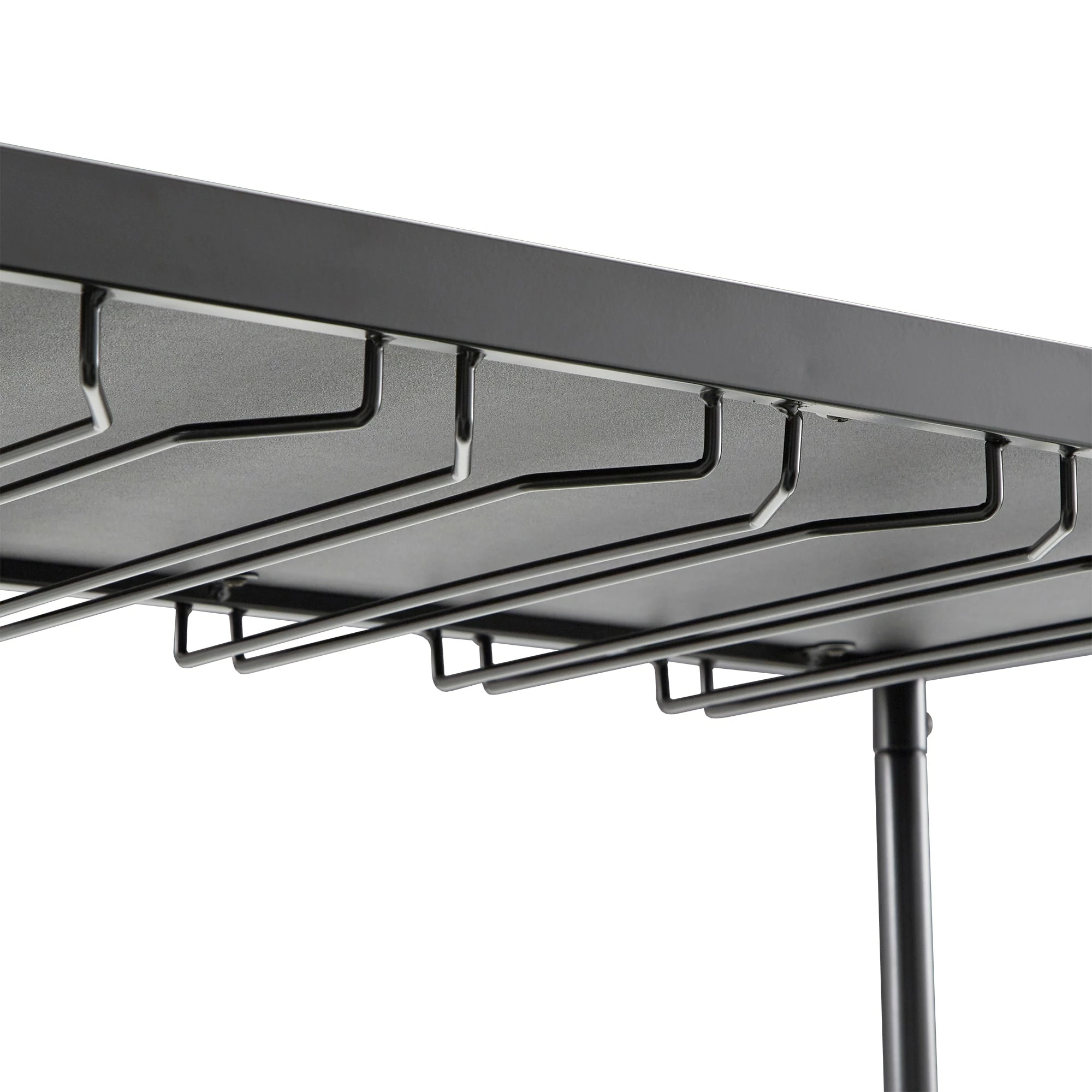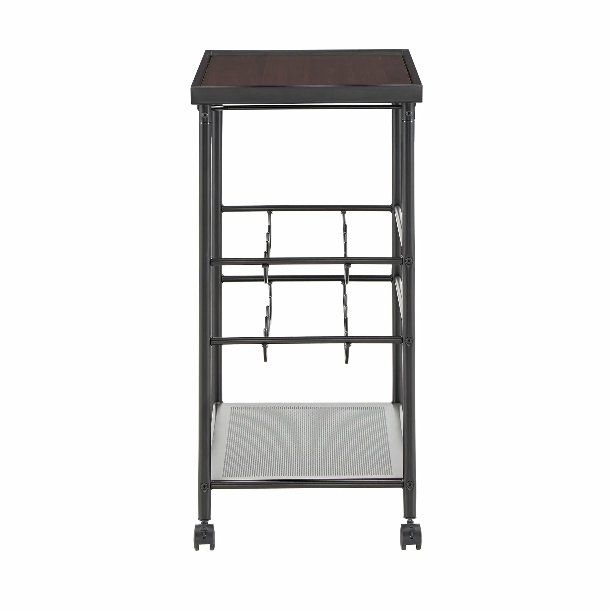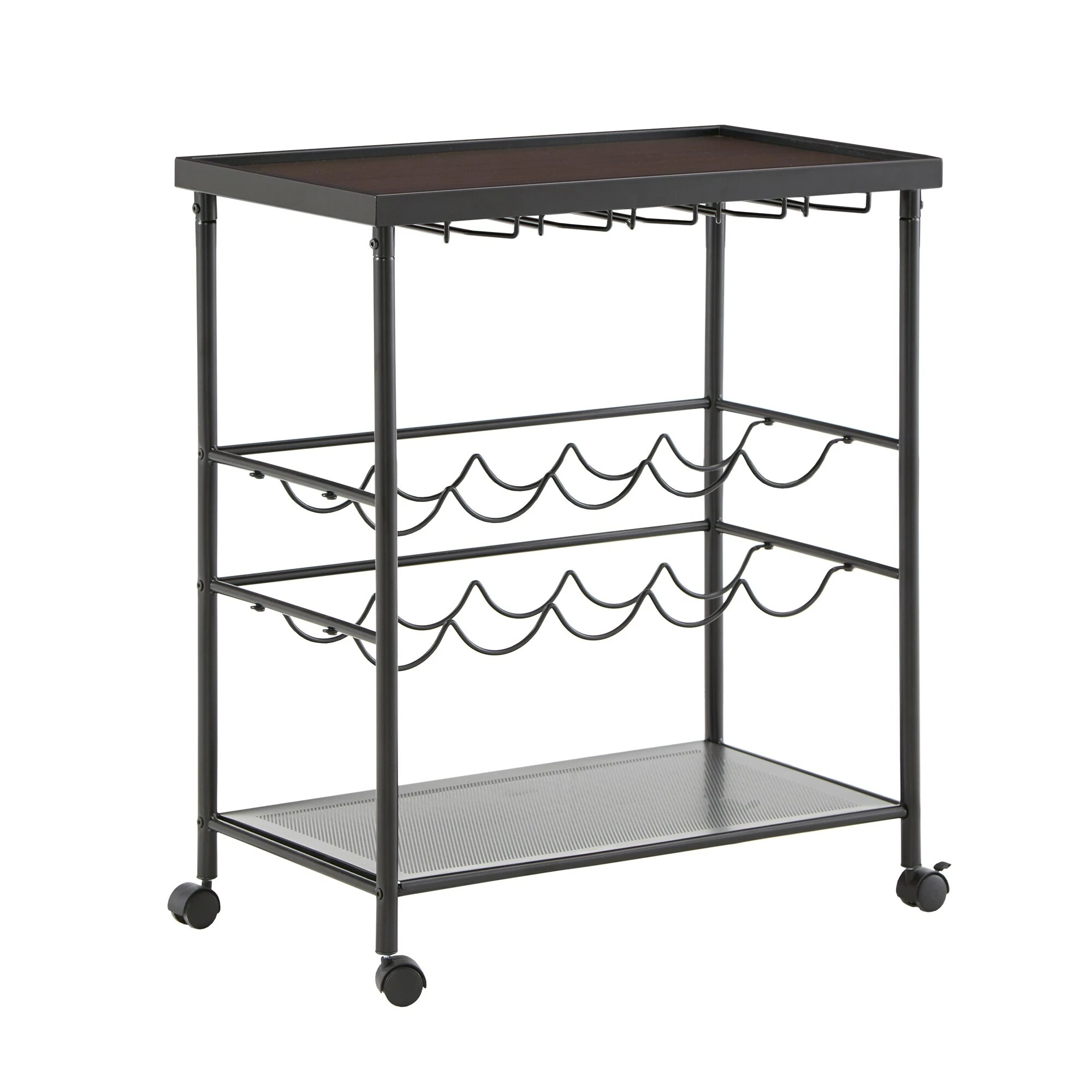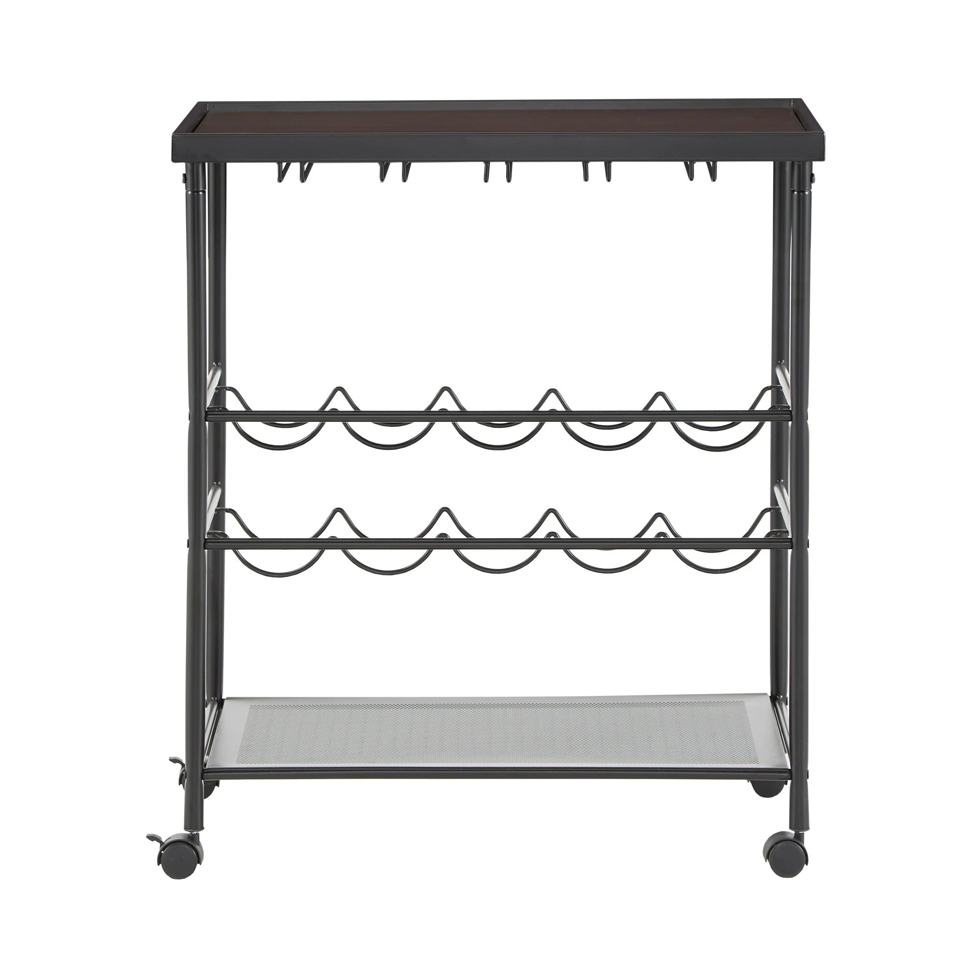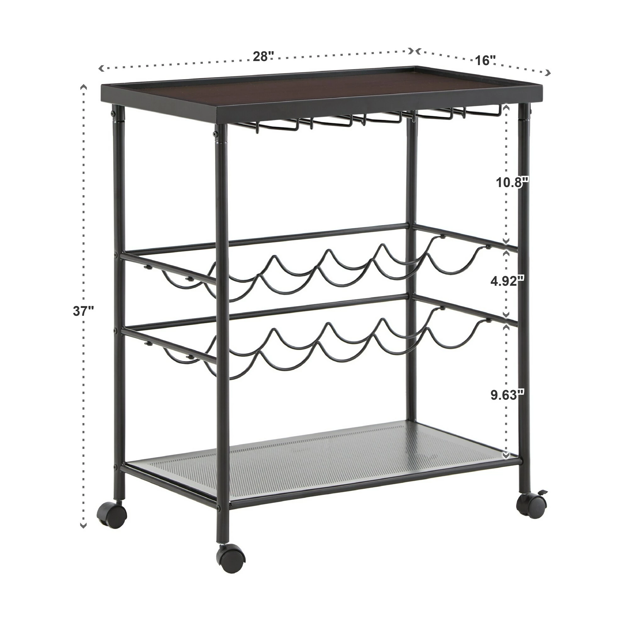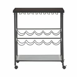Add some simple style and convenience to your home with the Crux Black Metal Wood Top Bar Cart from iNSPIRE Q Classic. Clean and sleek, this chic bar cart comes equipped with everything you need. Store all your bar essentials on the wine racks, stemware racks, lower open shelf, and wood top. This versatile piece is founded on caster wheels, so you can take the party with you wherever you go.
