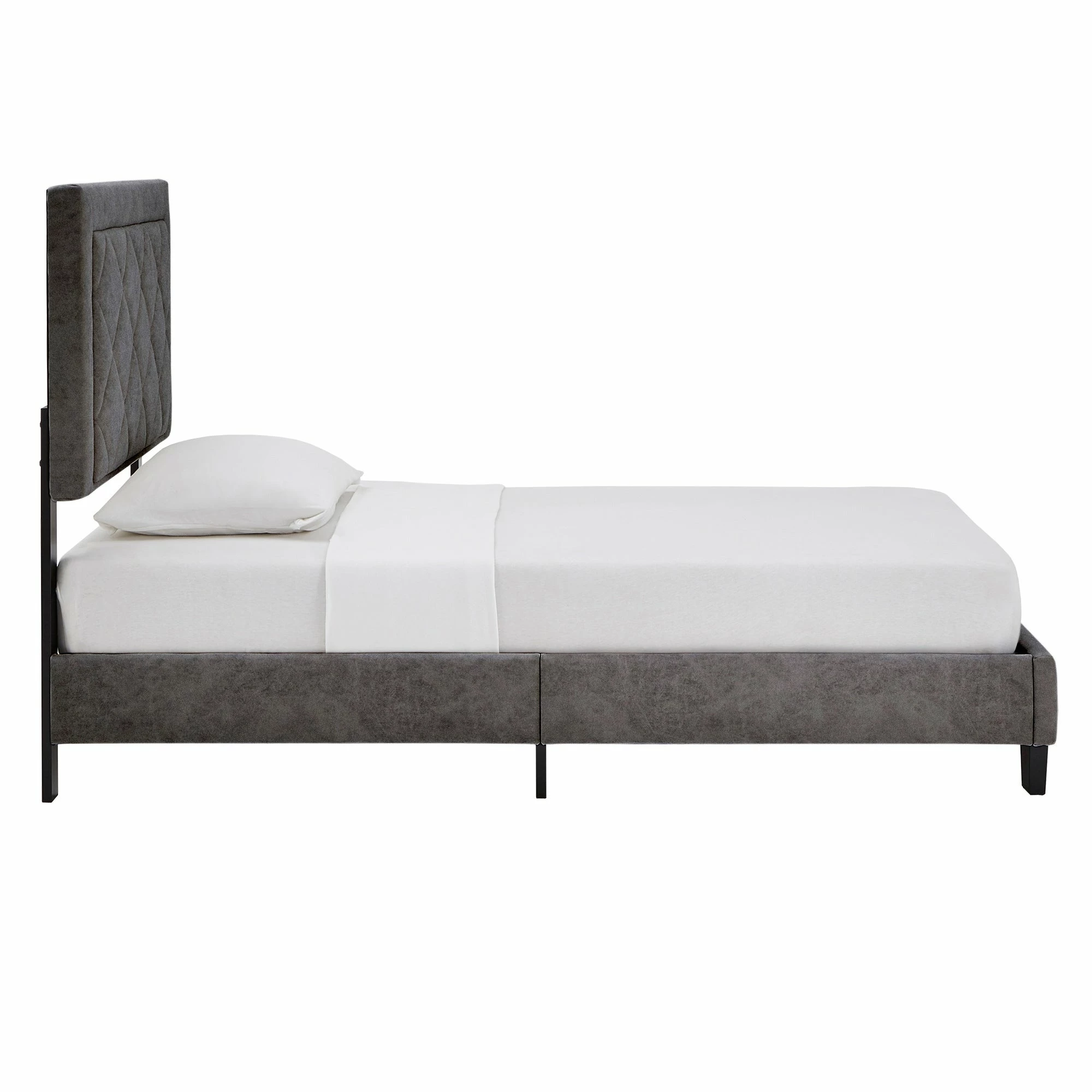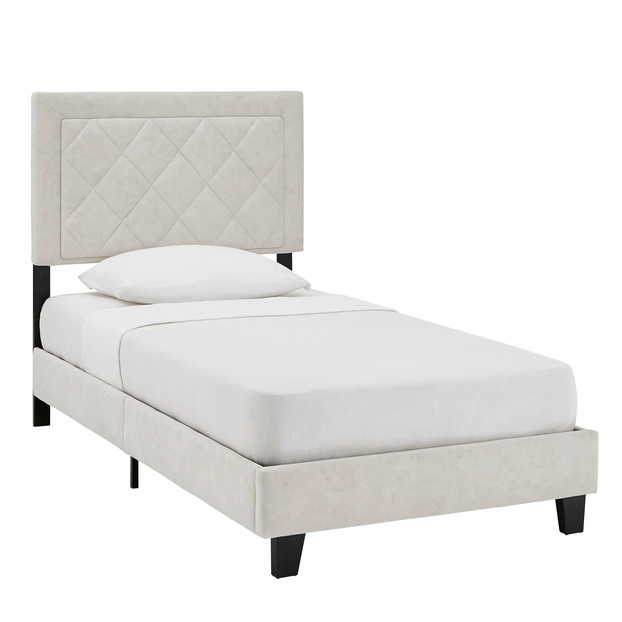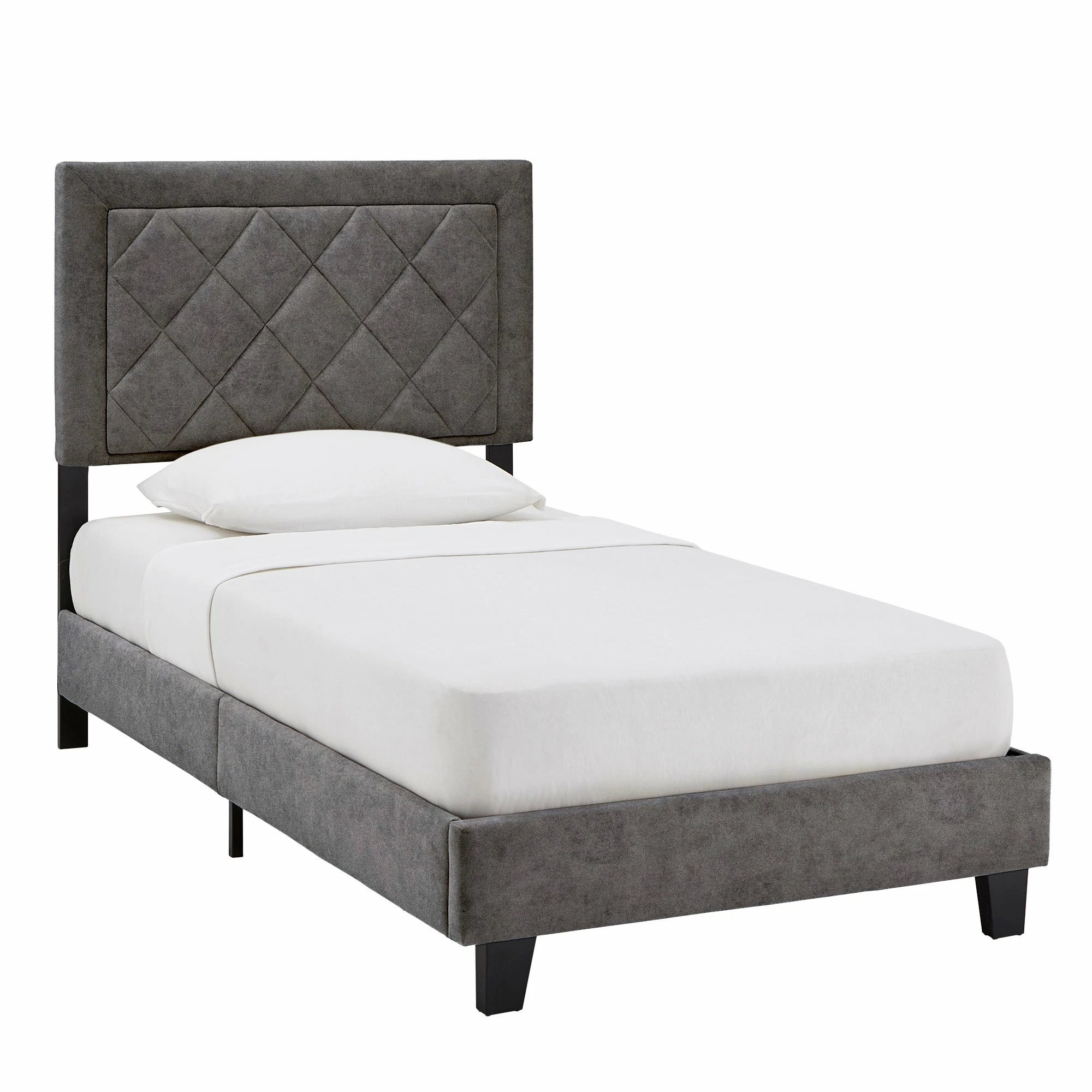 Bring some modern style and a cozy vibe to your slumber space with the iNSPIRE Q Black Finish Frame with Velvet Fabric Platform Bed With a unique and eye-catching design, this headboard features a contemporary diamond checker tufted pattern. The soft fabric upholstery provides a comfortable feel to your bedroom, while the coordinating high profile footboard and side panels tie the bed’s structure together perfectly.