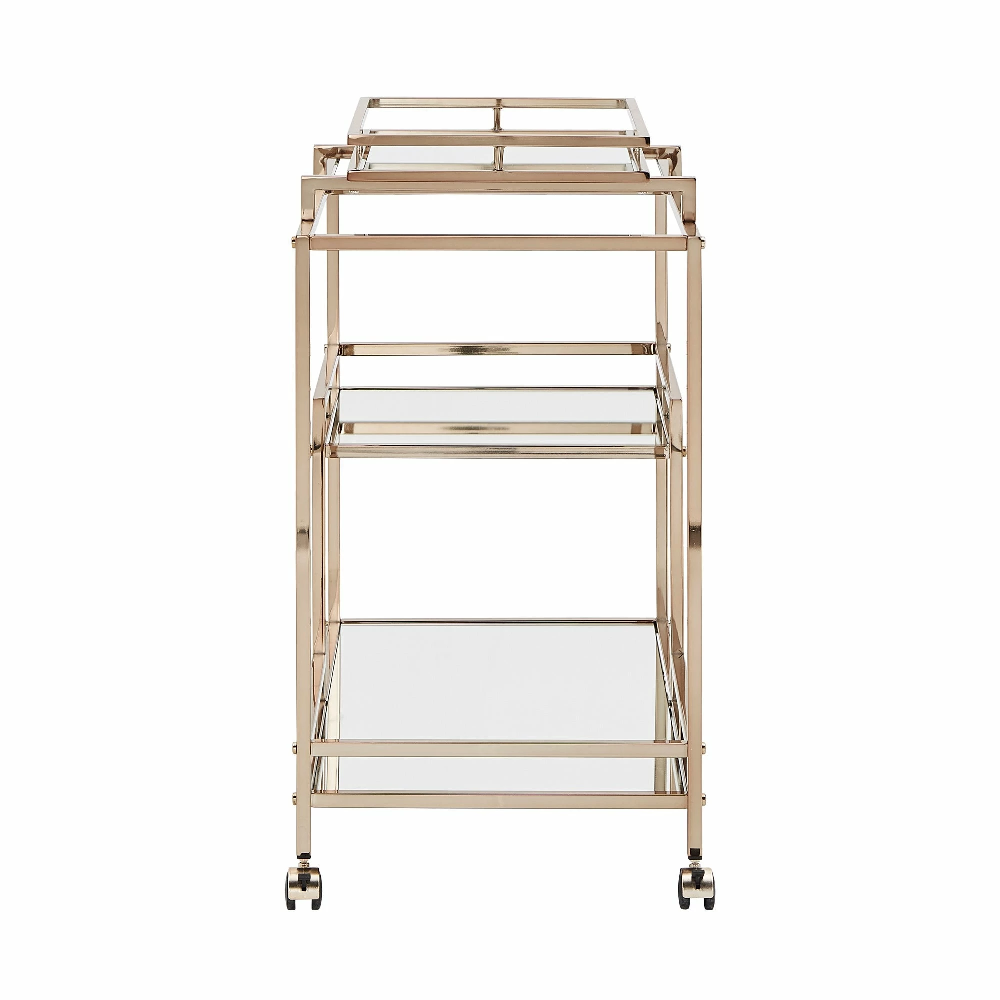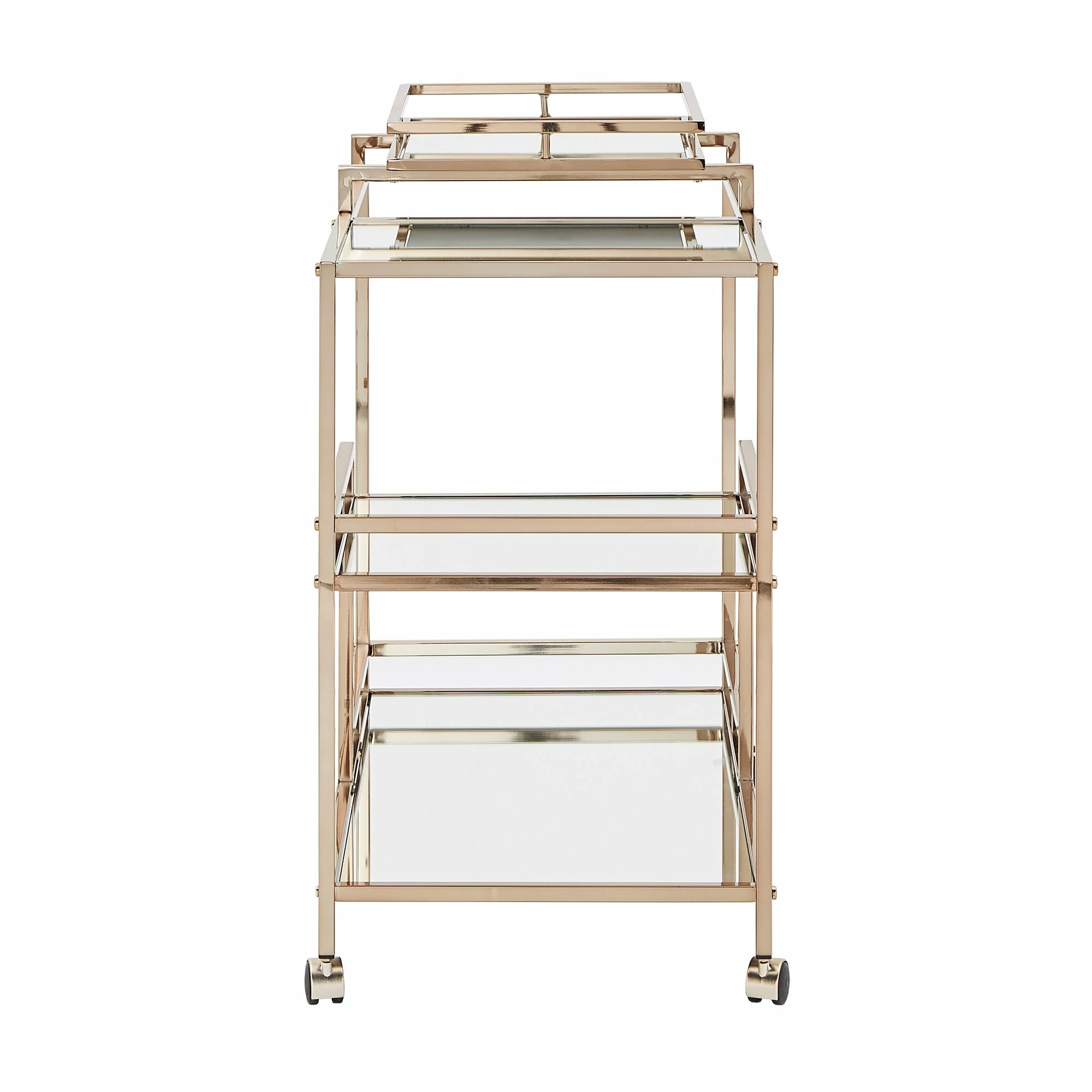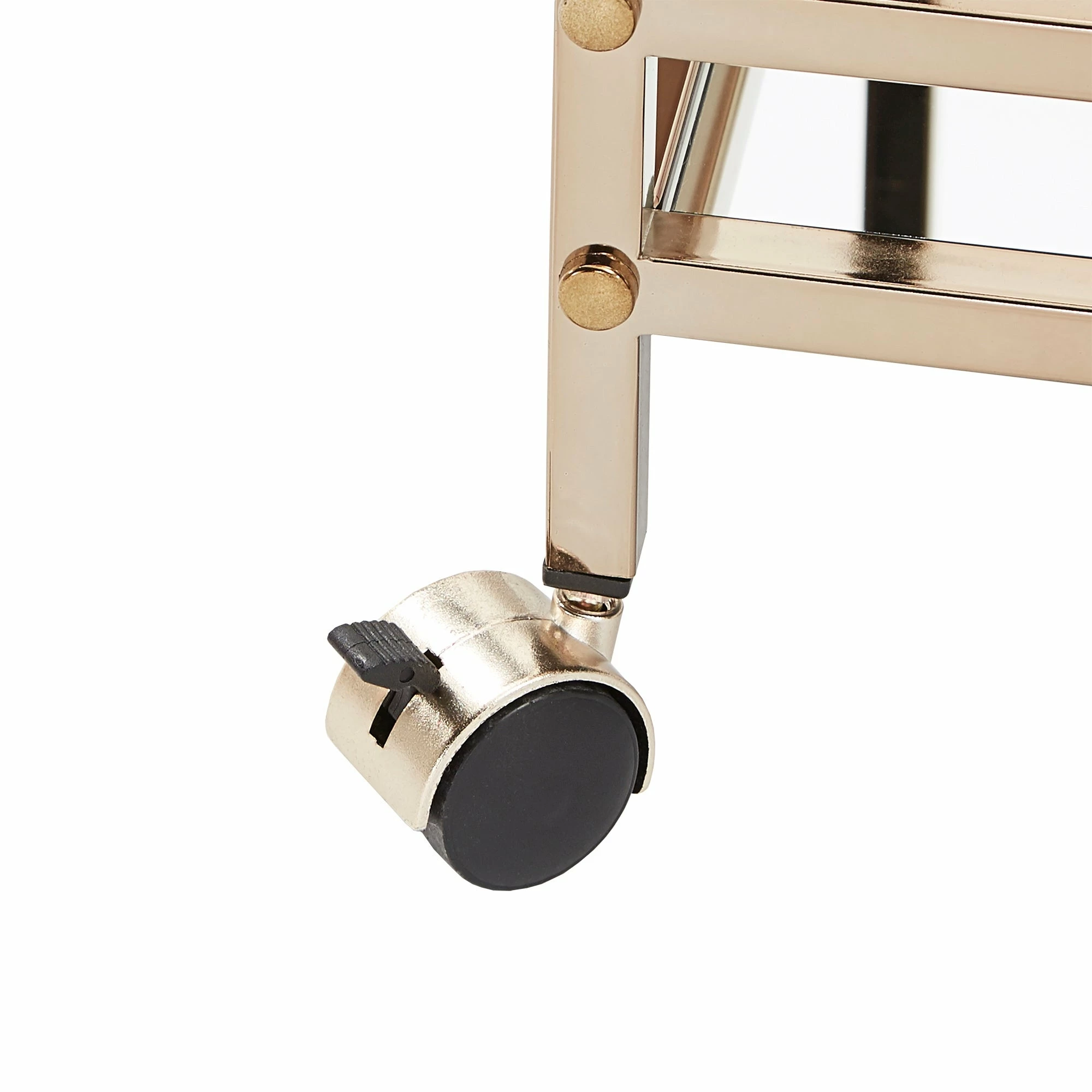 Dazzle your guests at your next dinner party with the Deblina Champagne Gold and Mirror Bar Cart by iNSPIRE Q Bold. Featuring a champagne gold-finished metal frame and mirrored shelves, this stunning piece is as versatile as it is stylish. The open shelves offer more than enough space to store any and all essentials. Four caster wheels on the bottom provide convenient mobility as you serve.