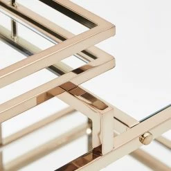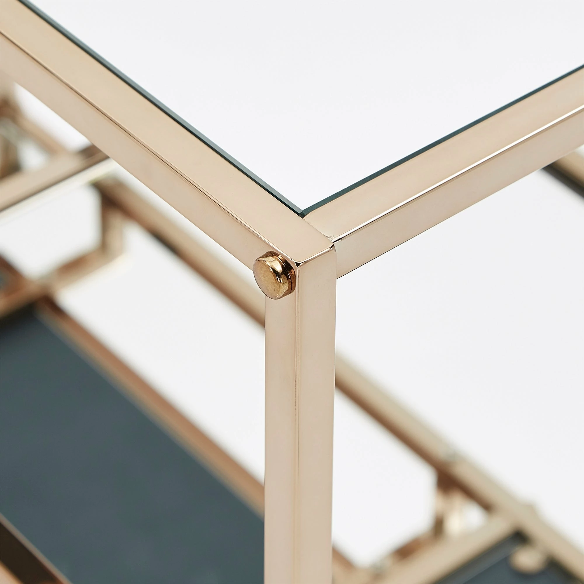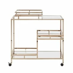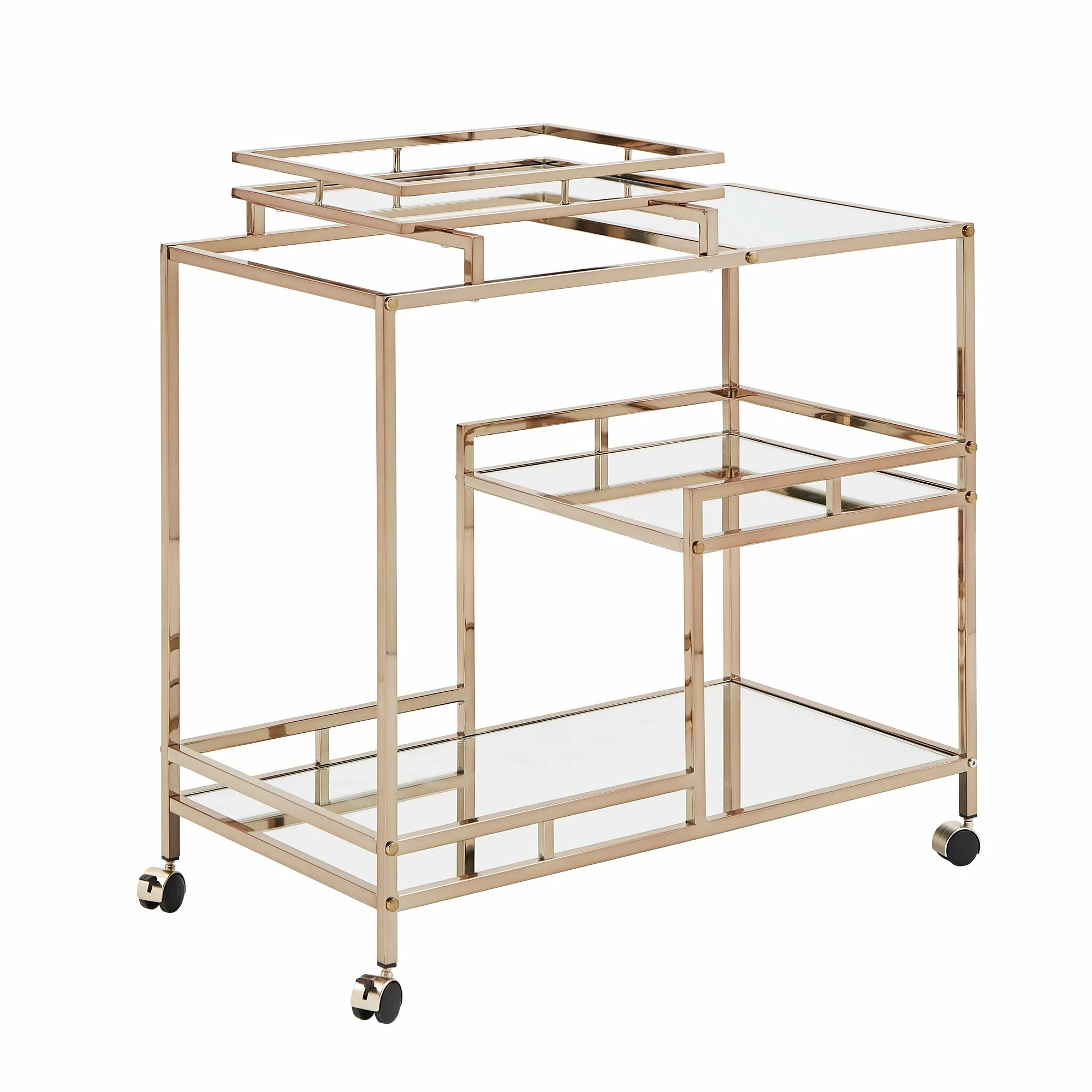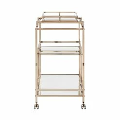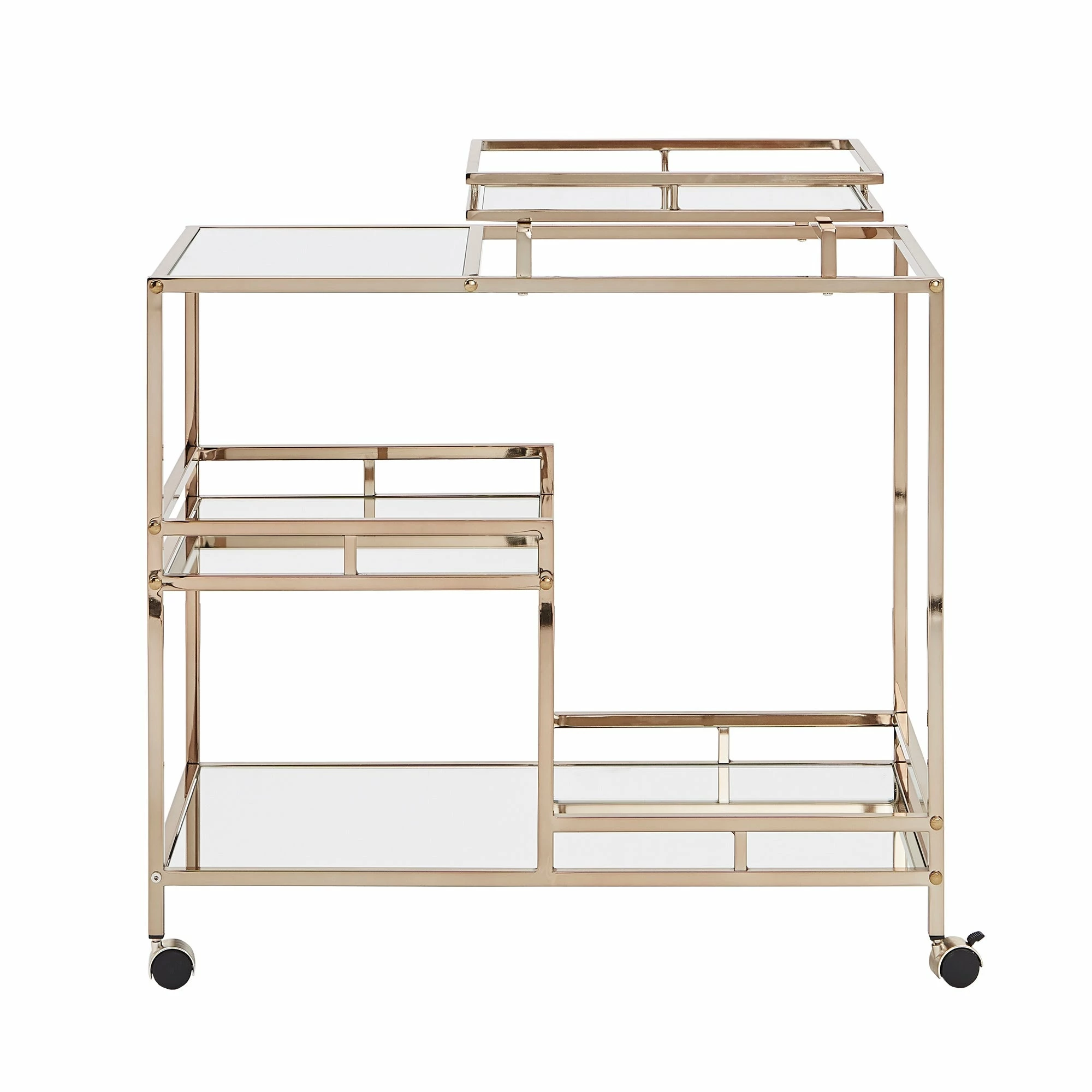 Dazzle your guests at your next dinner party with the Deblina Champagne Gold and Mirror Bar Cart by iNSPIRE Q Bold. Featuring a champagne gold-finished metal frame and mirrored shelves, this stunning piece is as versatile as it is stylish. The open shelves offer more than enough space to store any and all essentials. Four caster wheels on the bottom provide convenient mobility as you serve.