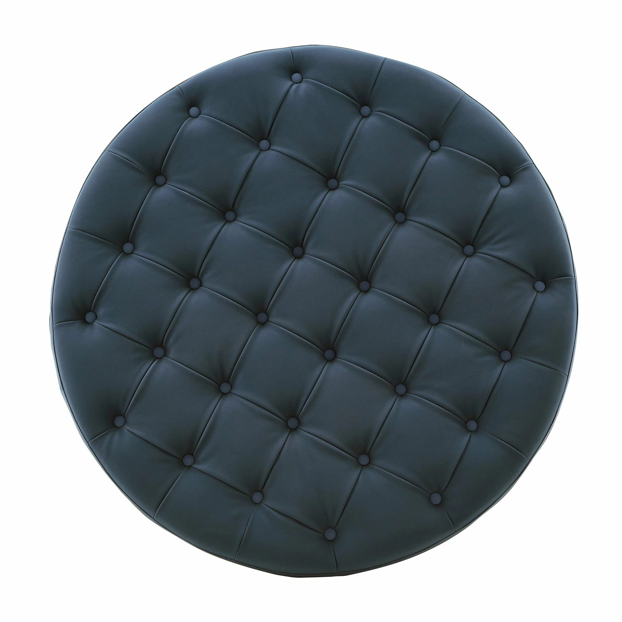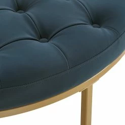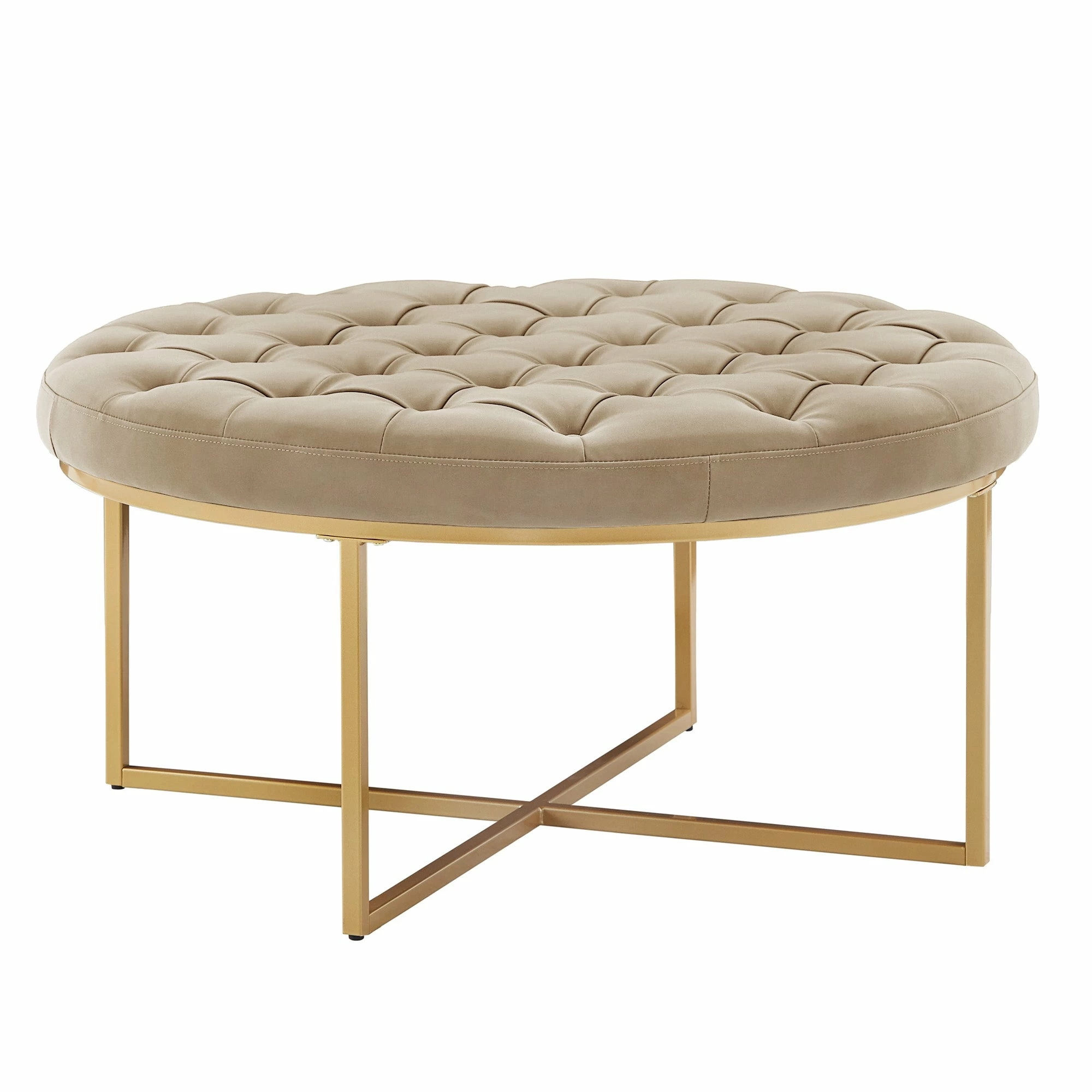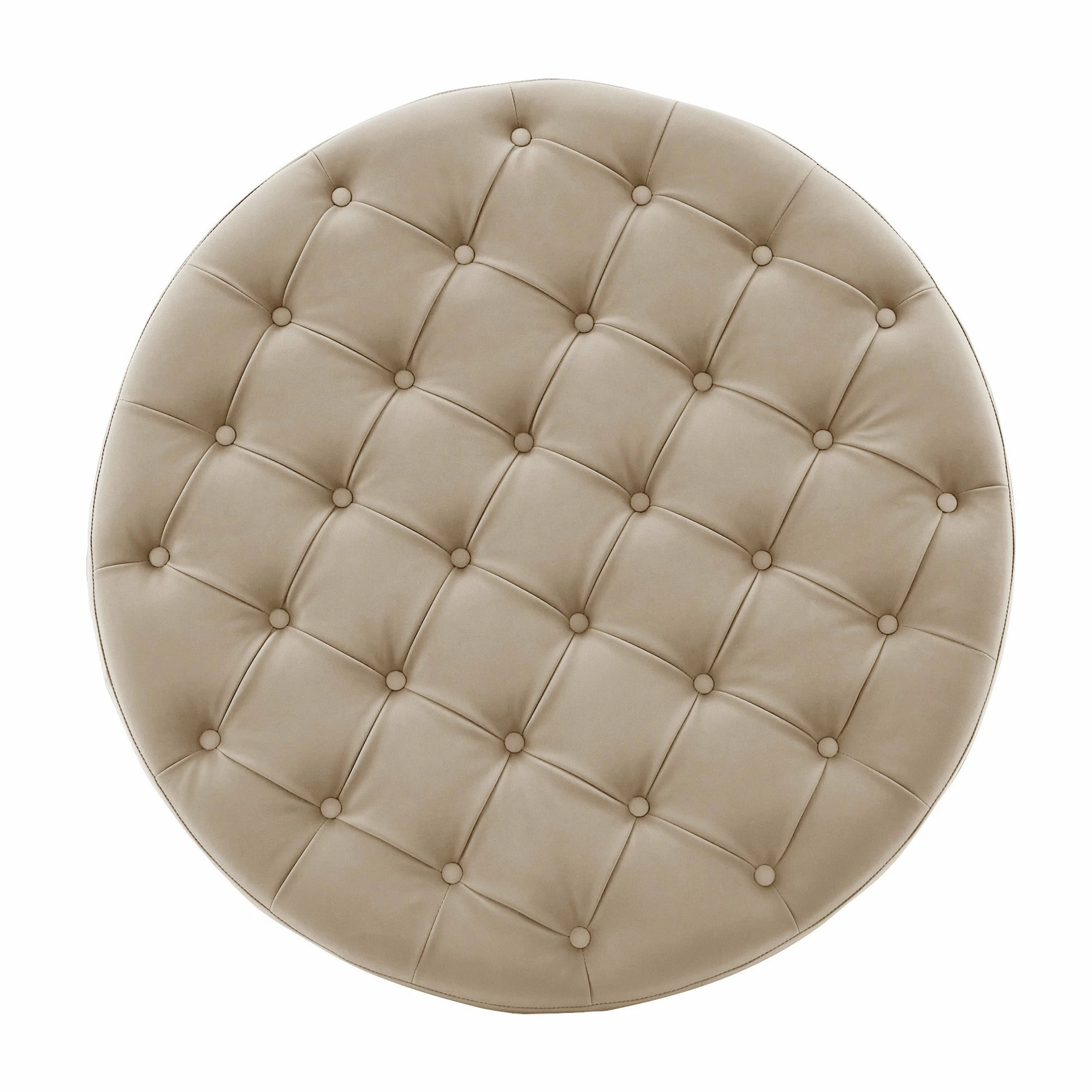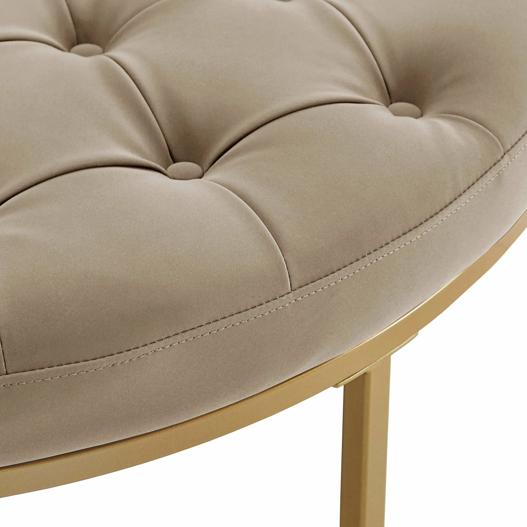 Create an upscale vibe in your home with the Devin Faux Leather Round Tufted Ottoman by iNSPIRE Q Modern. Showcasing a sleek silhouette, this contemporary piece does not sacrifice style or comfort. The cushioned top is upholstered and button tufted with supple polished faux leather with a suede feeling and a matte look, perfect for relaxation. A gold-finished metal base provides a reliable foundation and a glamorous touch.