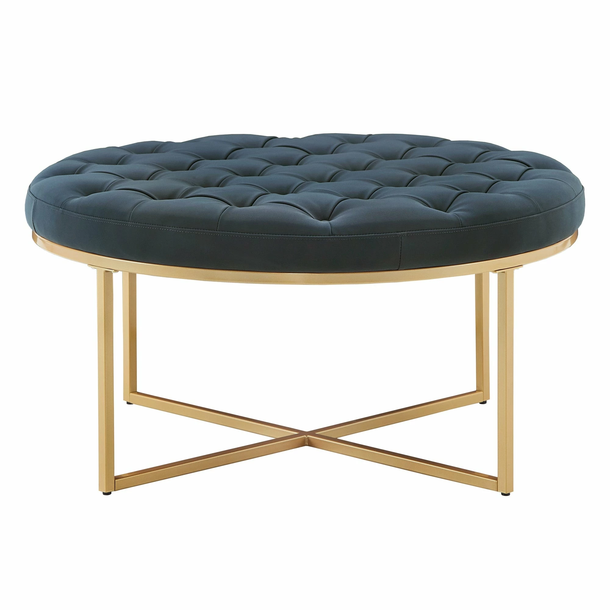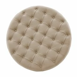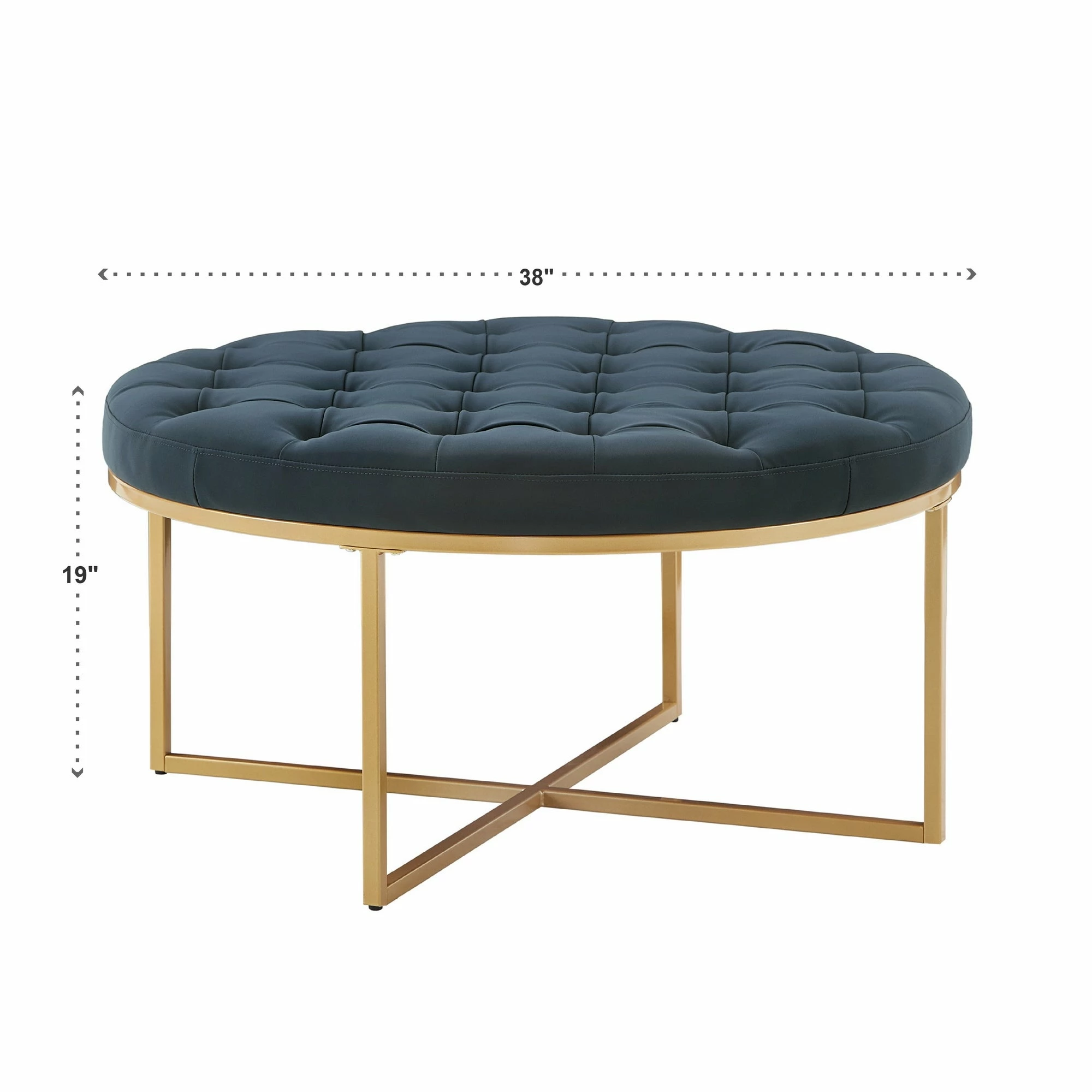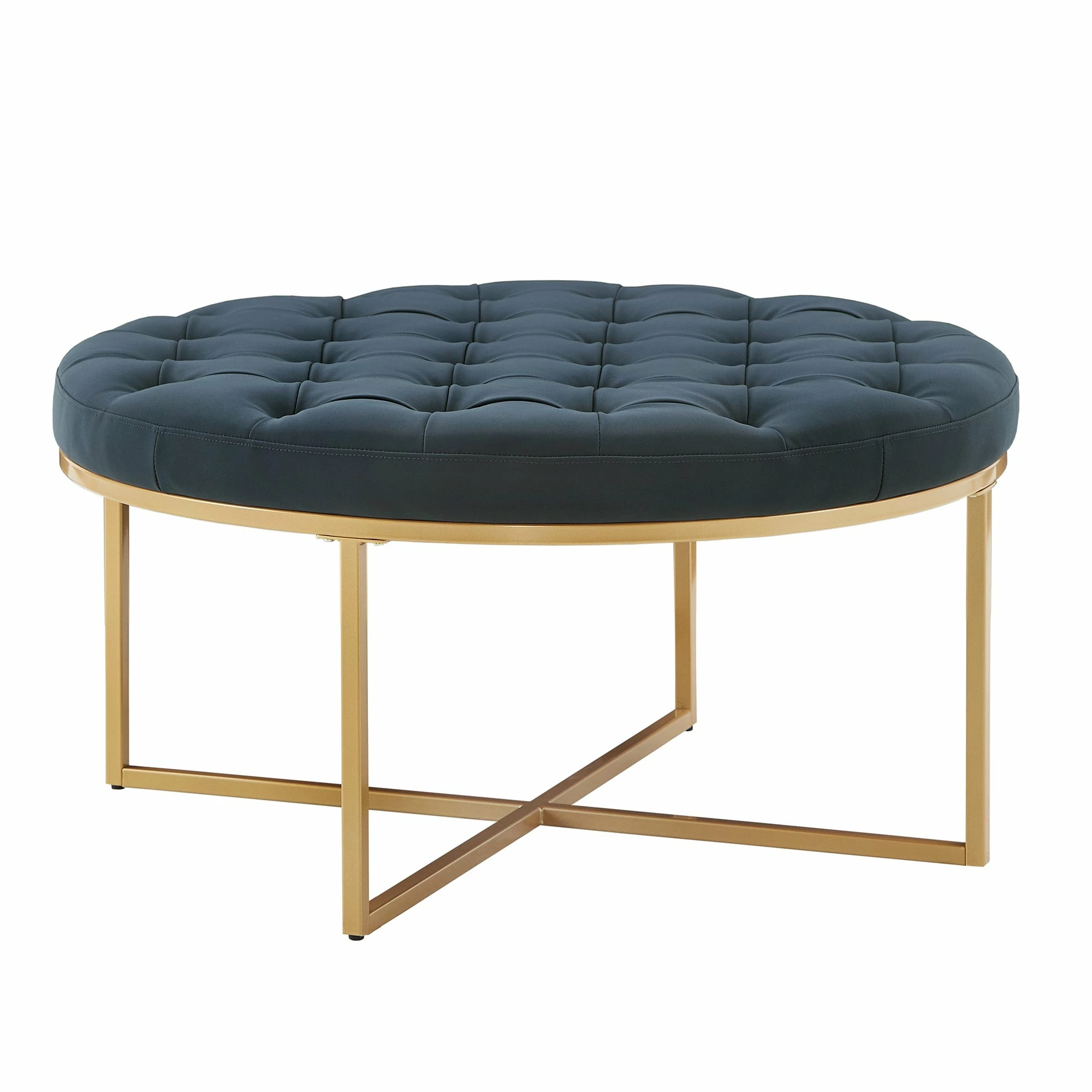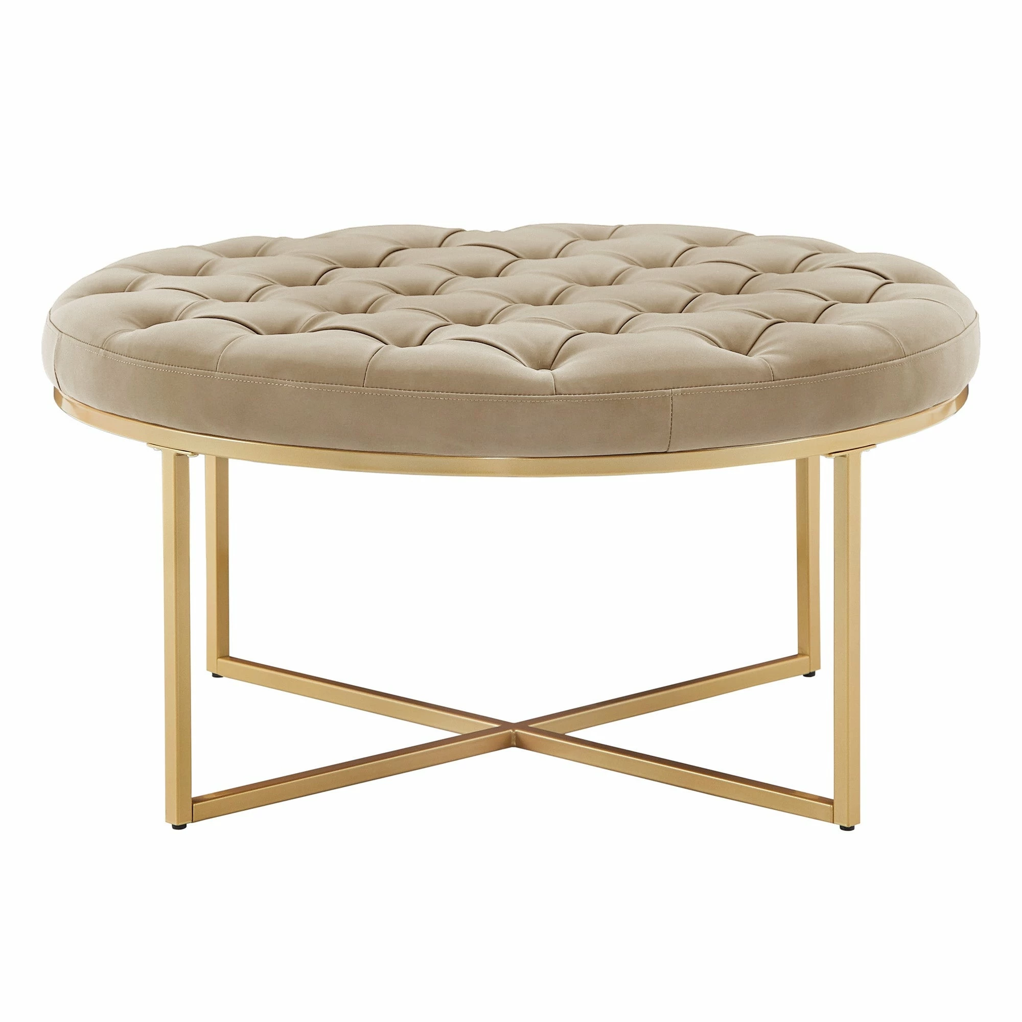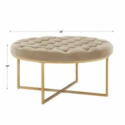 Create an upscale vibe in your home with the Devin Faux Leather Round Tufted Ottoman by iNSPIRE Q Modern. Showcasing a sleek silhouette, this contemporary piece does not sacrifice style or comfort. The cushioned top is upholstered and button tufted with supple polished faux leather with a suede feeling and a matte look, perfect for relaxation. A gold-finished metal base provides a reliable foundation and a glamorous touch.