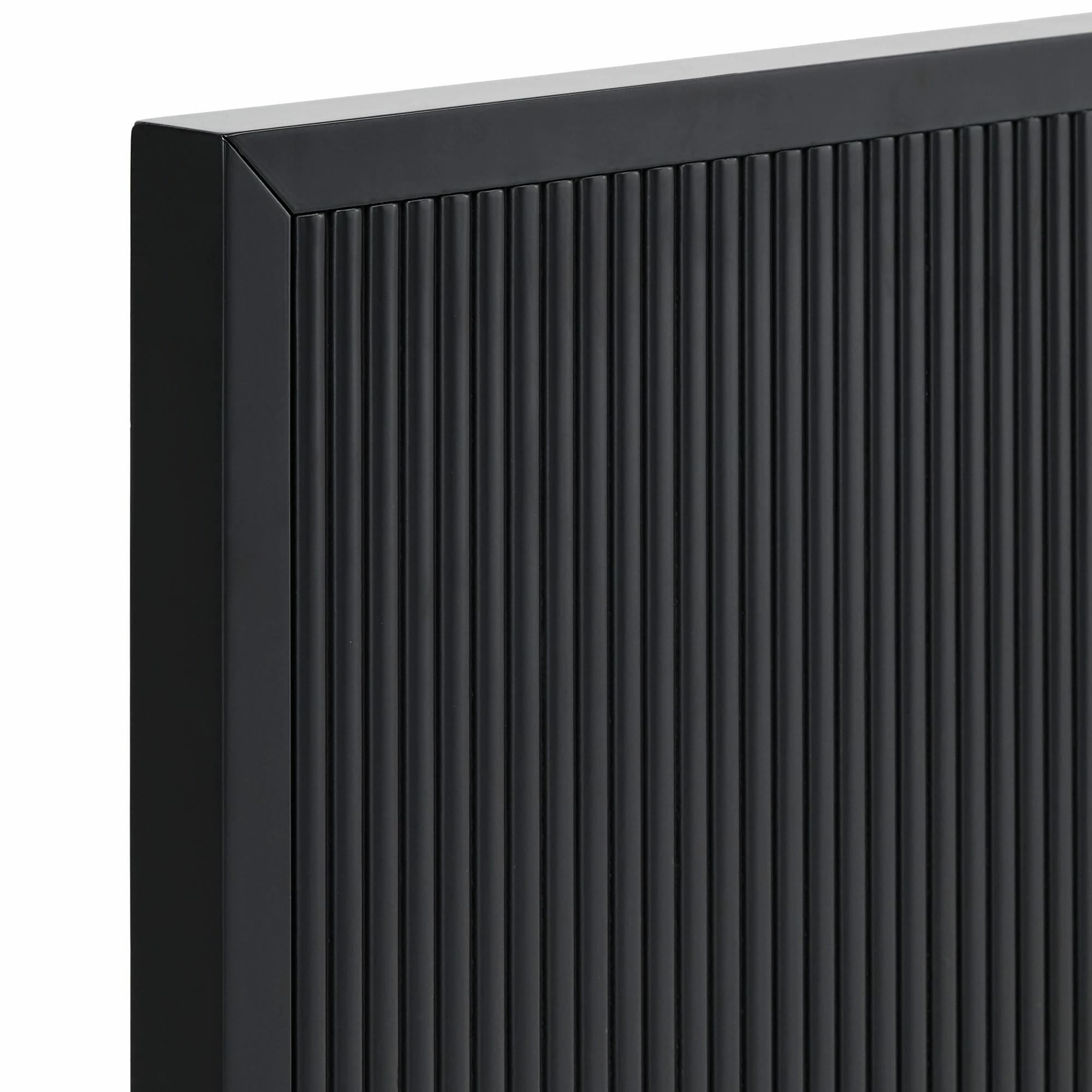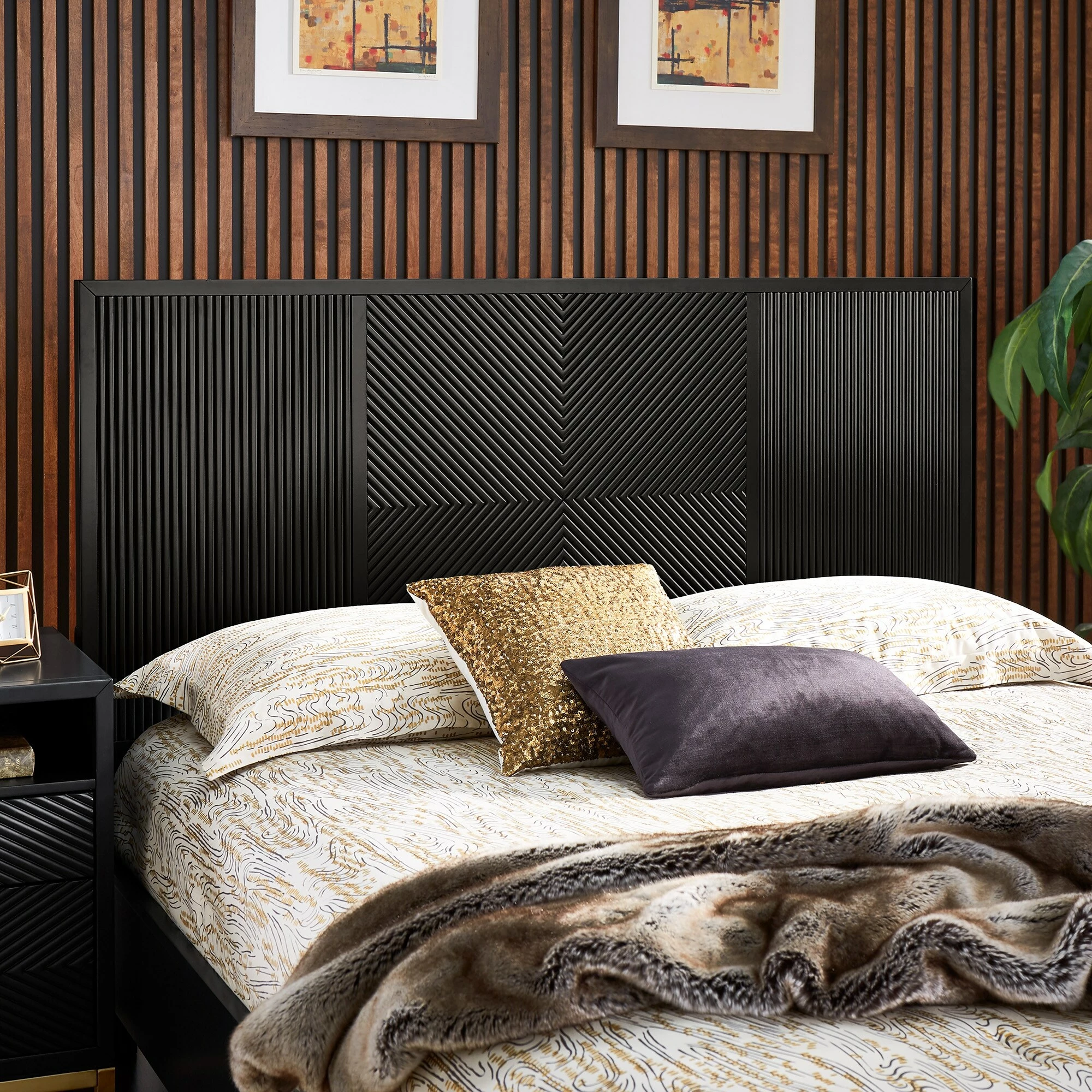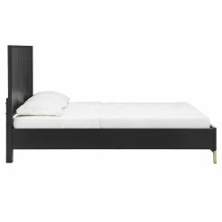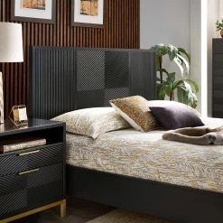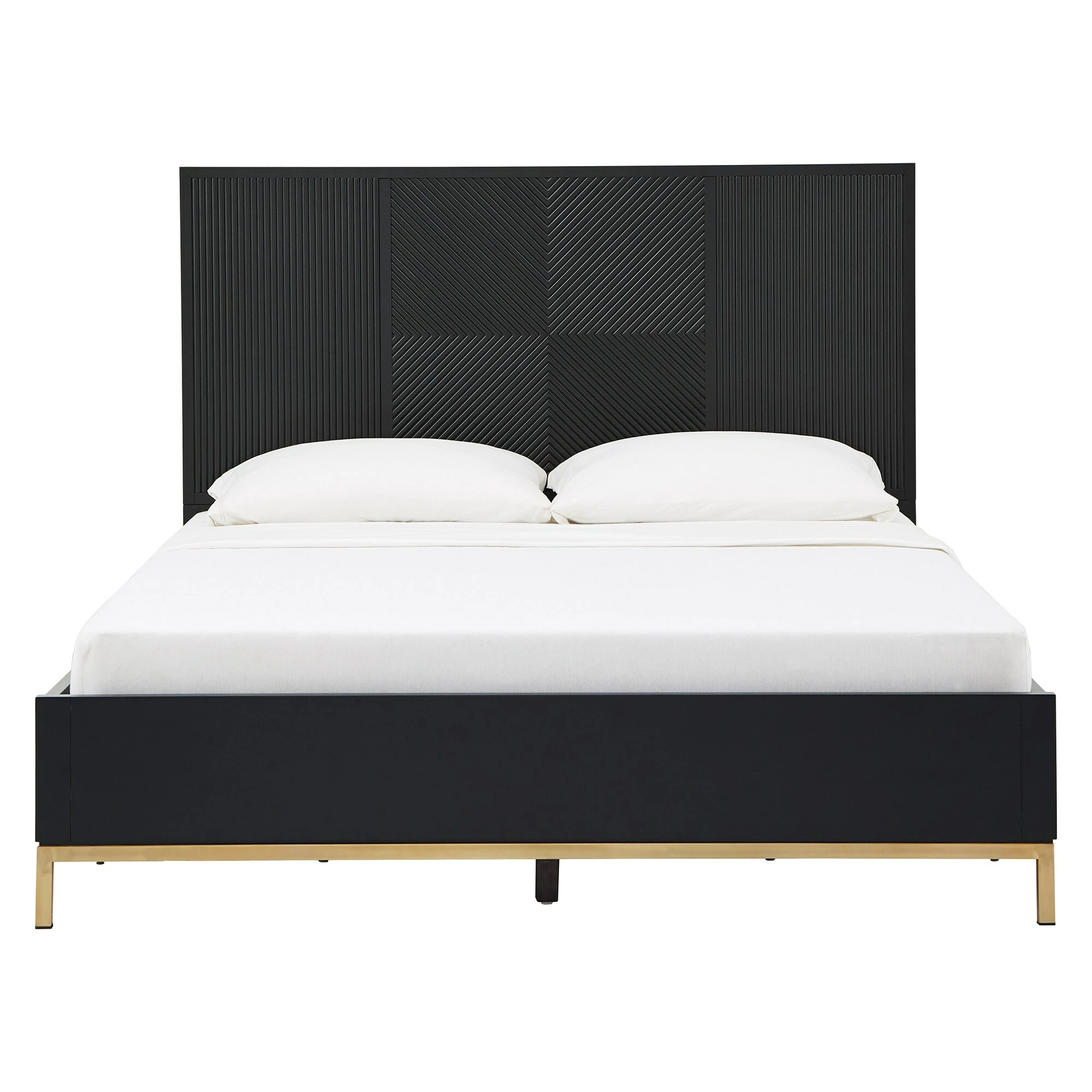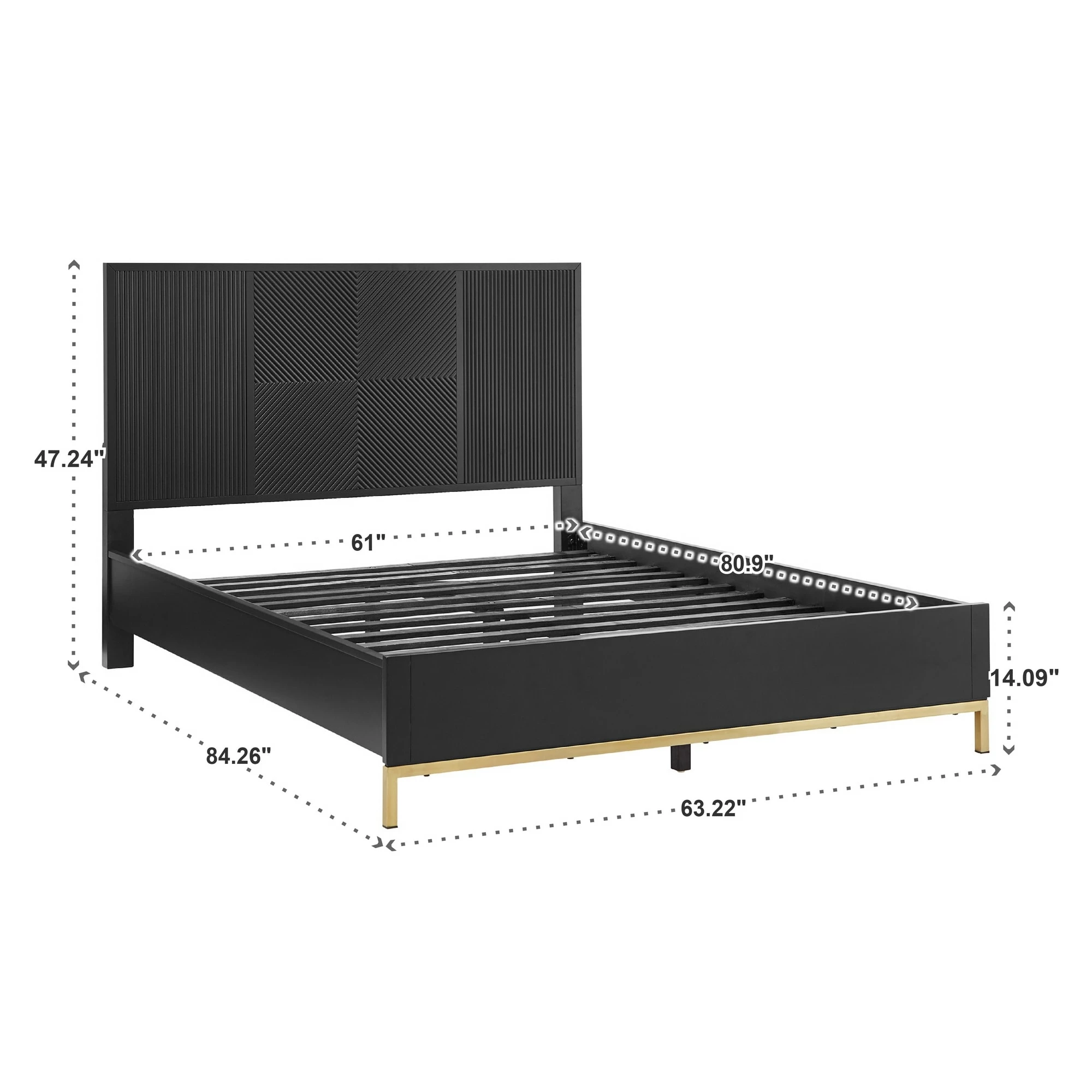 This low-profile platform bed is a gorgeous, traditional design with a modern twist. The carved chevron headboard adds texture and dimension to the bed with a black finish paired with gold metal finish legs that anchors your bedroom in understated glam style. The wood platform design saves you from having to buy a box spring or latex, foam, or spring mattress. The durable metal frame leg offers stability and support for the frame of this stunning bed. The lower bed is easier to get in and out of. This low-profile platform bed comes with everything you need for easy assembly.