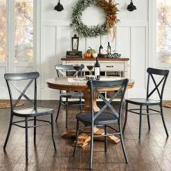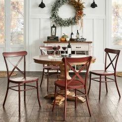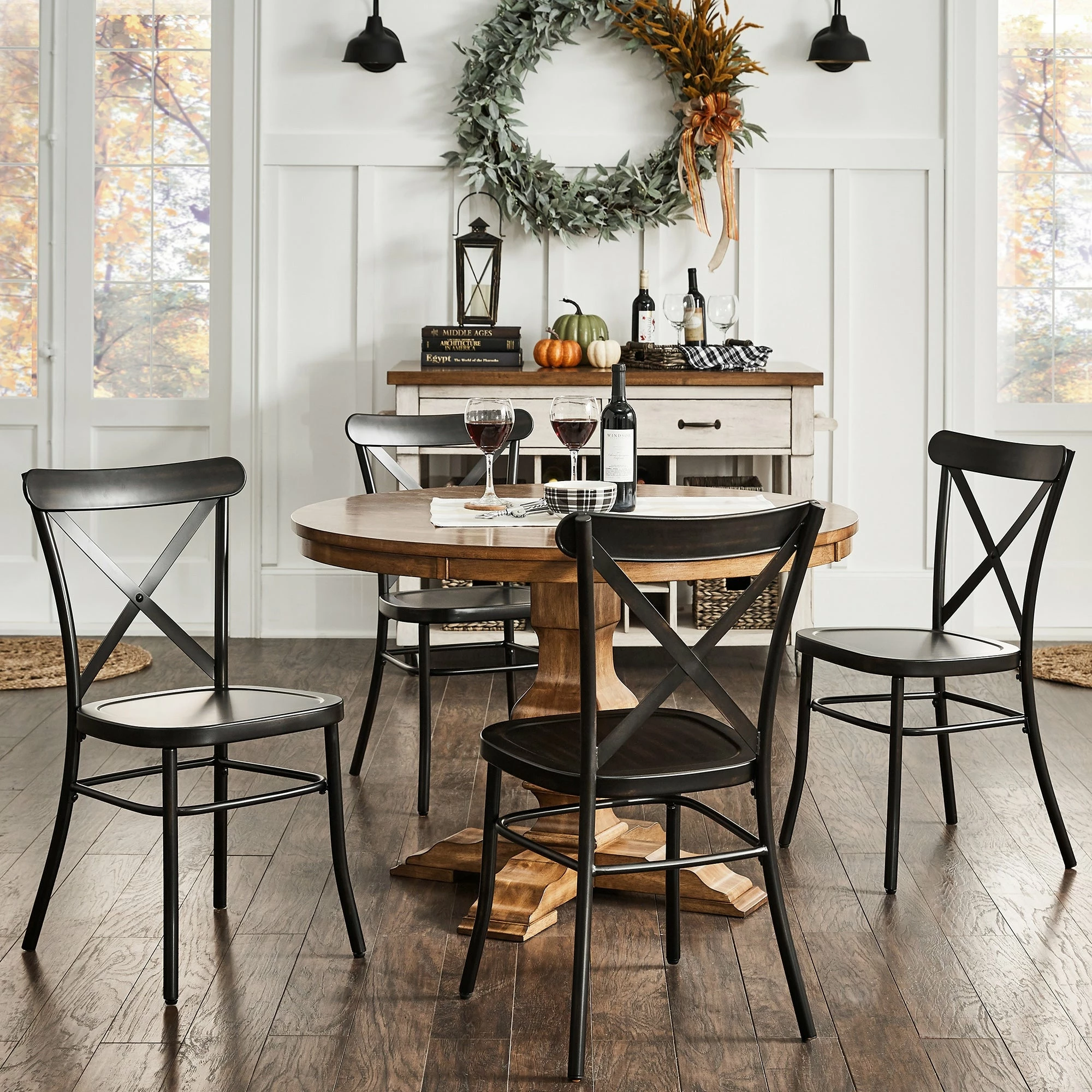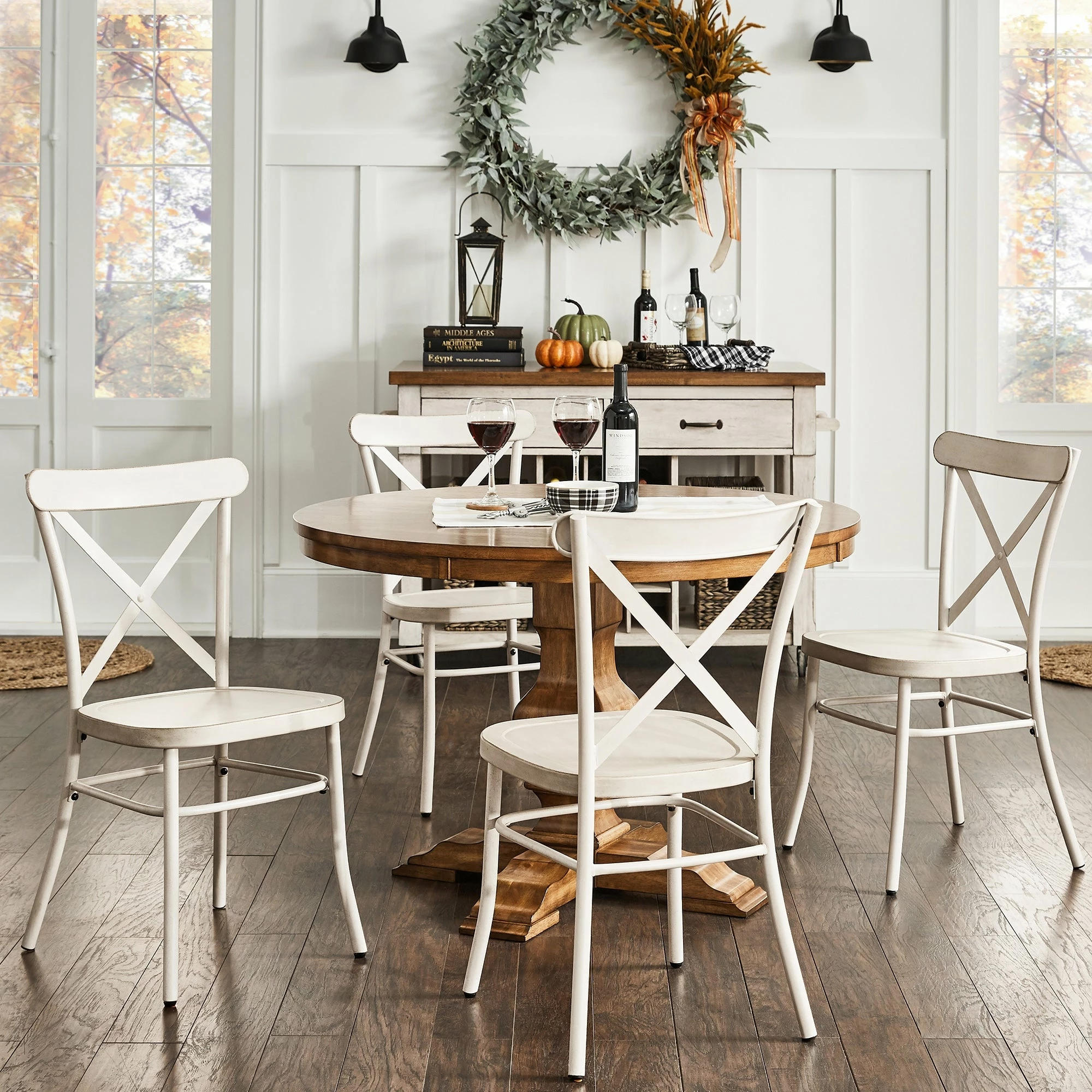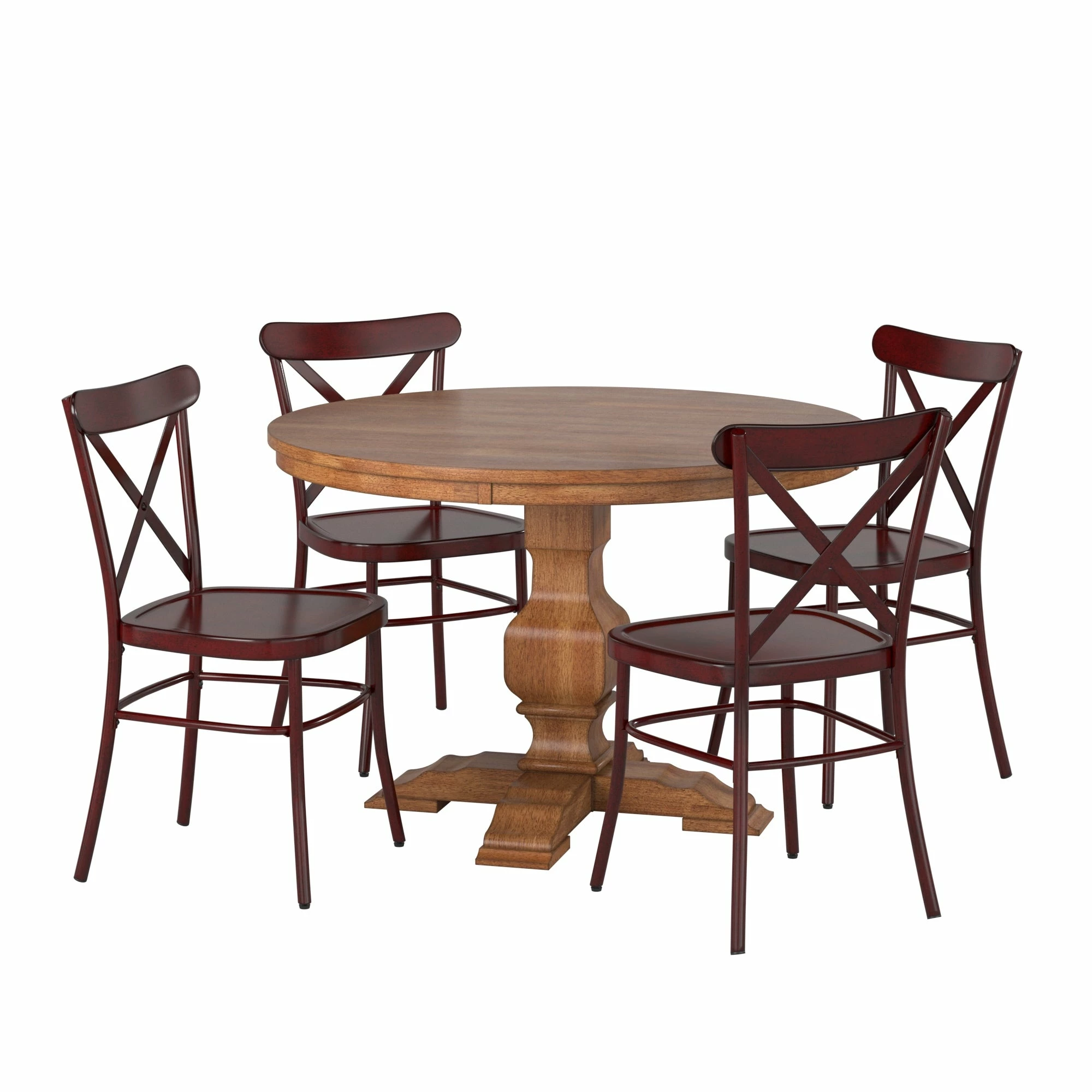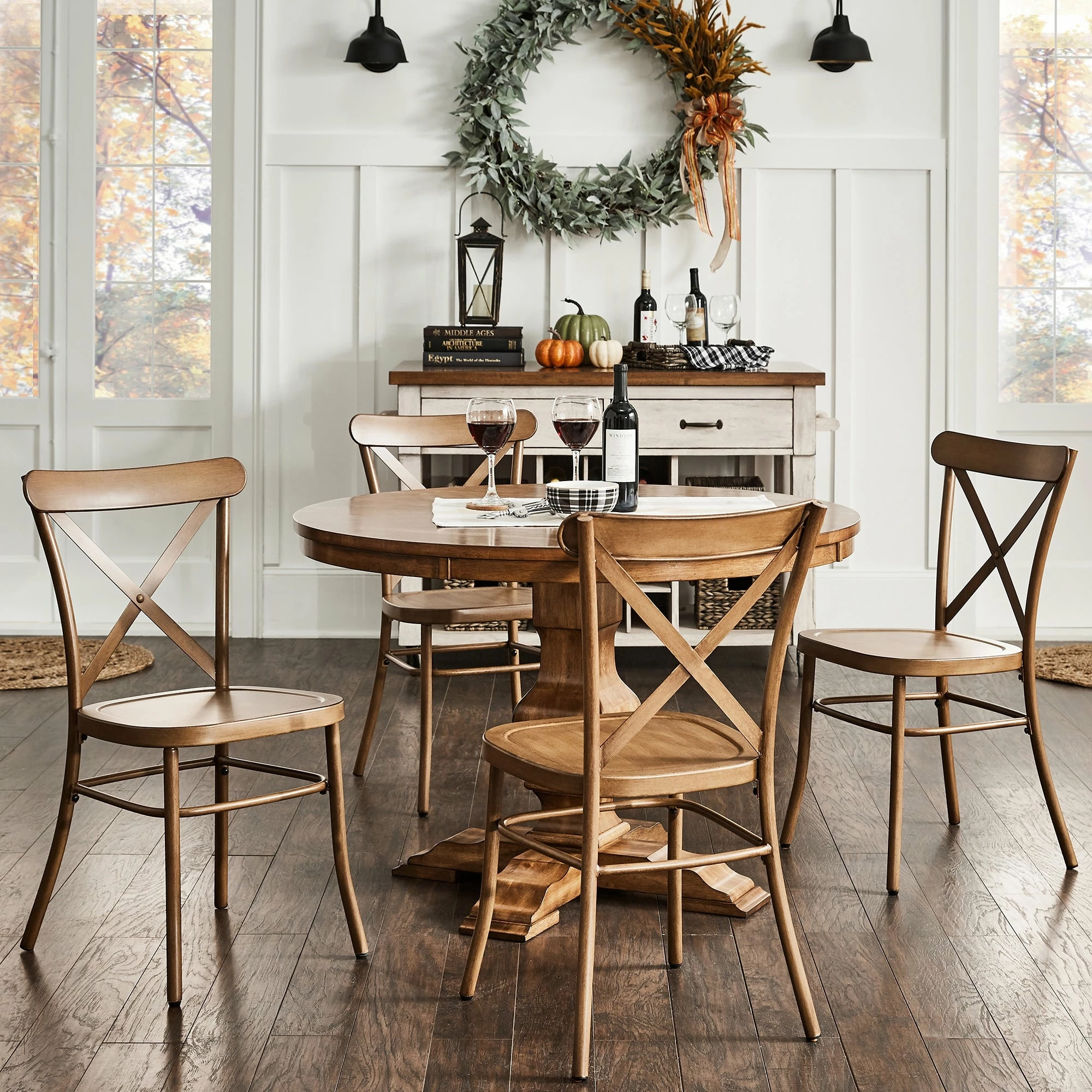 Add some countryside charms to your home with the Eleanor Oak Round Solid Wood Top 5-Piece Dining Set with X-Cross Back Chairs from iNSPIRE Q Classic. Perfectly sized for tight spaces, such as eat-in kitchens or small formal dining rooms, this simple set comes with four chairs. These chic chairs are crafted with sturdy metal and features a contoured and x-back design for support and comfort. A visible wood grain finish is on the table and sits on a beautiful, pedestal base. With its warm hues and inviting appearance, this dining set fits right in with any traditionally styled home.