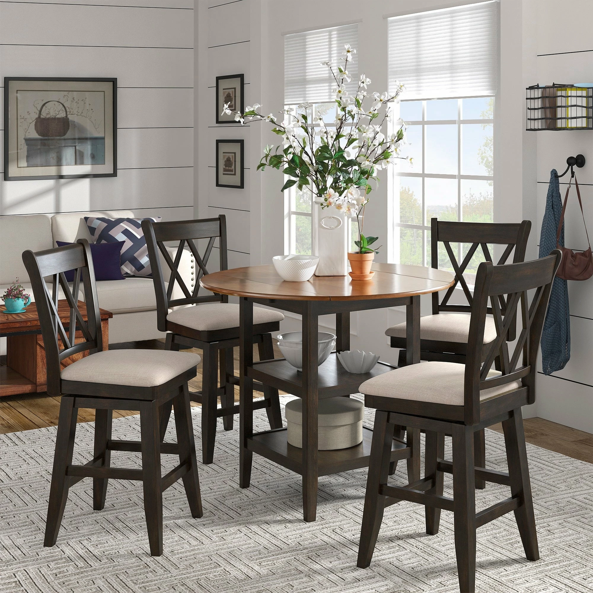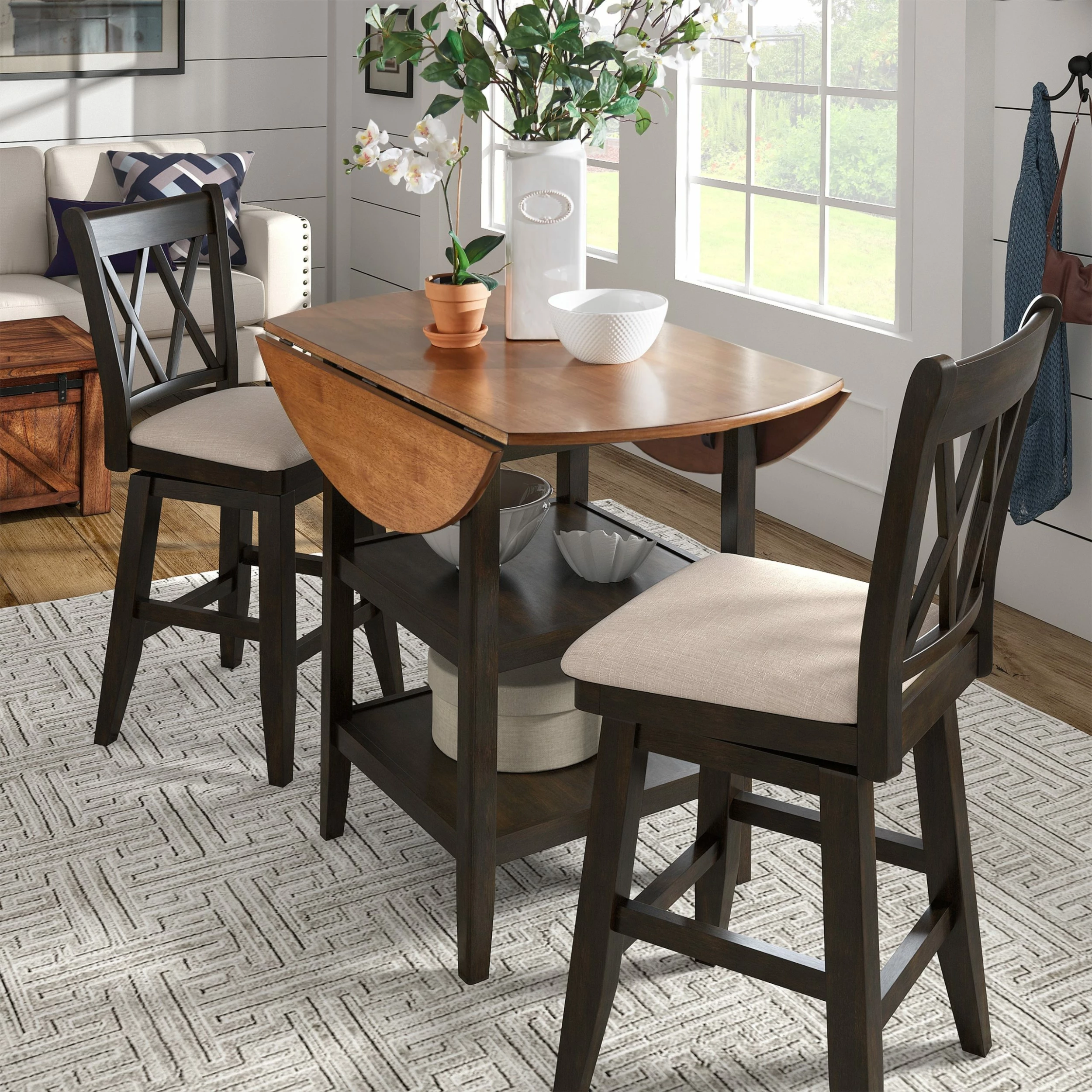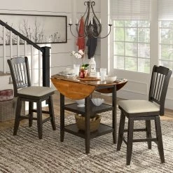 Add a beautiful, rustic look to your dining space with this Antique Finish 2 Side Drop Leaf Round Counter Height Table and Double X Back 24″H Counter Height Chairs Set from iNSPIRE Q Classic. This traditionally designed table features a pedestal style base and a natural wood grain finish, elements that will bring a lovely vintage charm into your home. The chairs’ visible wood grain and graceful X back adds a sense of antique charm to this design. Casual enough for everyday living and sophisticated enough for your formal dining room, host any occasion with style and functionality. With two drop leaf round table top, you’ll have plenty of room for all your guests, perfect for holidays and celebrations, with the added benefit of lower storage for easy access to libations. The wood grain finish table top and chairs pairs perfectly with your choice of base finish, so you can add a splash of color to your home and express your unique design taste.