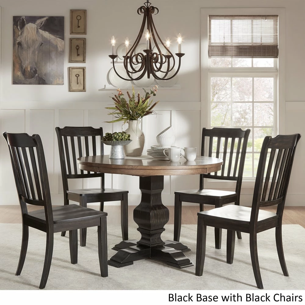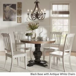 Add a beautiful, rustic look to your dining space with this round Eleanor wood dining set from iNSPIRE Q® Classic. The traditionally designed table features a pedestal style base and an antique, oak wood finish. The chair’s graceful slate back adds a sense of antique charm to this design. This round table is perfect for limited spaces, smaller formal dining rooms, or eat-in kitchens. The chairs are available in several distressed finishes, including neutrals and bright hues, so you can mix or match colors and express your unique design taste.