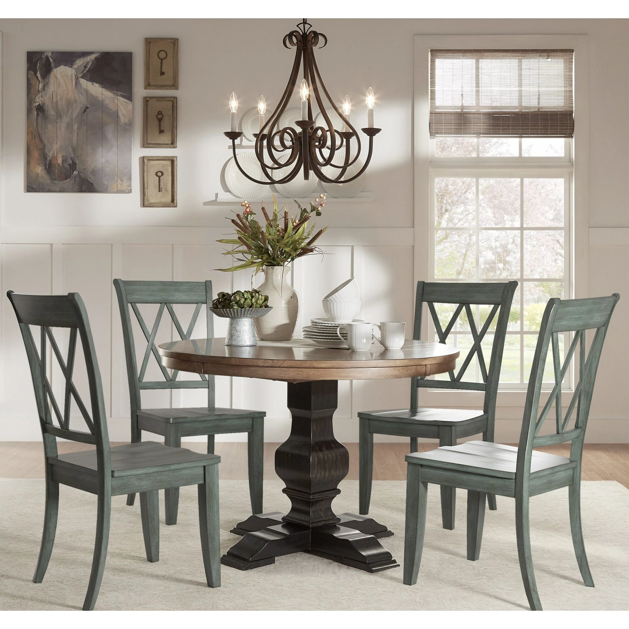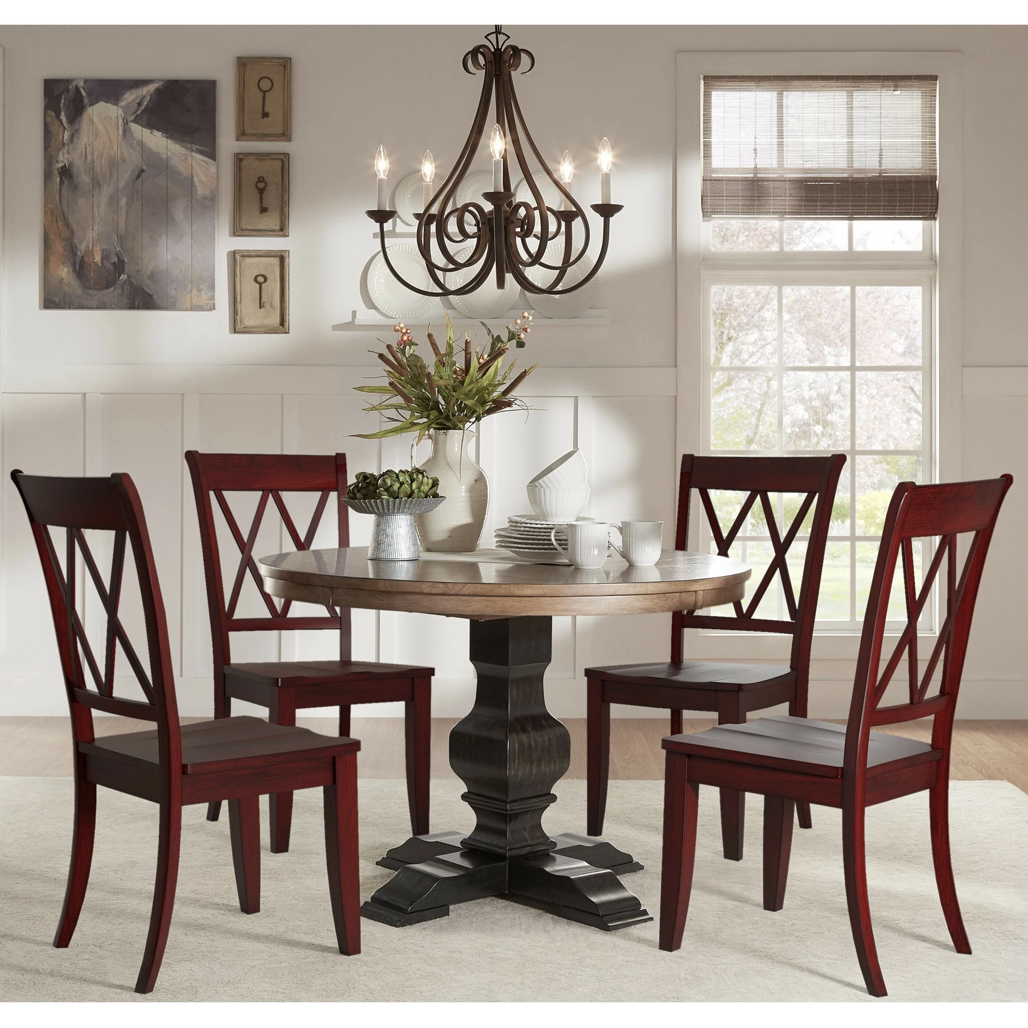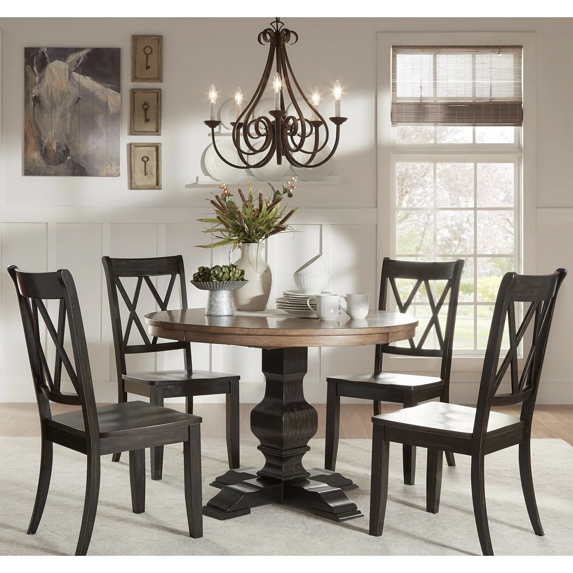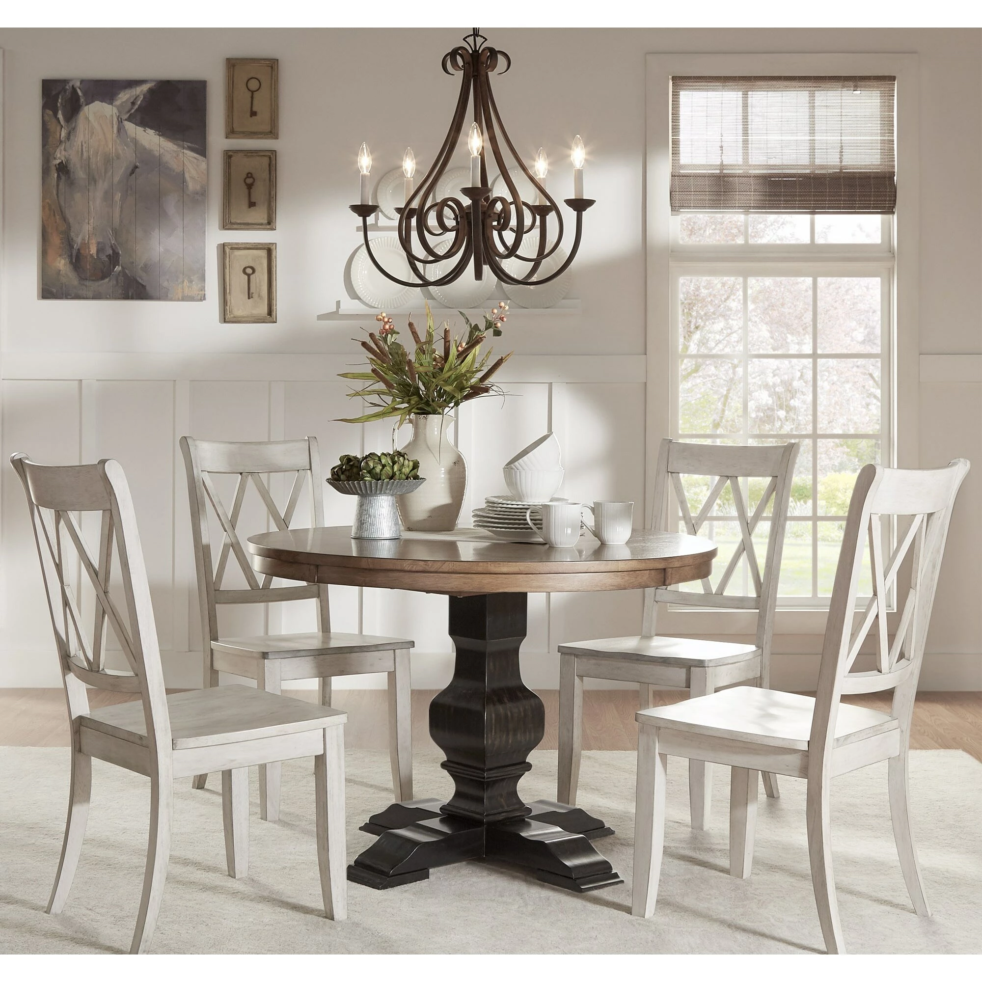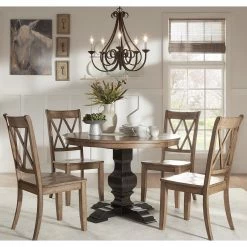 Add a beautiful, rustic look to your dining space with this round Eleanor wood dining set from iNSPIRE Q® Classic. The traditionally designed table features a pedestal style base and an antique, oak wood finish. The chair’s graceful x back adds a sense of antique charm to this design. This round table is perfect for limited spaces, smaller formal dining rooms, or eat-in kitchens. The chairs are available in several distressed finishes, including neutrals and bright hues, so you can mix or match colors and express your unique design taste.