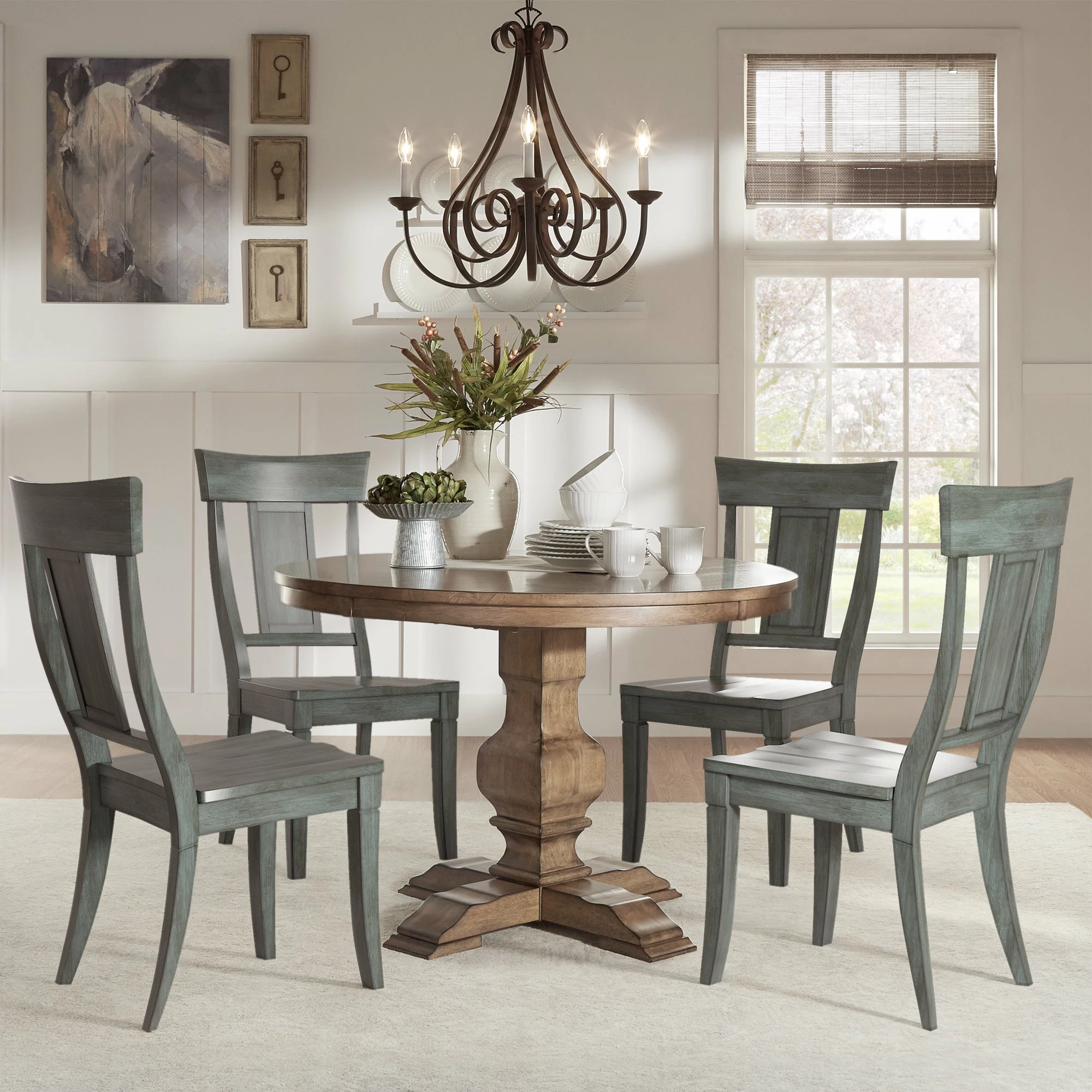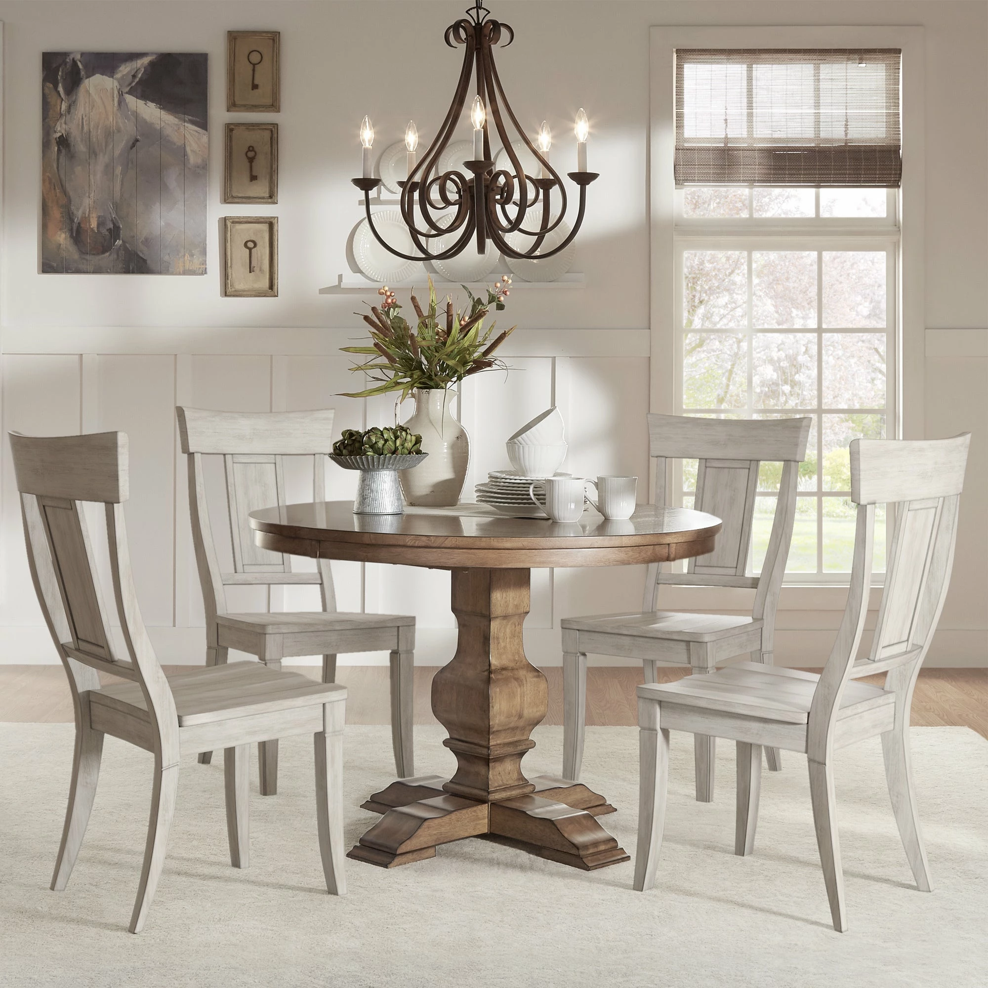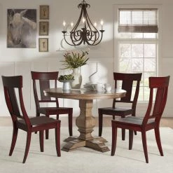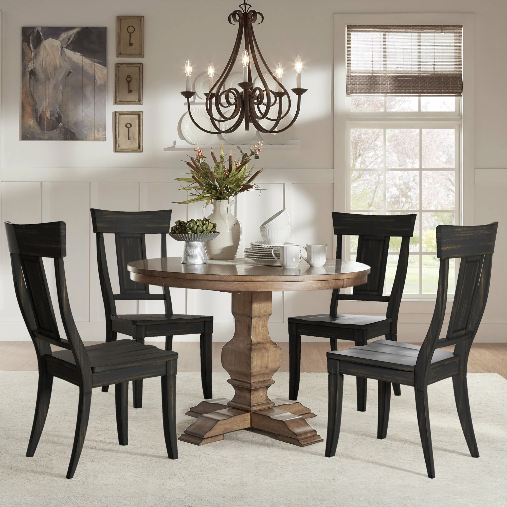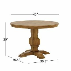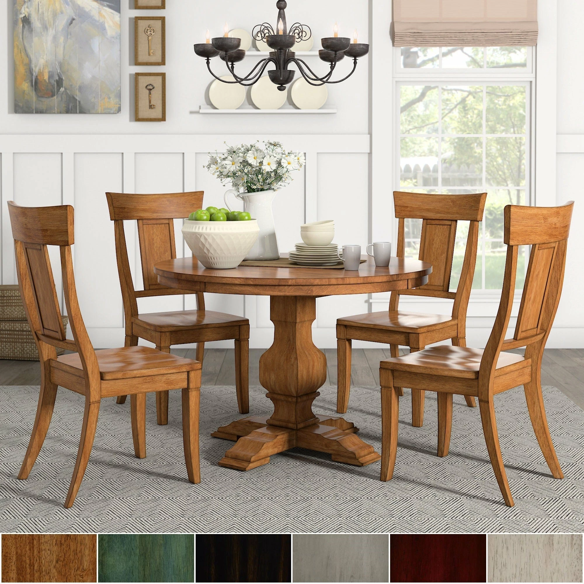 Add a beautiful, rustic look to your dining space with this round wood Eleanor dining set from iNSPIRE Q® Classic. The traditionally designed table features a pedestal style base and an antique, oak wood finish. The chair s traditional panel back adds a sense of antique charm to this design. This round table is perfect for limited spaces, smaller formal dining rooms, or eat-in kitchens. The chairs are available in several distressed finishes, including neutrals and bright hues, so you can mix or match colors and express your unique design taste.