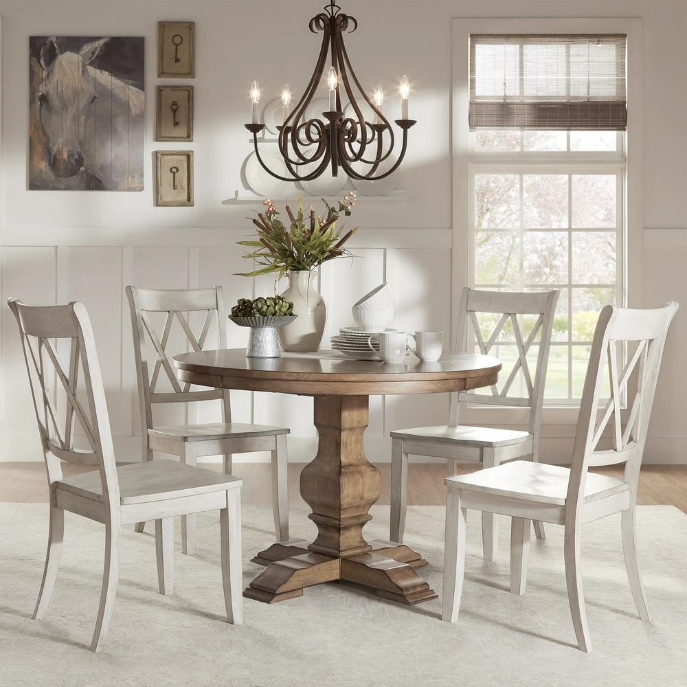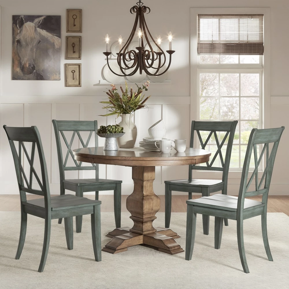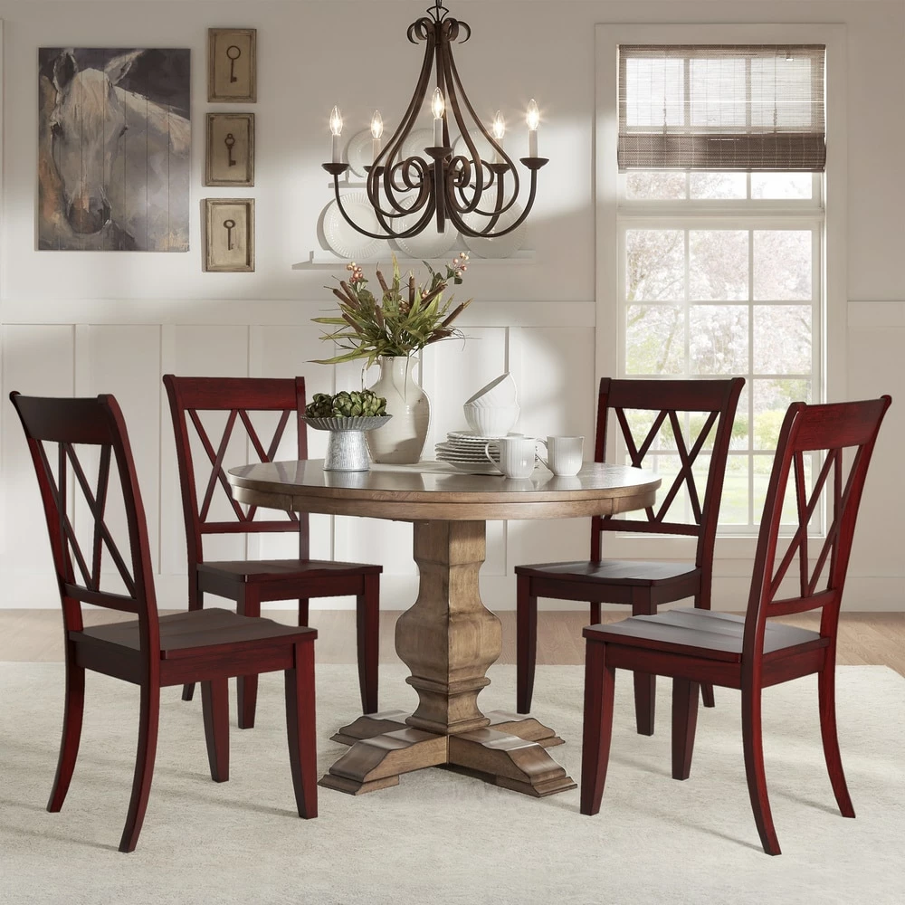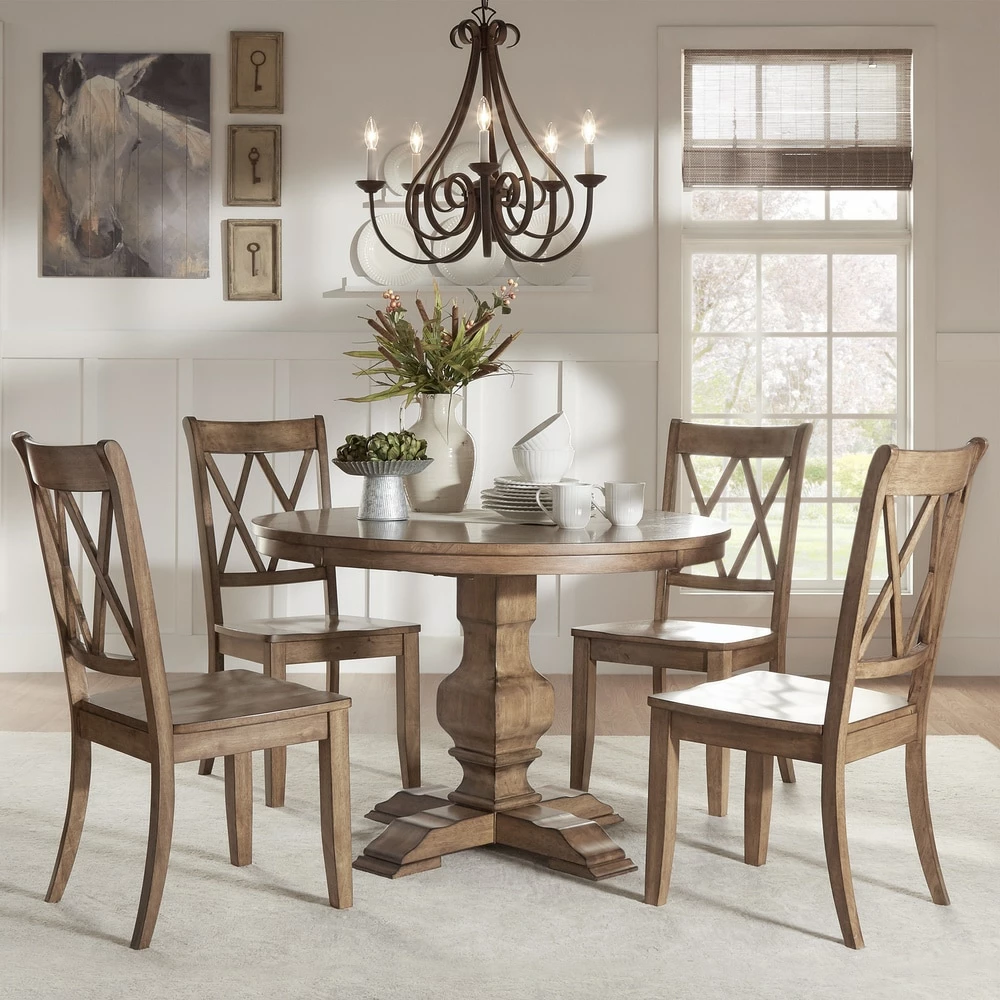 Add a beautiful, rustic look to your dining space with this round wood dining set. The traditionally designed table features a pedestal style base and an antique, oak wood finish. The chair s graceful X back adds a sense of antique charm to this design. This round table is perfect for limited spaces, smaller formal dining rooms, or eat-in kitchens. The chairs are available in several distressed finishes, including neutrals and bright hues, so you can mix or match colors and express your unique design taste.