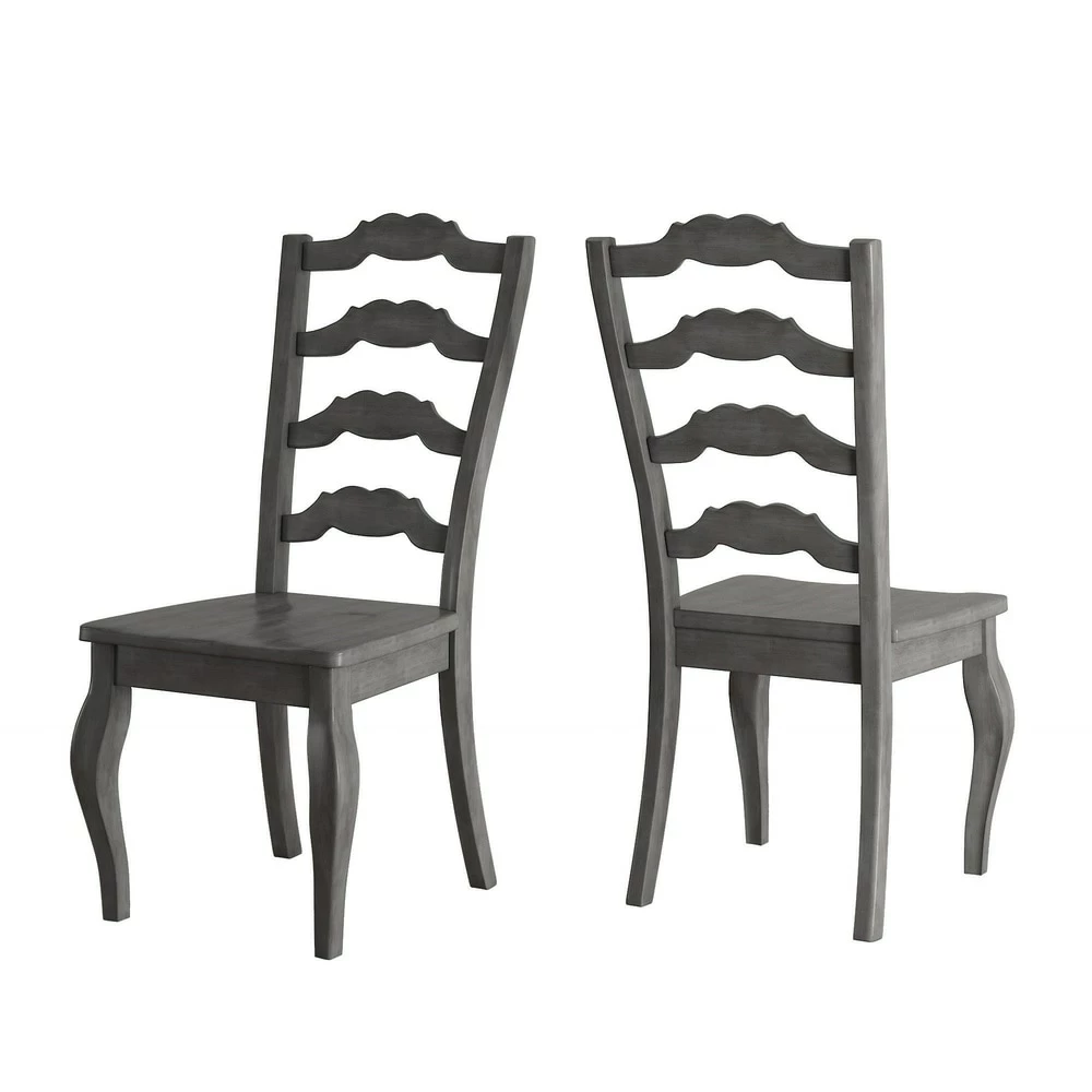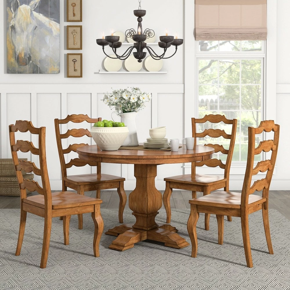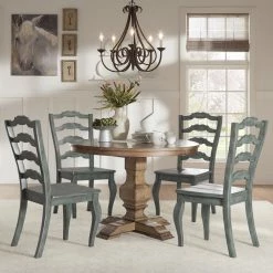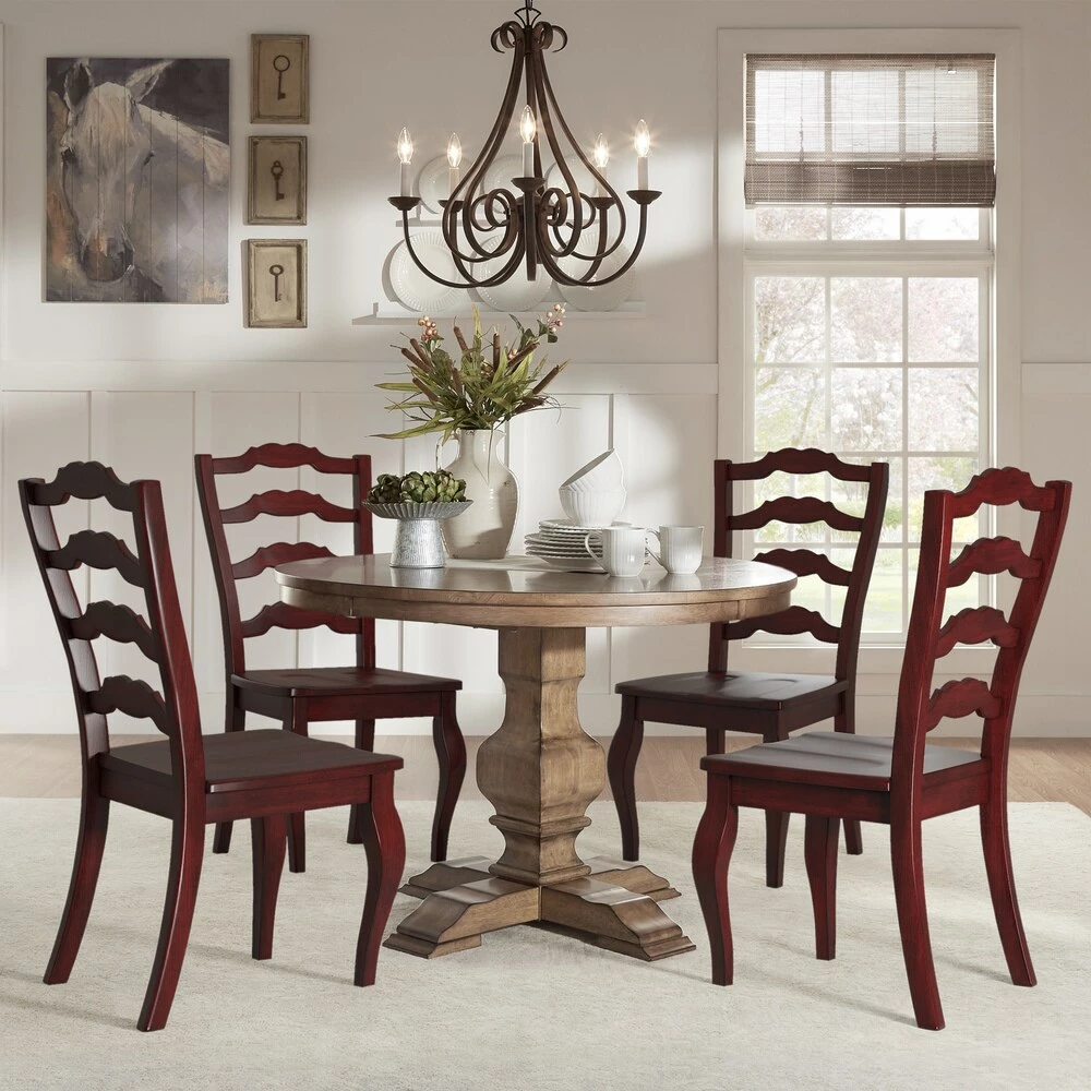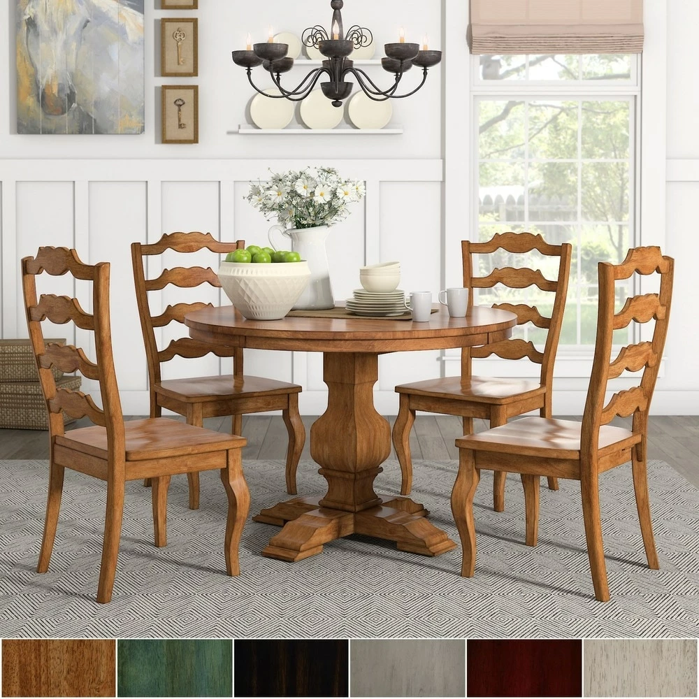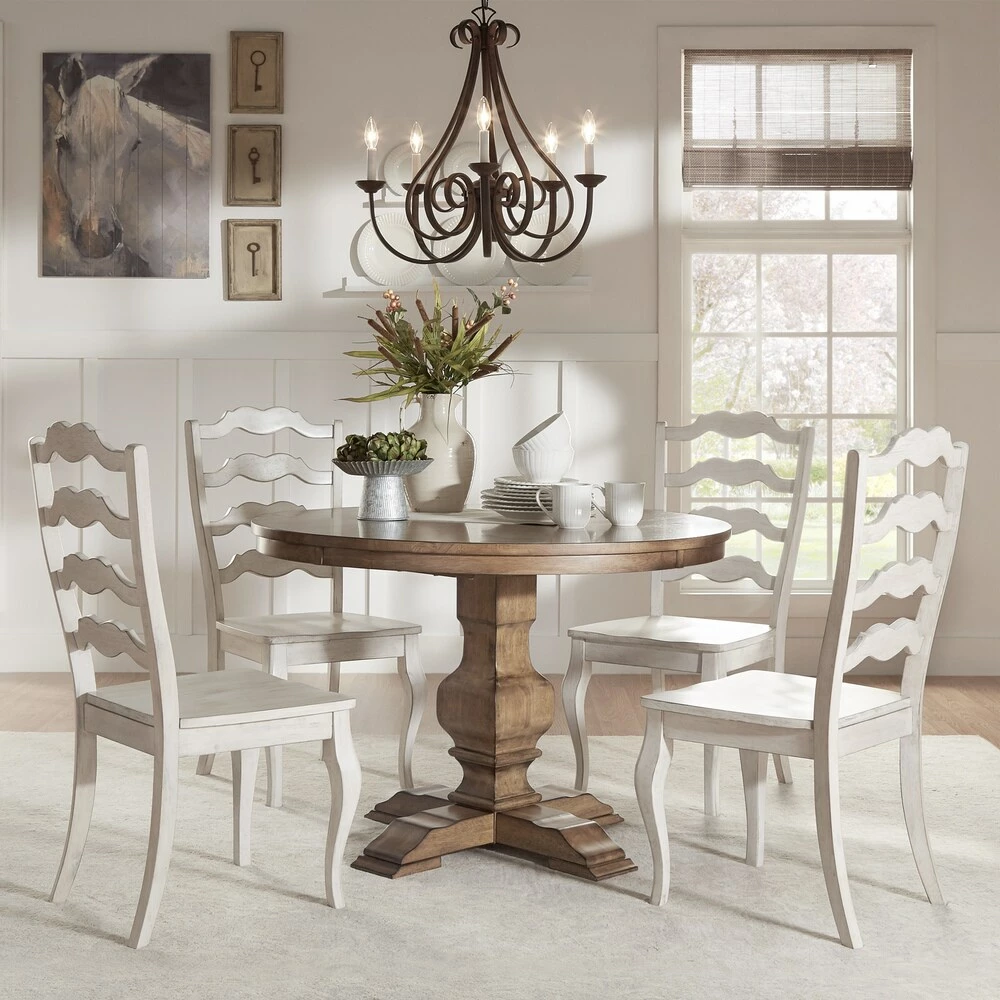 Add a beautiful, rustic look to your dining space with this round Elanor wood dining set from iNSPIRE Q® Classic. The traditionally designed table features a pedestal style base and an antique, oak wood finish. The chairs’ graceful French ladder back adds a sense of antique charm to this design. This round table is perfect for limited spaces, smaller formal dining rooms, or eat-in kitchens. The chairs are available in several distressed finishes, including neutrals and bright hues, so you can mix or match colors and express your unique design taste.
