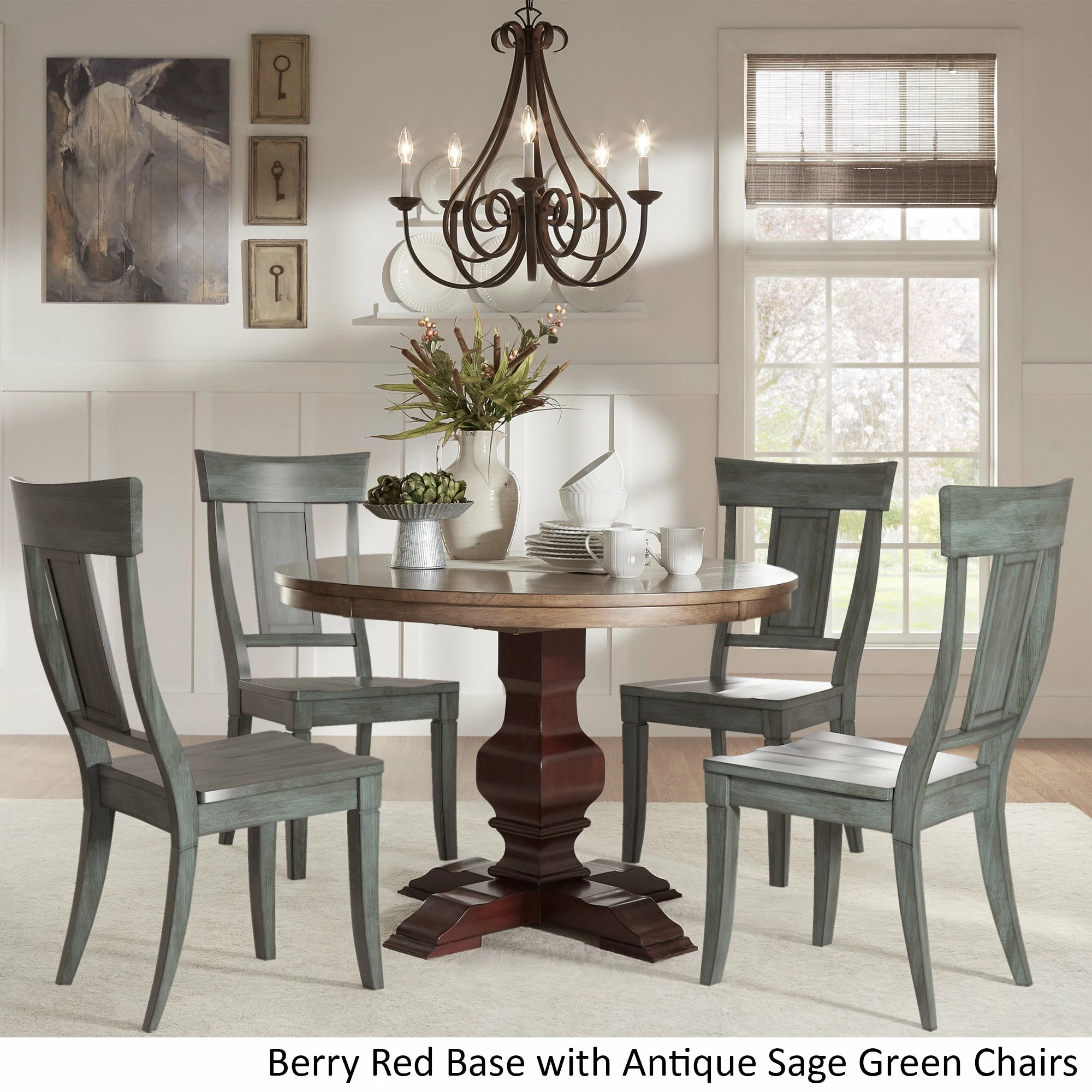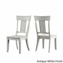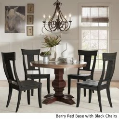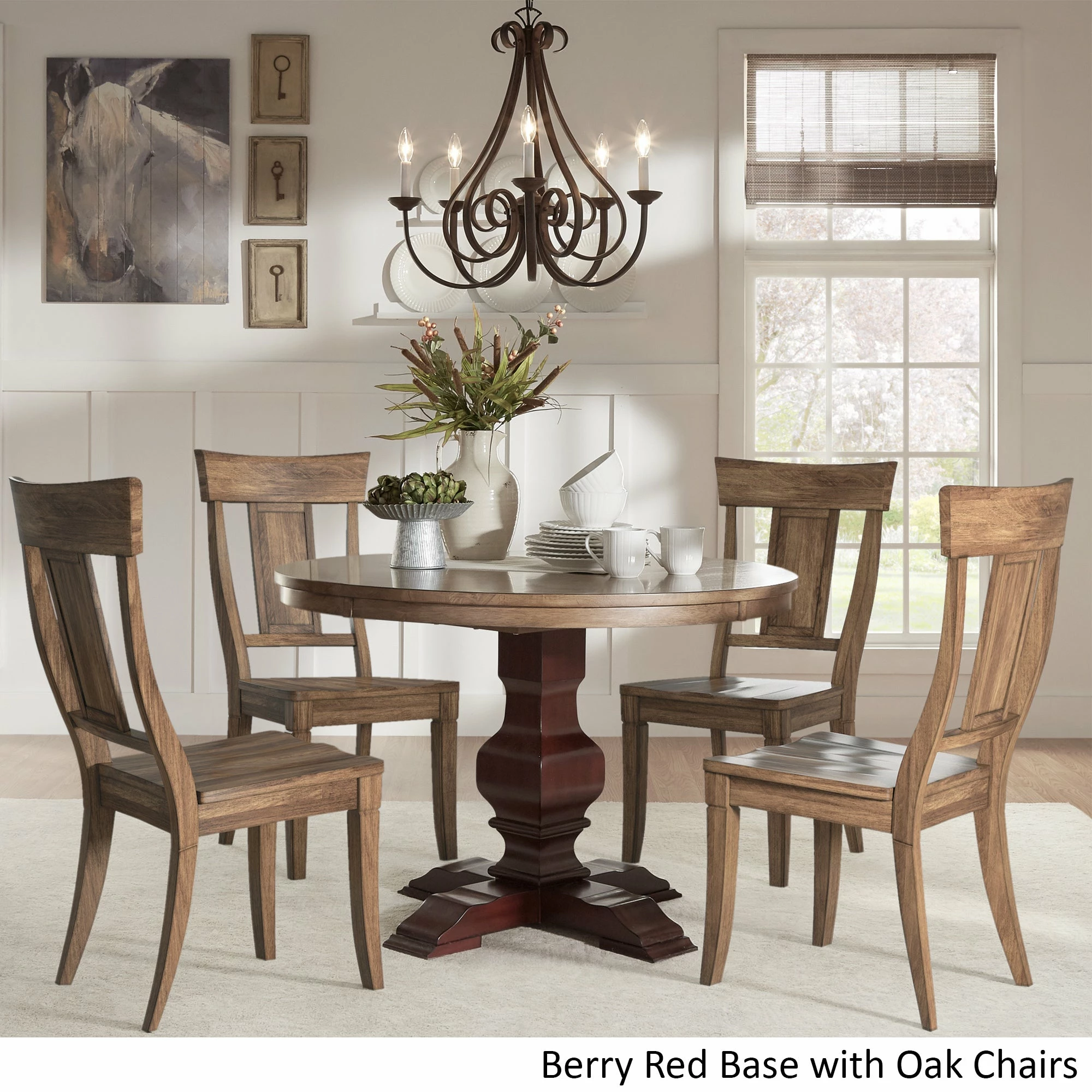 Add a beautiful, rustic look to your dining space with this round Eleanor wood dining set from iNSPIRE Q® Classic. The traditionally designed table features a pedestal style base and an antique, oak wood finish. The chair’s graceful panel back adds a sense of antique charm to this design. This round table is perfect for limited spaces, smaller formal dining rooms, or eat-in kitchens. The chairs are available in several distressed finishes, including neutrals and bright hues, so you can mix or match colors and express your unique design taste.