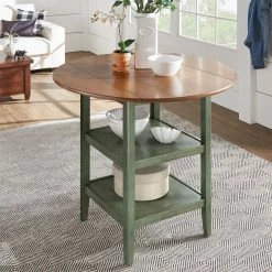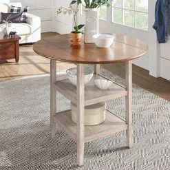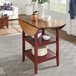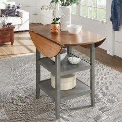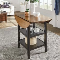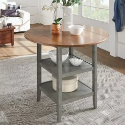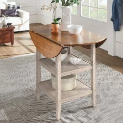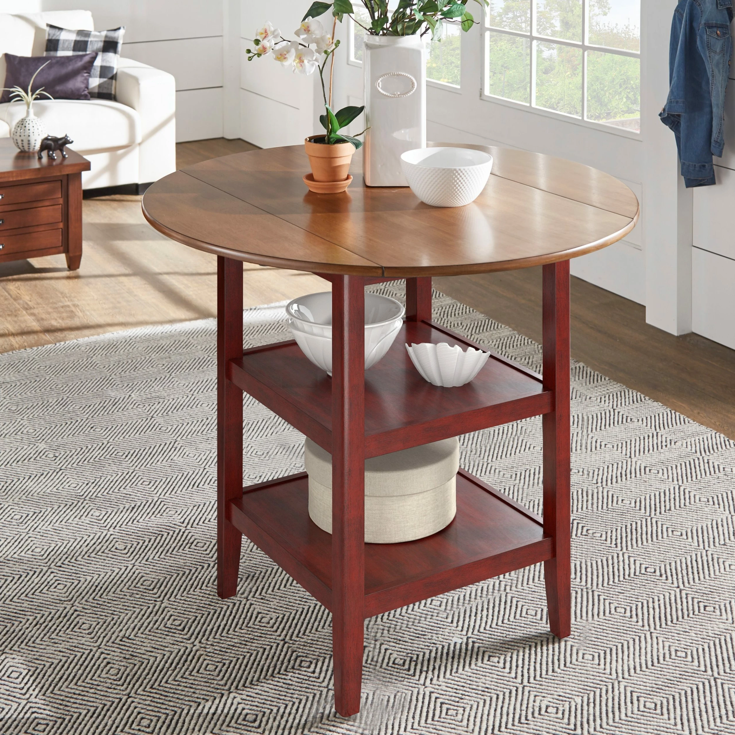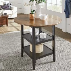 This traditionally designed table features a pedestal style base and a natural wood grain finish, elements that will bring a lovely vintage charm into your home. Casual enough for everyday living and sophisticated enough for your formal dining room, host any occasion with style and functionality. With two drop leaf round table top, you’ll have plenty of room for all your guests, perfect for holidays and celebrations, with the added benefit of lower storage for easy access to libations. The wood grain finish table top pairs perfectly with existing color schemes and décor.