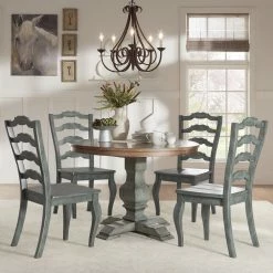 Add a beautiful, rustic look to your dining space with this round wood Eleanor dining set from iNSPIRE Q® Classic. The traditionally designed table features an antique sage green pedestal style base and an antique, oak wood finish top. The chairs graceful French ladder back adds a sense of antique charm to this design. This round table is perfect for limited spaces, smaller formal dining rooms, or eat-in kitchens. The chairs are available in several distressed finishes, including neutrals and bright hues, so you can mix or match colors and express your unique design taste.