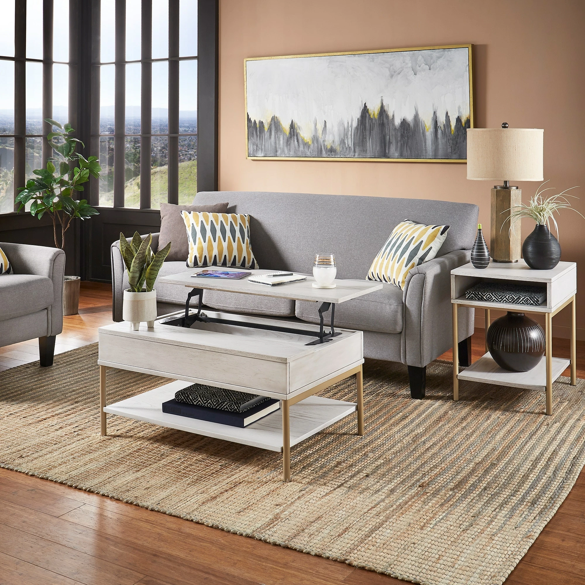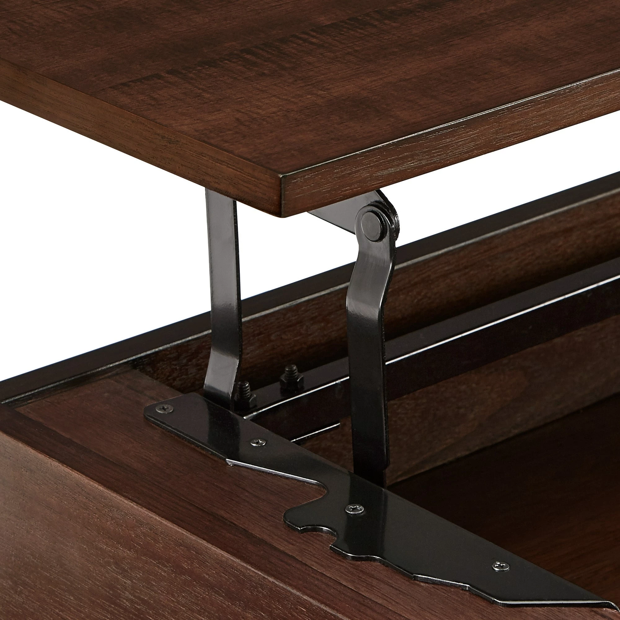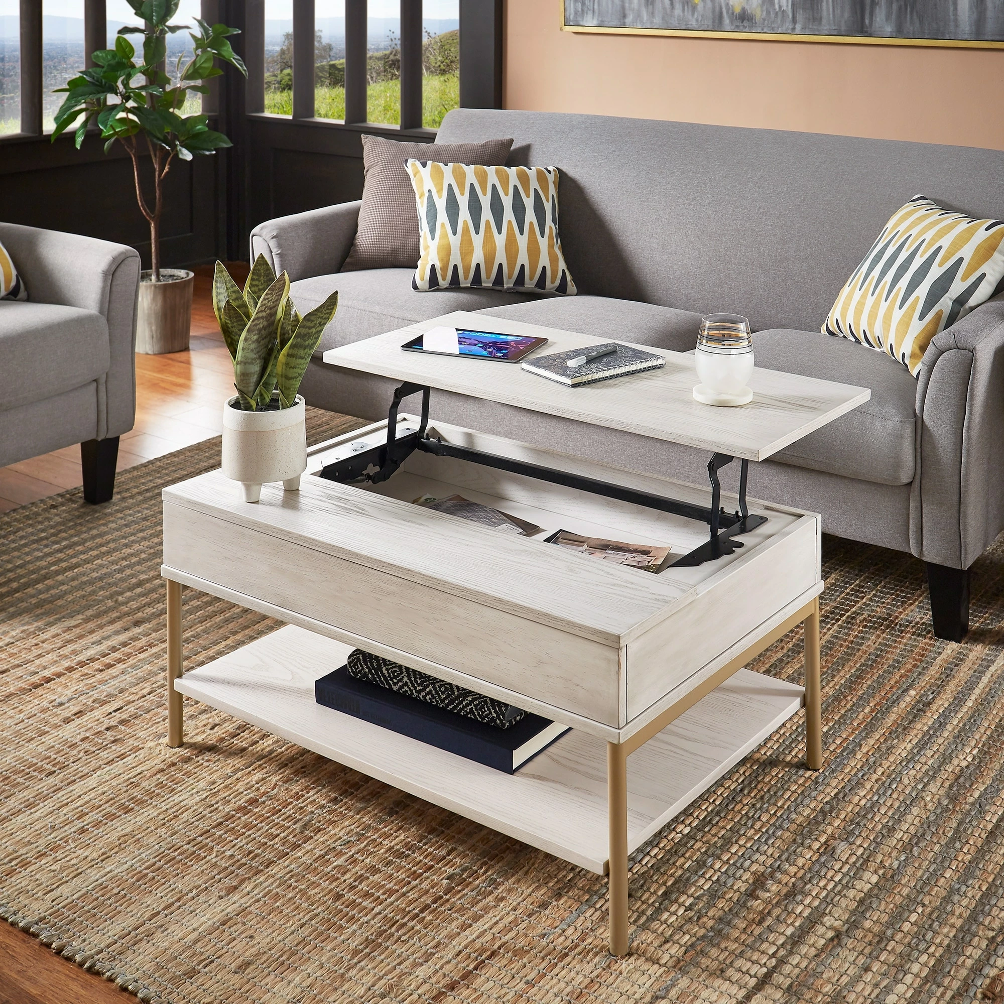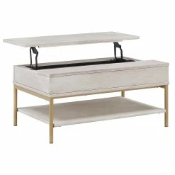 - Coffee table features lift-top mechanism for extra storage and working space
